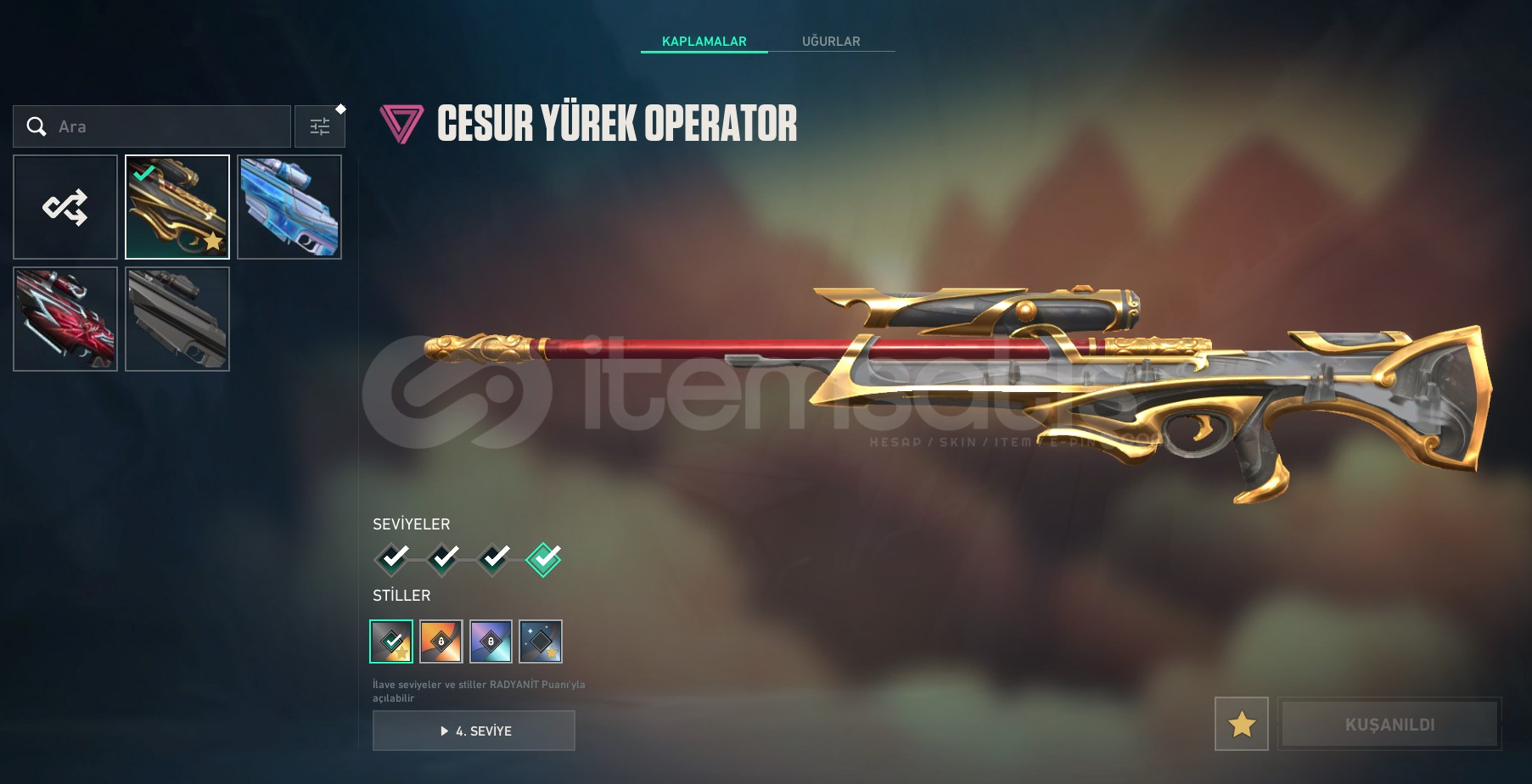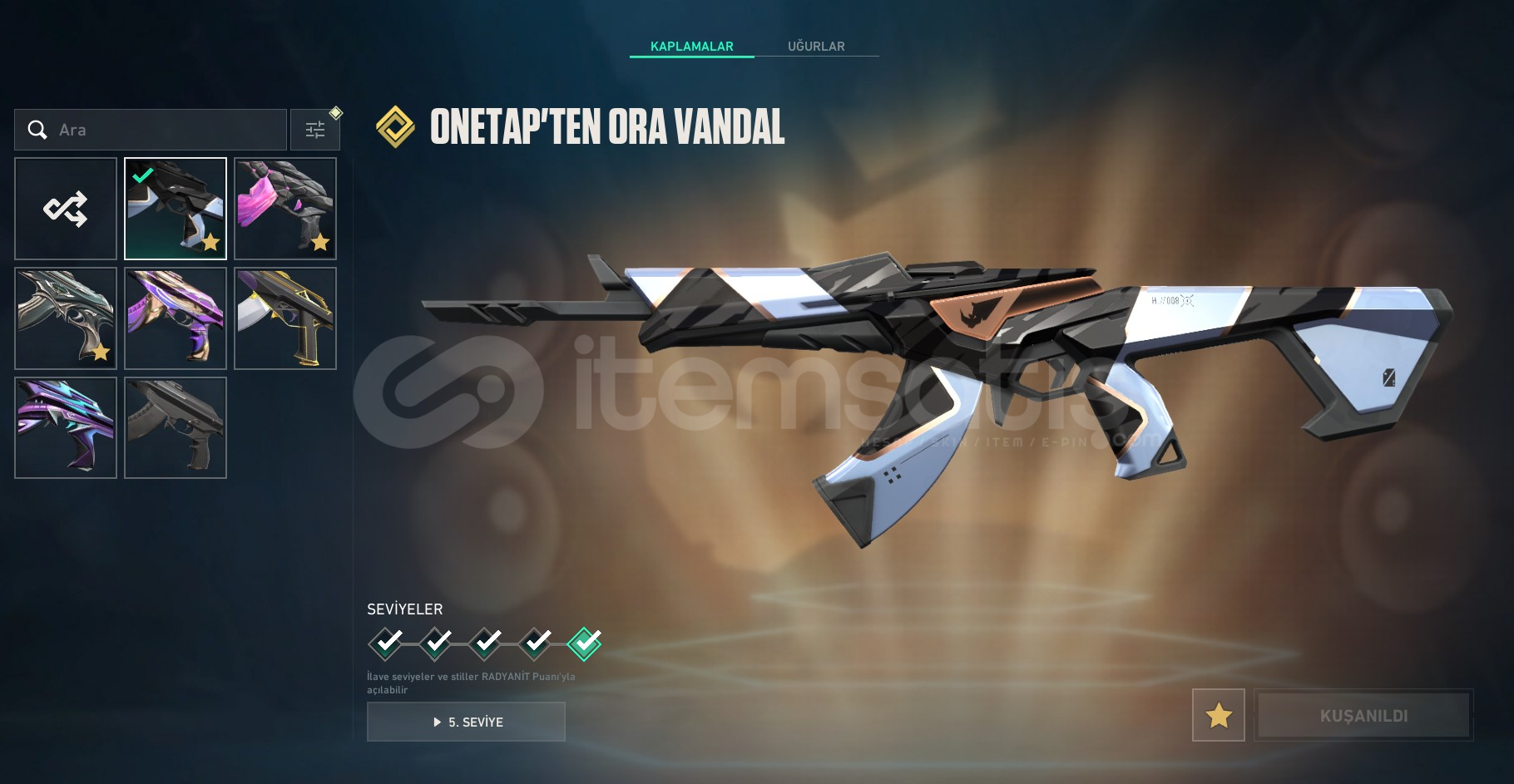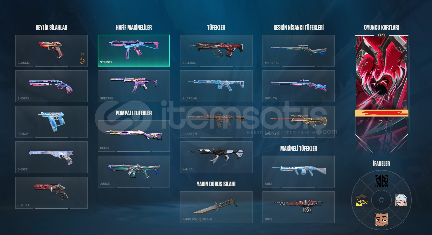 Hesap içeriğinde bulunan desenler :Uzaylı Avcısı bıçakOnetapten Ora vandalAsil vandalDolmir vandalYitik vandalÖzel harekat phantomCesur Yürek OperatorÇAPRAŞIK ALEMLER GHOSTBu desenler dışında fotoğraflarda bulunan battlepass skinleri mevcuttur. Onetap seven kardeşlerimize giden bir hesaptır.Aktif rankı gold 3'türTR sunucu