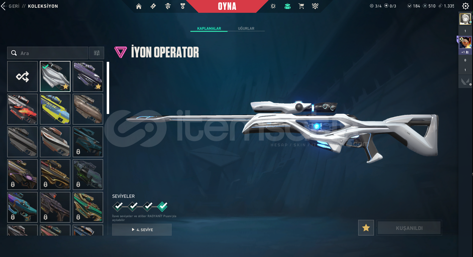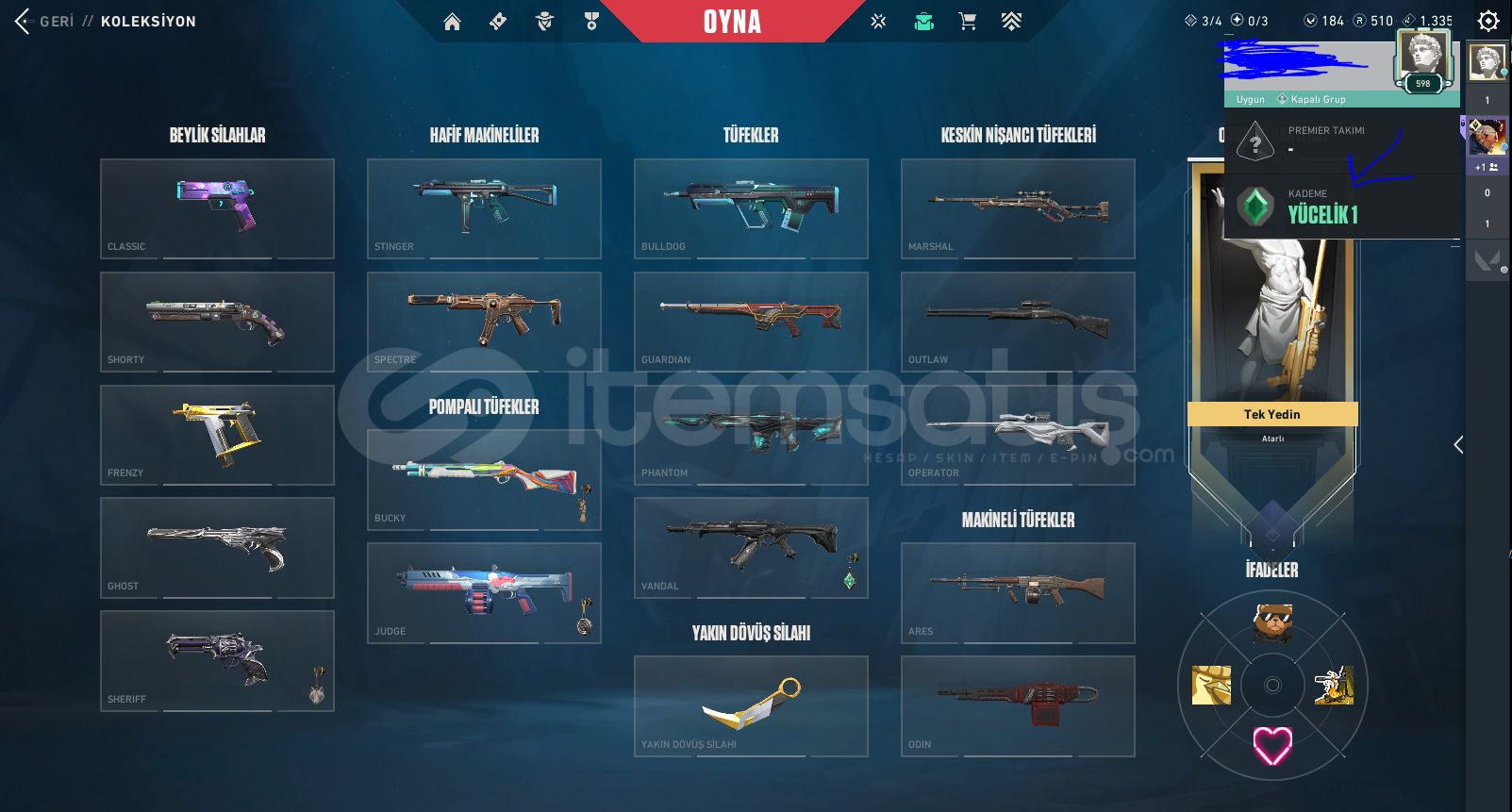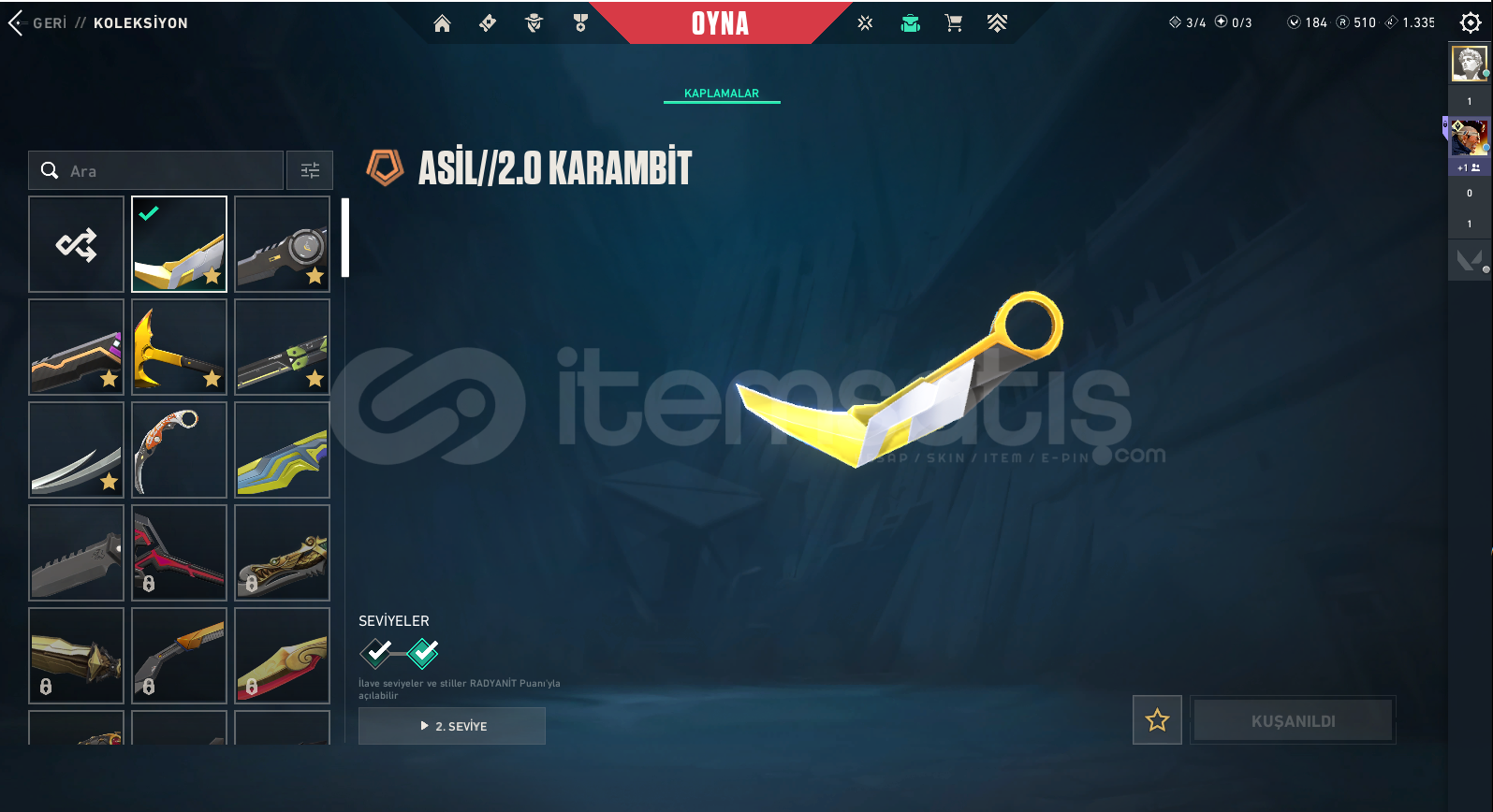 77350 TOTAL VP HARCANMIŞTIR 195 + BAŞARILI İŞLEM GÜVENCESİ !Peak Rank: ASCENDANT 2Bıçak :RGX 11z Pro Firefly, Prime//2.0 Karambit, Glitchpop DaggerVandal :RGX 11z Pro Vandal, Glitchpop Vandal, Prime Vandal, EX.O Vandal, Araxys Vandal, Reaver Vandal, Elderflame VandalPhantom :Ruination Phantom, Singularity Phantom, Ion Phantom, Silvanus Phantom, Spectrum Phantom, Prime//2.0 PhantomGhost :Infantry Ghost, Ruination Ghost, Sovereign GhostSheriff :Reaver Sher...