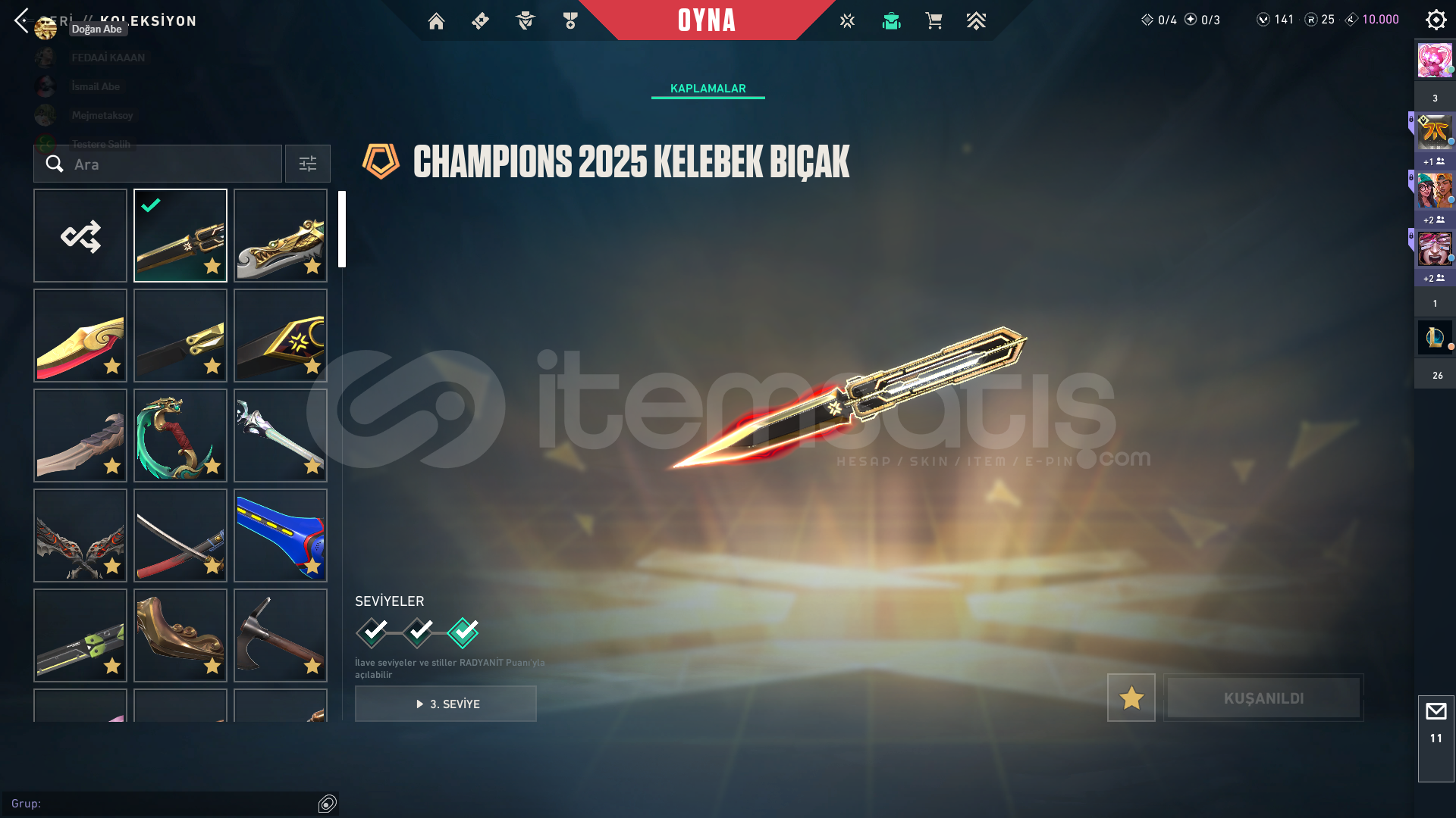 Merhaba hesabın ilk ve tek sahibiyim hesap şu an güncel olarak dia 2 içerisinde oyuna bir daha gelmeyecek champions skinleri değerli bıçaklar ve setlerle dolu ihtiyaçtan falan satmıyorum askere gidicem oyunu bırakıcam diye satıyorum. hesabın envanteri çok dolu olduğu için buraya detaylı yazamıyorum sığmıyor.detaylar için bana yazmanız yeterlidir.