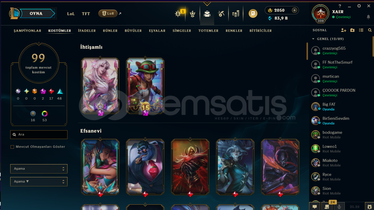 LOL 308 LEVEL 99 SKİN VE 2050RP BULUNMAKTA