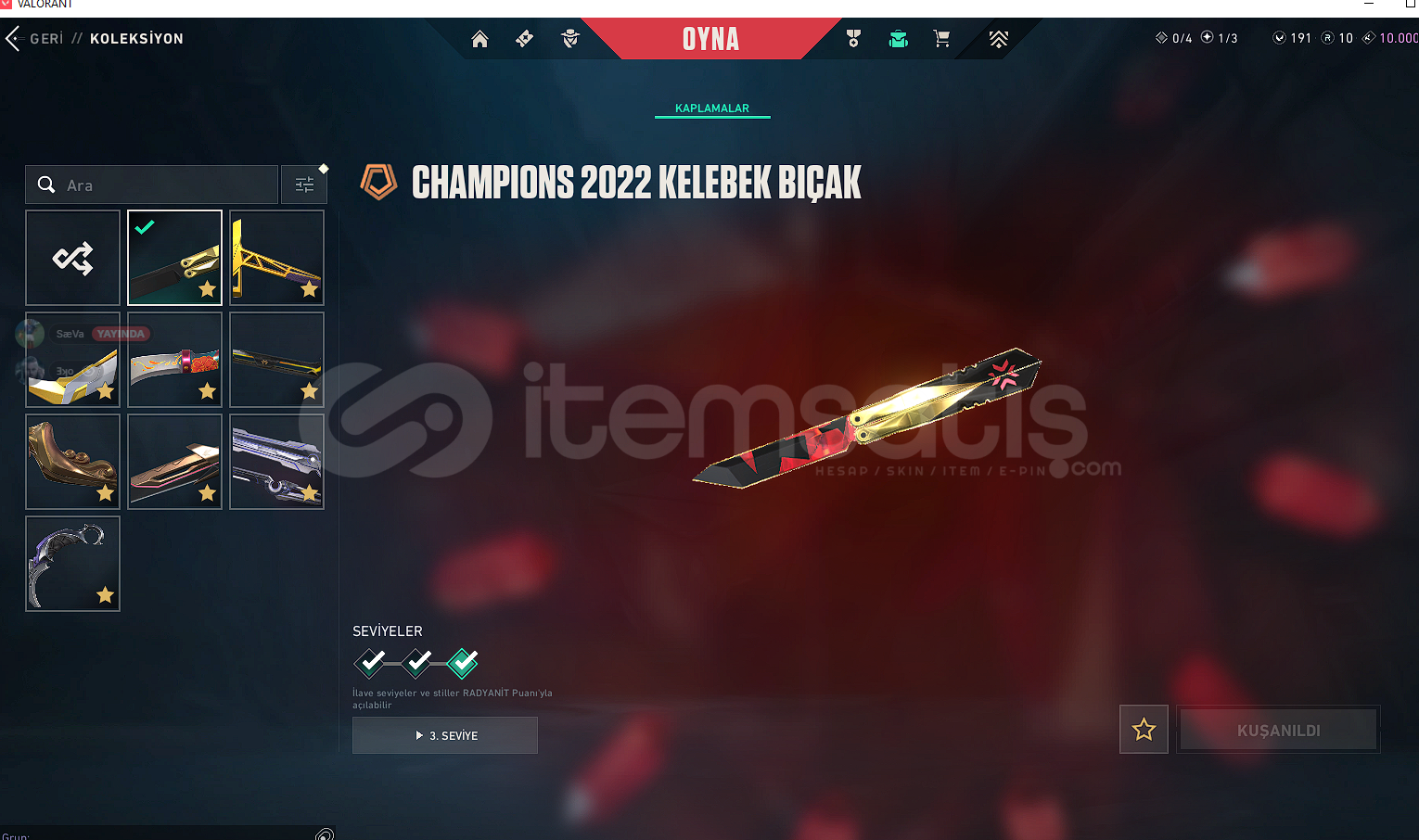 ÜST DÜZEY SKİNLER👑 CHAMPİONS 22 VE 24 👑8 BIÇAK CHAMPİONS 22 24 YAĞMACI KARAMBİT ASİL BALTA ASİL KARAMBİT SEMAVİ YELPAZE ULUPENÇE CATRİNA8 PHANTOM CHAMPİONS 22 24 SIRÇİÇEĞİ İYON ASİL FELAKET DELİPOP AĞAÇ7 VANDAL KAOS ONİ ASİL MAYMUN YİTİK İYON IŞIK MUHAFIZI1 GUARDİAN ONİ2 ODİN YAĞMACI UZAY AVCISI3 S...