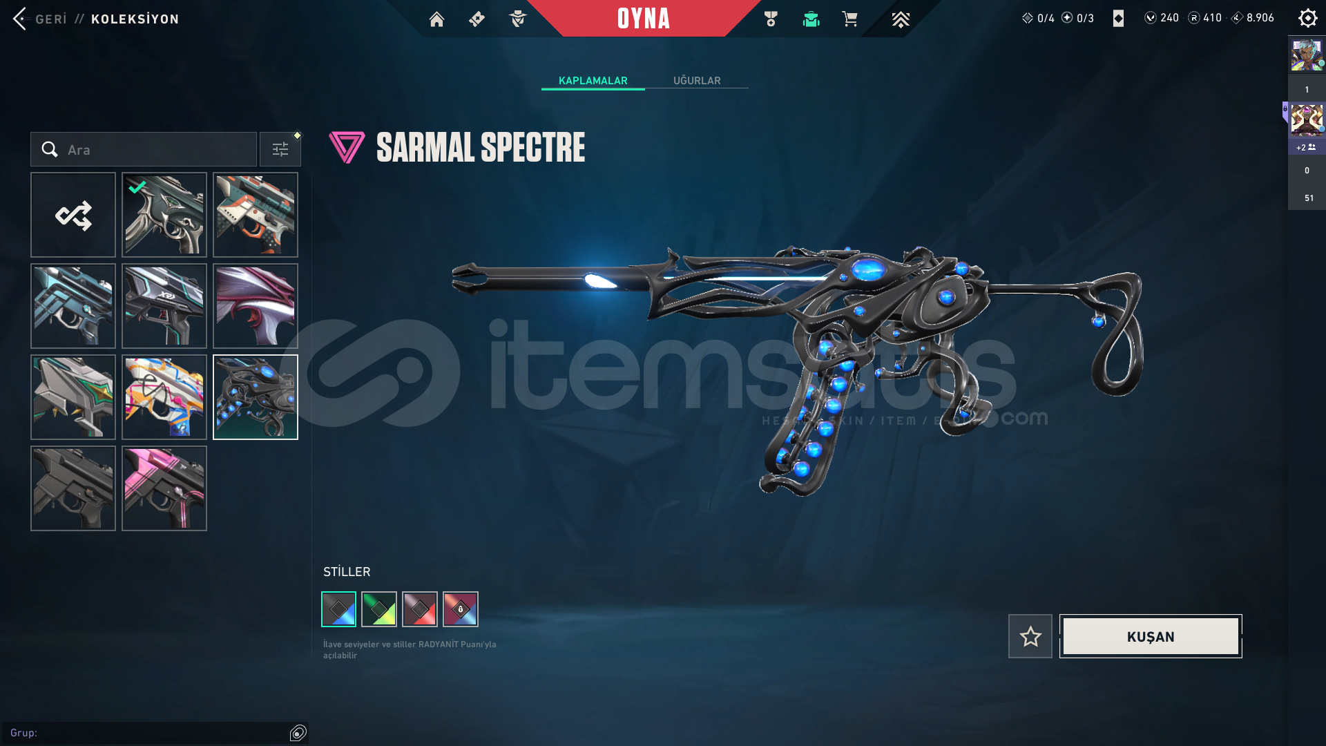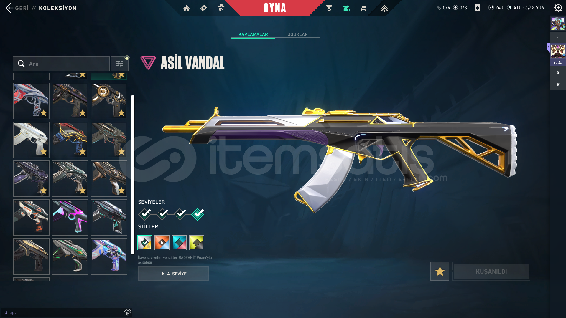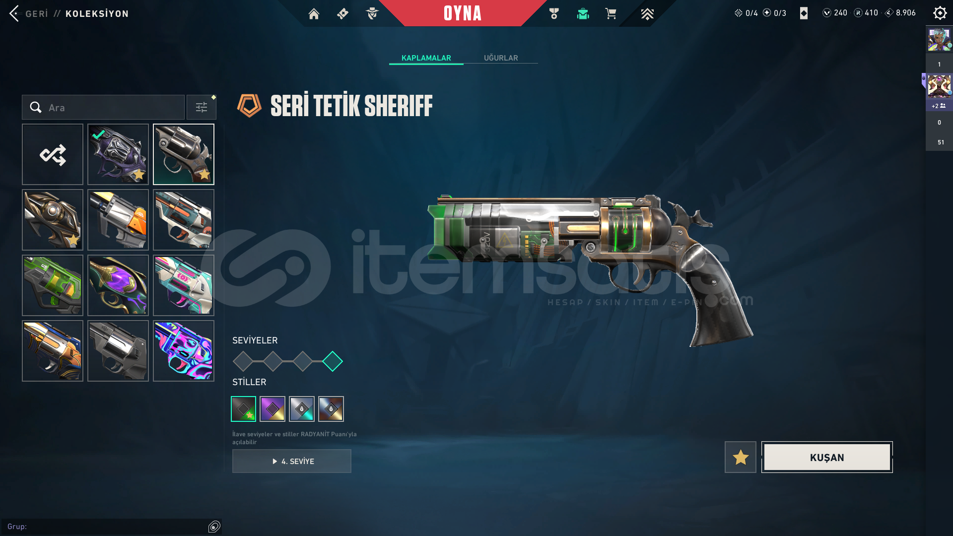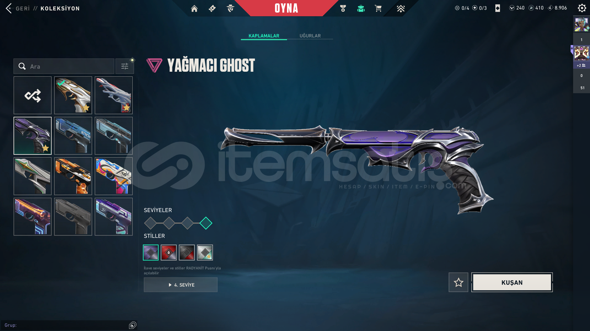 RANK = PLATLEVEL = 314ENVANTER DEĞERİ = 80.400AVRUPA sunuculu ama türkiye giriliyorSKİN Sayısı = 154Protocol 781-A PhantomSentinels of Light PhantomChampions 2024 PhantomIon KarambitWinterwunderland Candy CaneChronoVoid VandalPrelude to Chaos VandalNeo Frontier PhantomTransition KnifeVALORANT GO! Vol. 1 KnifeGuardrail HammerXenohunter KnifeTilde KnifeShellspire SwordComet SwordRadiant Crisis 001 Baseball BatNeo Frontier SheriffBubble Pop Light StickCatrinaKuronami V...