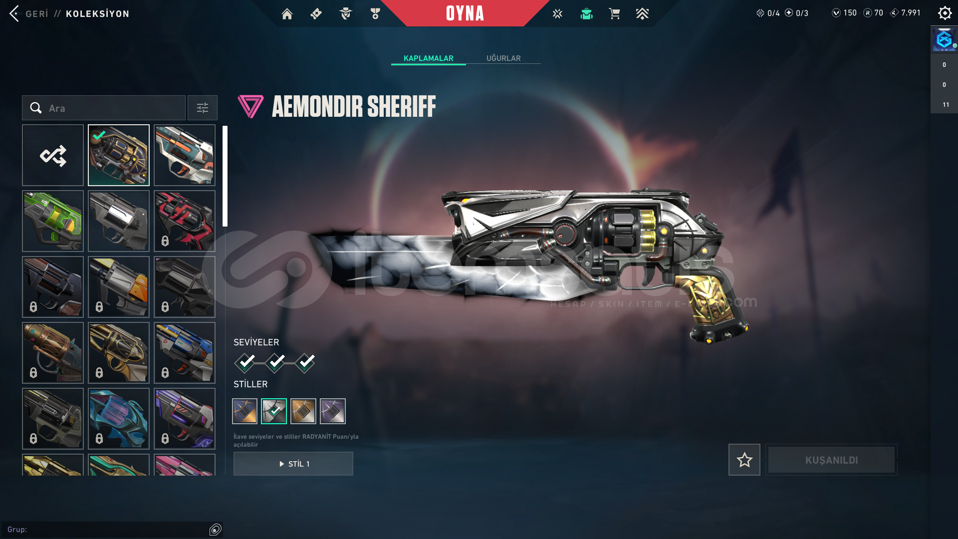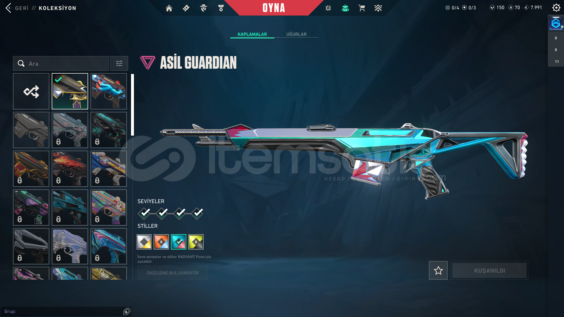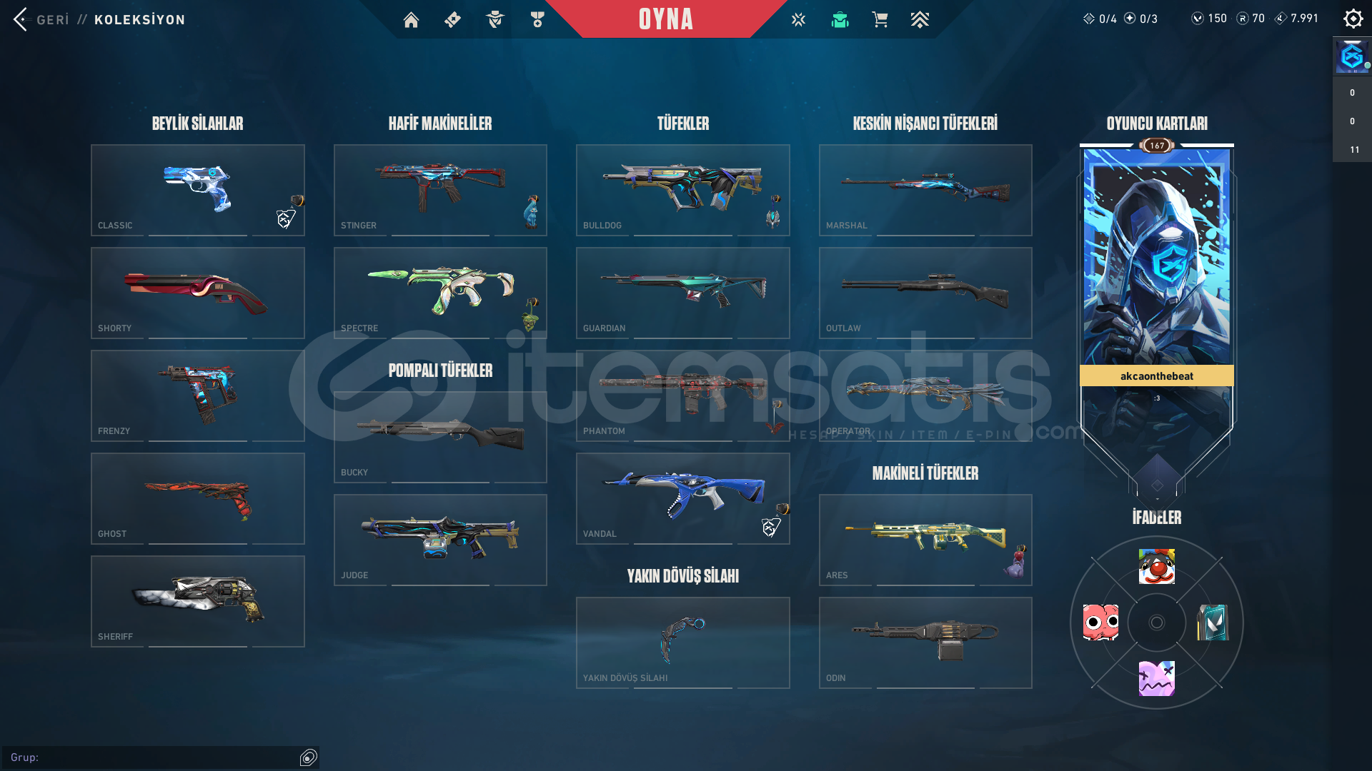 Hesap 165 LevelRankı PLAT 1 60RRHerhangi bir banı yoktur Cezası yoktur Temiz hesaptır zaten ben oynuyordum acil para lazımdı satmak zorunda kaldımİçindeki Skinler:Gx Clasic + 4 battle pass clasicGaia Ghost + 3 battle pass ghostAemondır Sheriff + 2 battle pass sheriffEvori SpectreAsil GuardianÖzel Harekat PhantomAsil vandalİyon vandalRgx KarambitGazap BıçakEjder OperatorOynadığınız Bütün silahl...