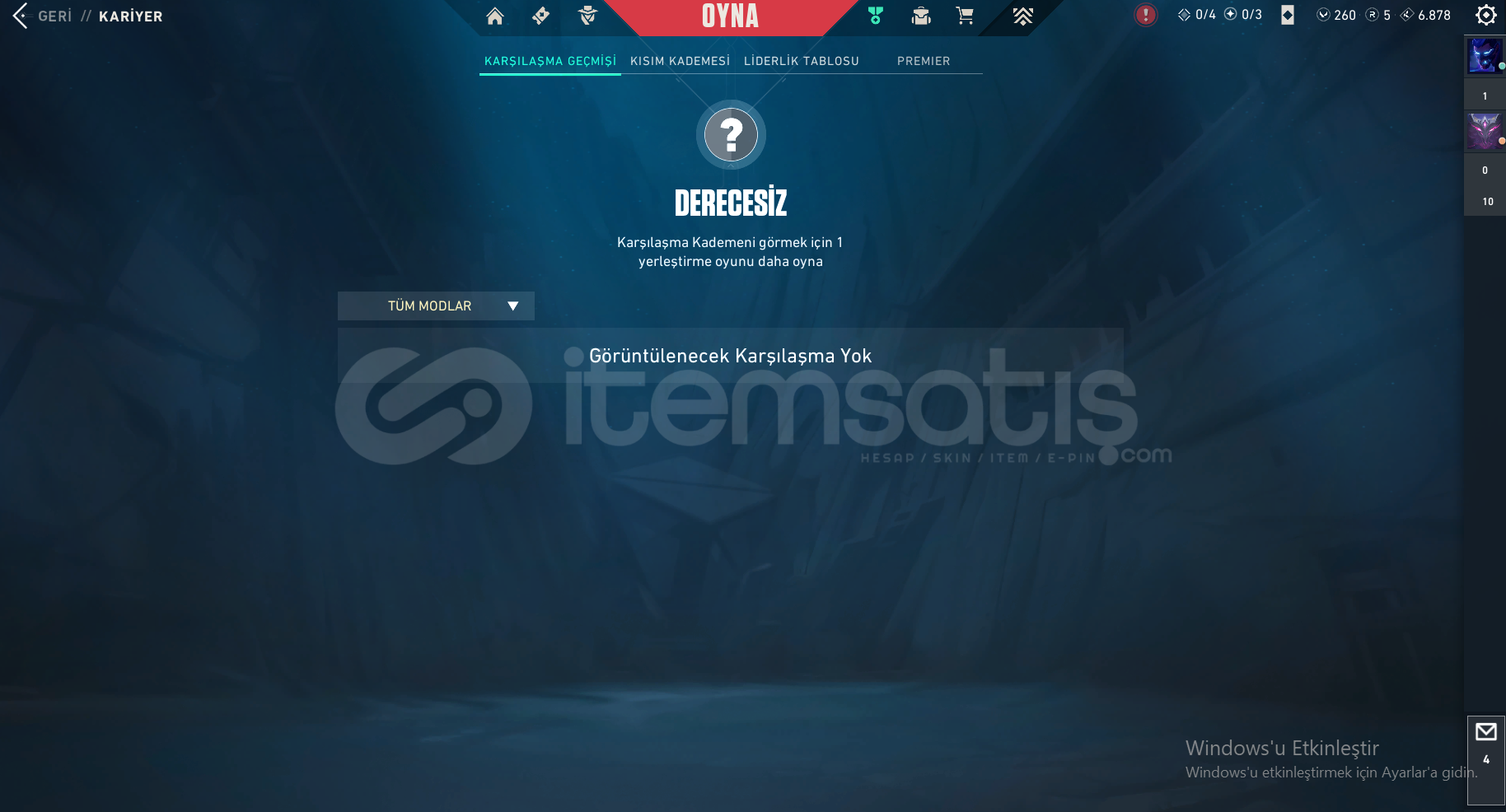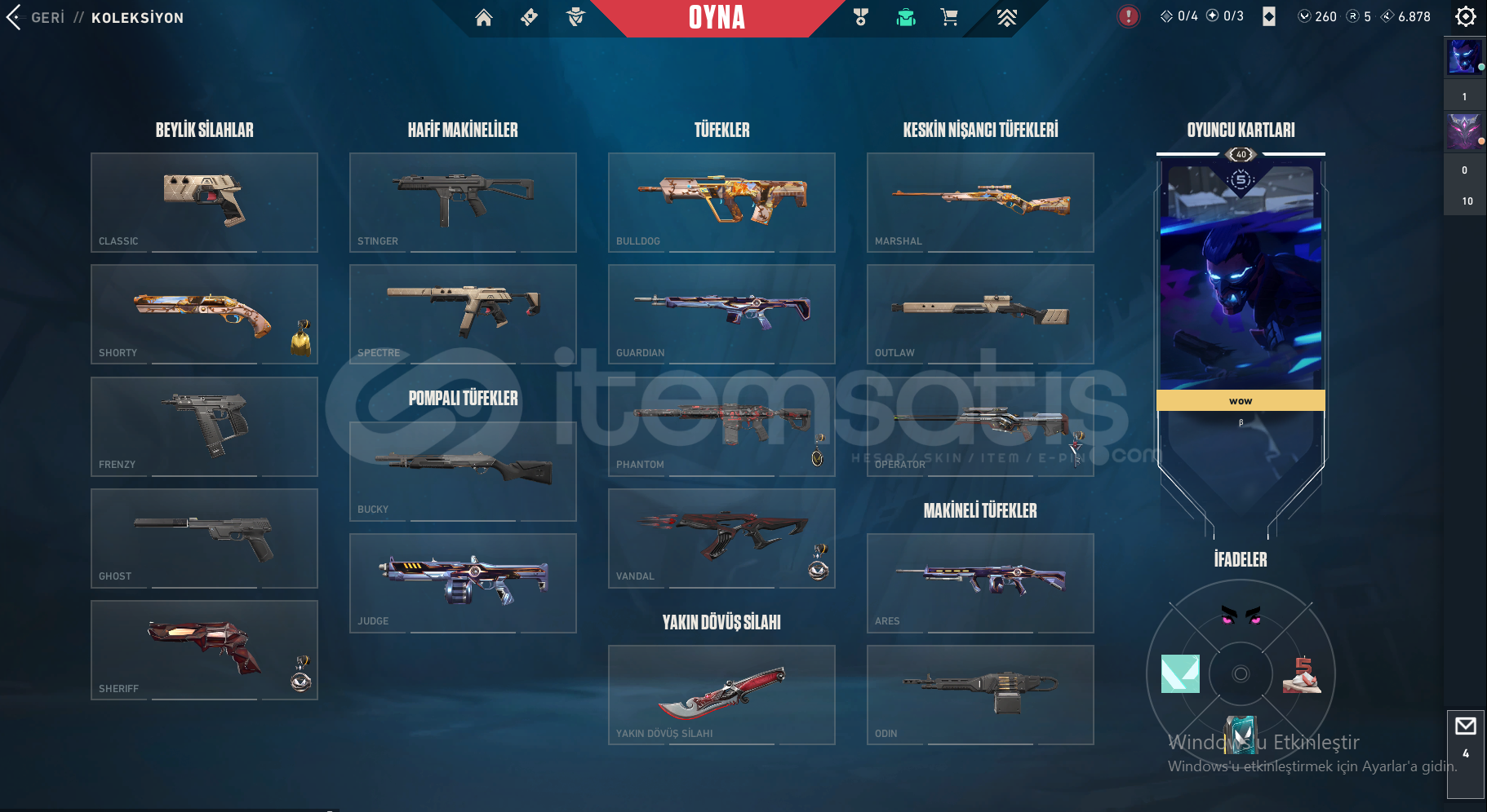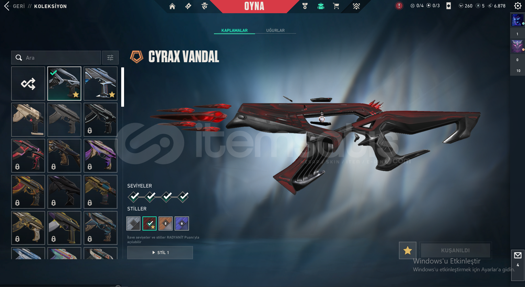 Uzun zamandır oynamadığım ve vakit bulamadığım için hesabımı satmak istiyorum.Hesap şu an unranked olup bir önceki sezonu gold 2 bitirmiştir.Hesapta herhangi bir ceza bulunmamakta isim değiştirme hakkı vardır. Hesaptaki içerikler;5 Years // Beta Remastered Bıçak, Atlas // KMT CopAnomali SheriffKaosun Başlangıcı OperatorÖzel Harekat PhantomCyrax Vandal, Kuronami Vandal