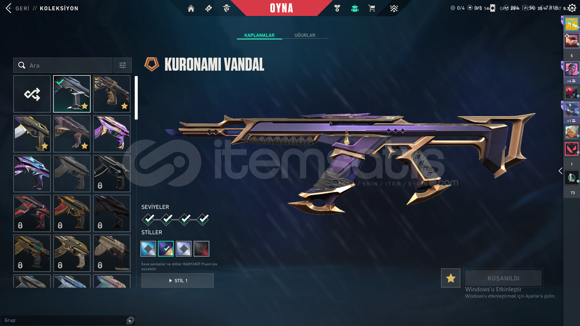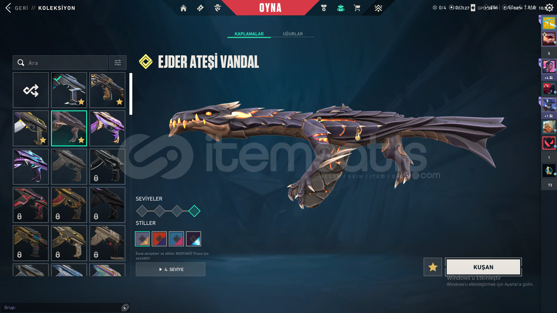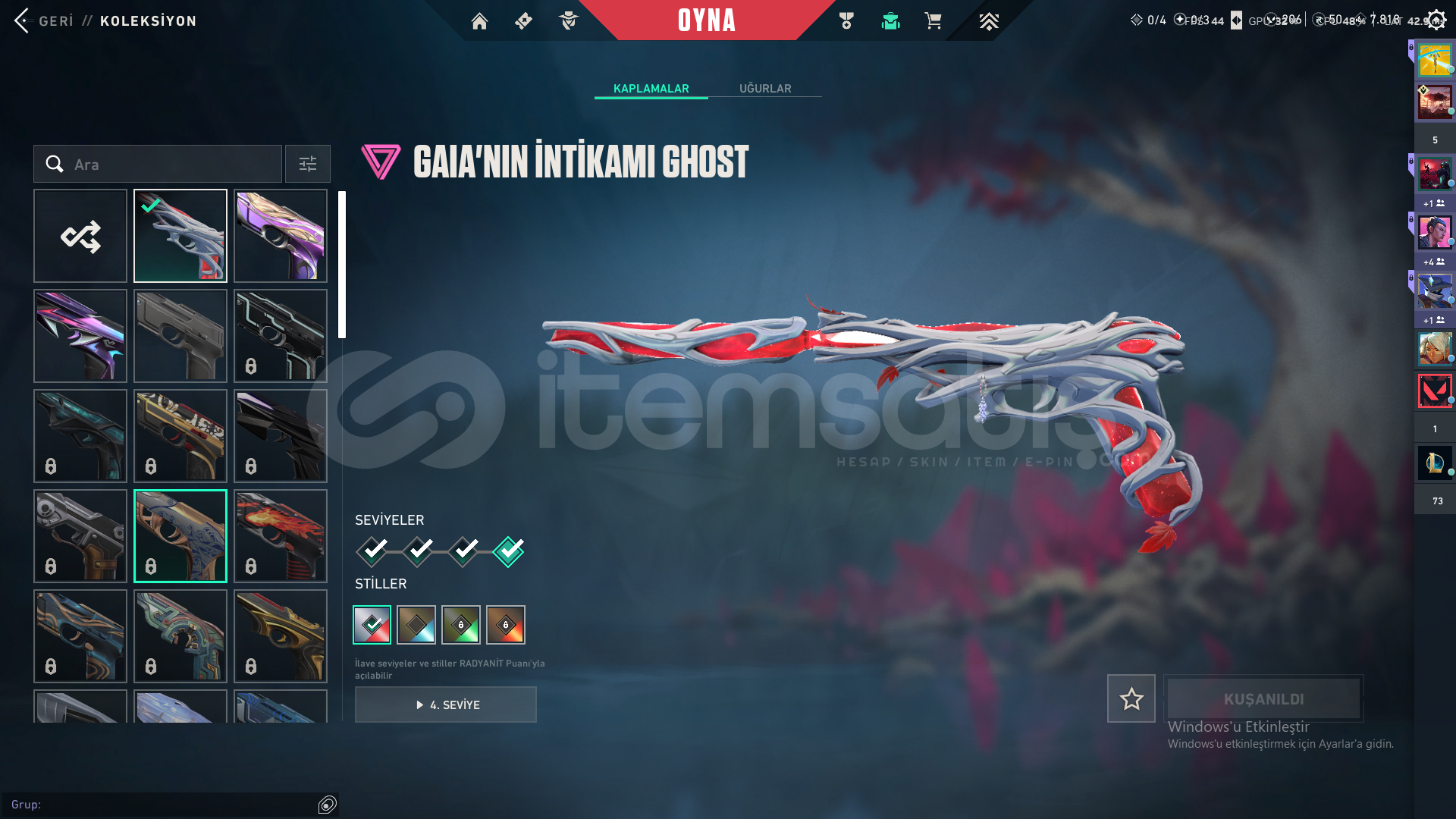 Skin İçeriğiTabancaGaia GhostKaos SheriffVandalKuronami VandalAsil VandalEjder VandalAemondir VandalPhantomSpectrum PhantomSpectreYitik SpectreGuardianYağmacı GuardianMarshallZifiri MarshallBıçaklarGalaksi Muhafızı KılıçKalp YaranHesap BilgileriLevel: 89Rank: Altın 2Ajanlar: Tüm ajanlar tam açıkSkin Seviyeleri: FullDonatılar:5 YearsSpike'a Hücum BardağıFıst...