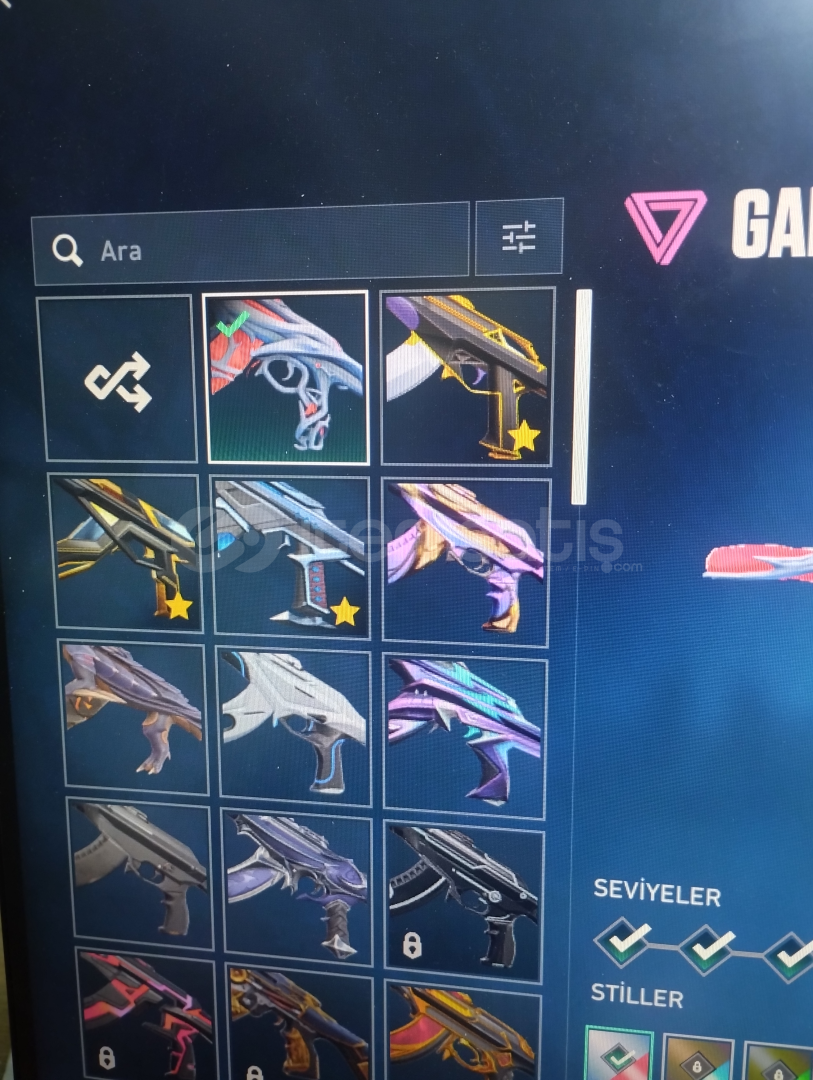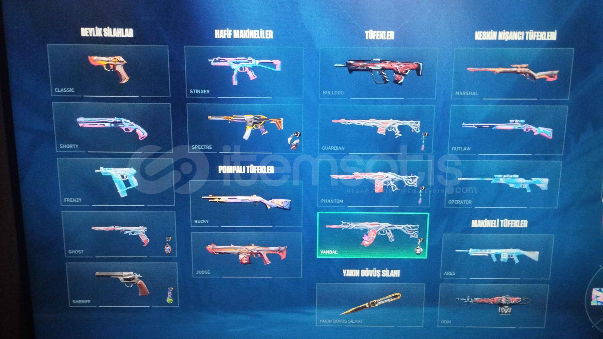 Tüm silahlarda skin vardır önemli ekinlerGhost: gaianin intikamı Sherif: seri tetik Spectre: asilGuardian: gaianin intikamı Phantom: gaianin intikamı Vandal: kuronomi, asil, champions25 , yağmacı, gaianin intikamı , ejder ateşi, iyonBıçak: champions25 bıçak Hepsi son seviyedir