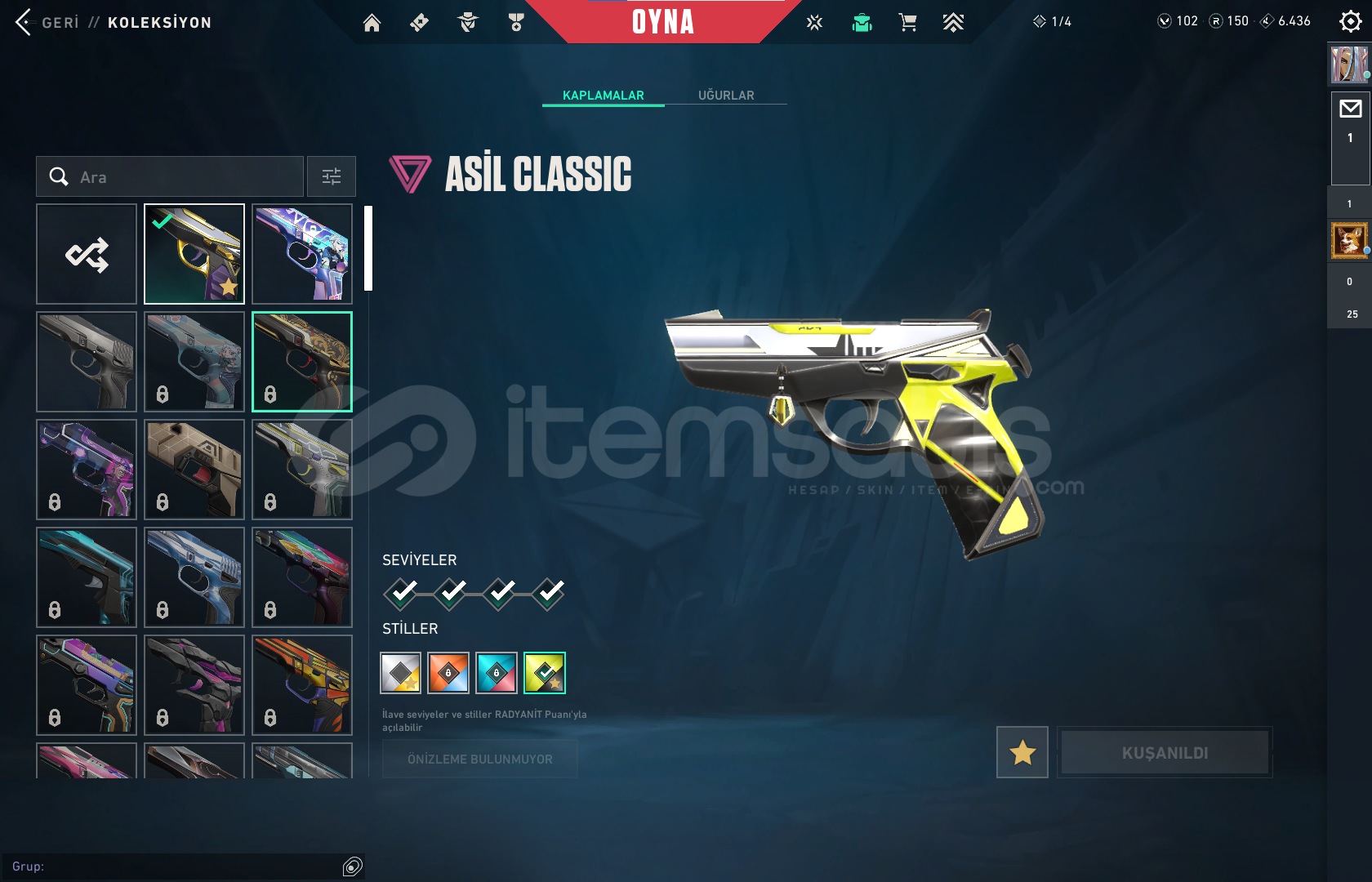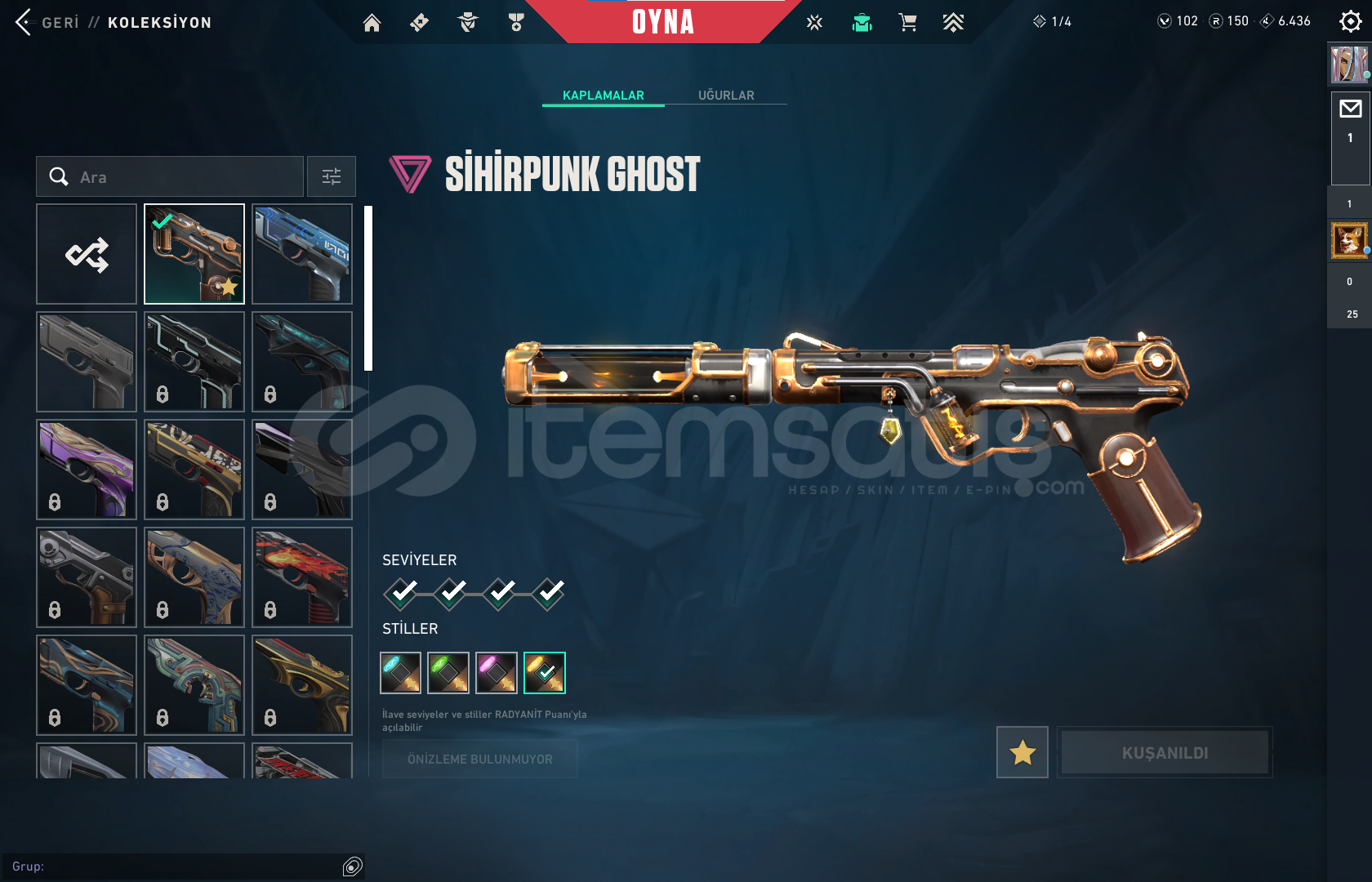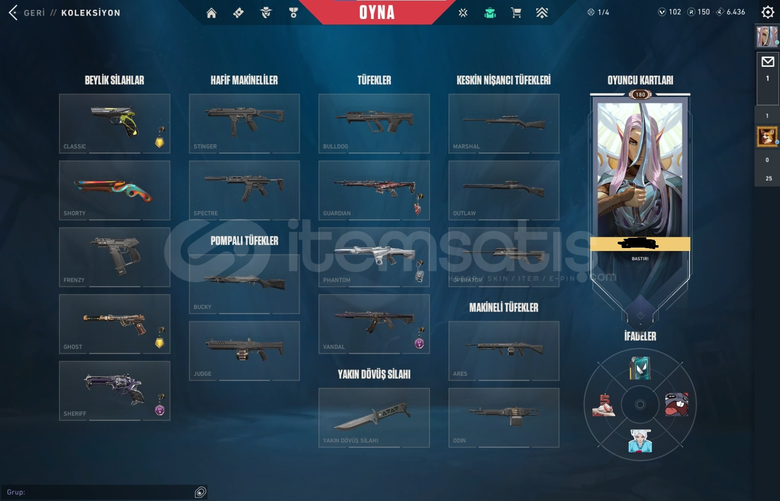 ALMADAN ONCE YAZINHAFTAİÇI 16:00-23:00 ARASI HAFTA SONU 14:00-24:00 ARASI AKTİFİMTertemiz Mainlemelik HesapÖnceden Dia Olmuş Ama Güncel Olarak GümüşYeni Gelen Vp Zamlarına Göre Çok Uygunİsim Değişme Hakkına Az KalmıştırHESAPTAKİ PAHALI SKİNLER NELER?Classic: AsilGhost: SihirPunkSheriff: YağmacıGuardian: YağmacıPhantom: İyonVandal: Kaos,iyon,anomali,oni,nept&u...