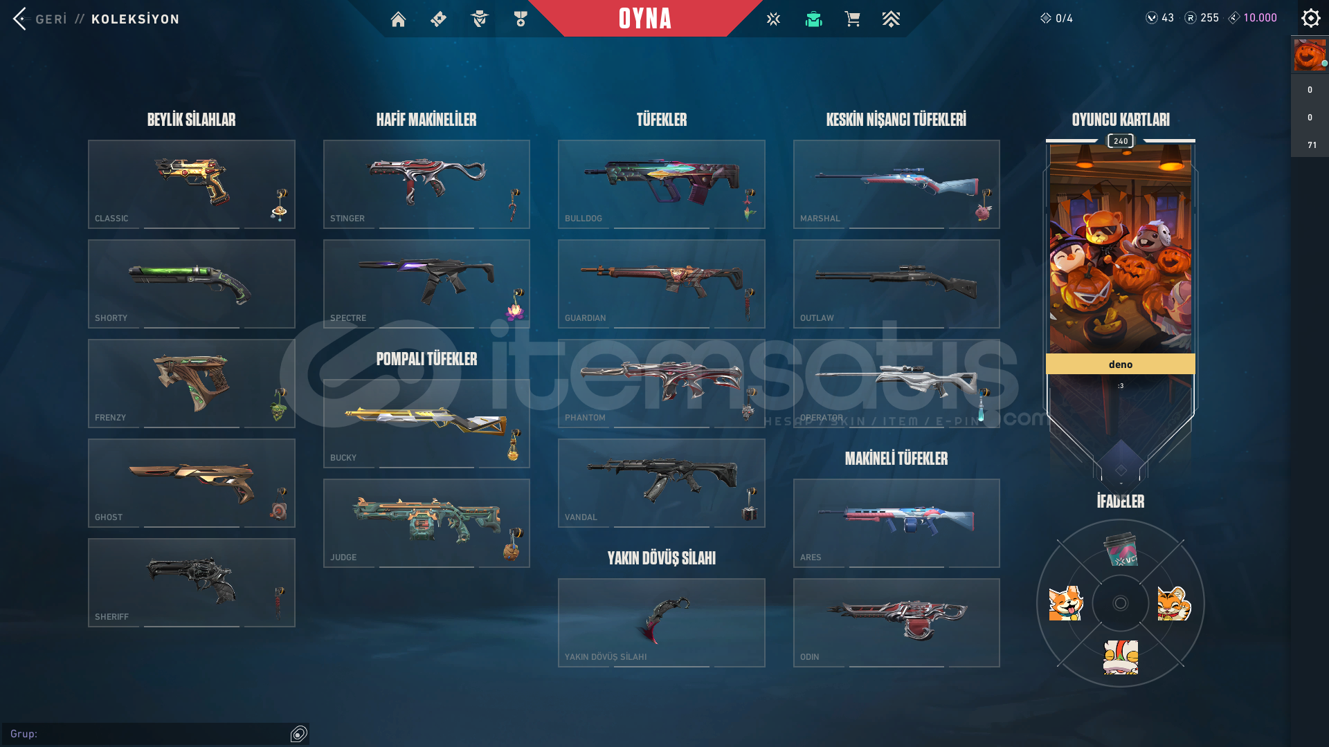 Classic:Delipop ClassicFrenzy:Holomoku FrenzyGhost:Ulupençe GhostSihirpunk GhostSheriff:Yağmacı SheriffIşık Muhafızları SheriffSpectre:Anomali SpectreBucky:Asil BuckyPhantom:Fatih PhantomRGX PhantomVandal:Kuronami VandalYağmacı VandalBıçaklar:Delipop HançerChampions 2025 Kelebek BıçakYağmacı KarambitOperator:İyon OperatorHesap Seviyesi: 240Aktif Rank: Derecesiz (Unranked)Sunucu: TR / EUMağaza Bö...