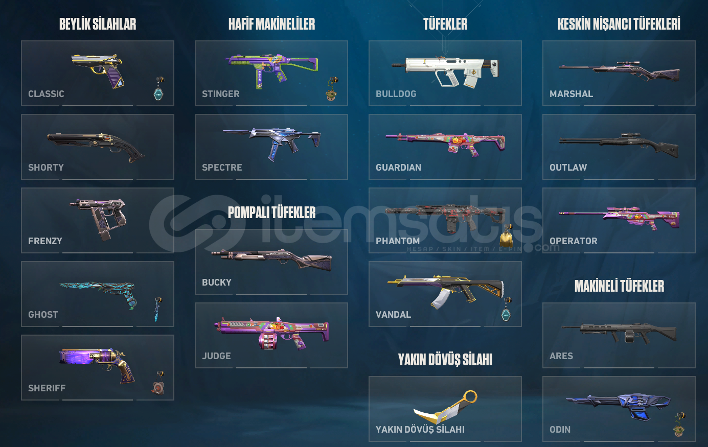 Classic/ neptün clas.asil clas.Ghost/ gaia ghostulupençe ghost Sheriff/iyon sheriffseri tetik sheriffyağmacı sheriffBulldog/ neptün bulldogVandal/ iyon vandalrgx vandalasil vandalulupençe vandalyağmacı vandalPhantom/özel harekat phantomyağmacı phantomfatih phantomBıçak/asil 2.0 karambit +battlepasshesaba 23000+ vp yatırılmış, isim değiştirme mevcut, 200+LVL, Mail değiştirilip verilecek,...