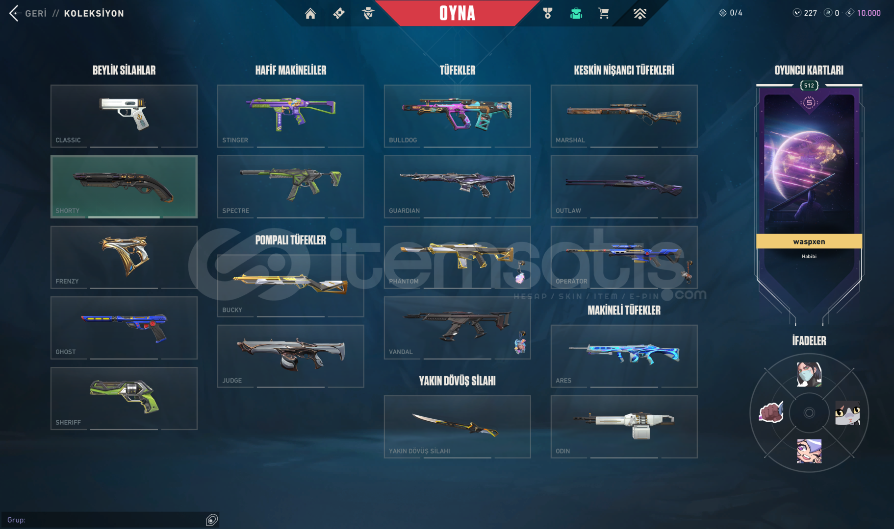Hesapta birçok BattlePass skini bulunduğundan listeye onları eklemiyorum. Lütfen yalnızca ciddi alıcılar iletişime geçsin.CLASSICNeptün ClassicZifiri ClassicSpectrum ClassicRGX 11Z Pro ClassicAsil Classic olmak üzere toplamda 15 skin,SHORTYKaosun Başlangıcı Shorty olmak üzere 9 skin,FRENZYFatih Frenzy olmak üzere 12 skin,GHOSTRadiant Entertainment System GhostUlupençe GhostGaia'nın İntikamı ...