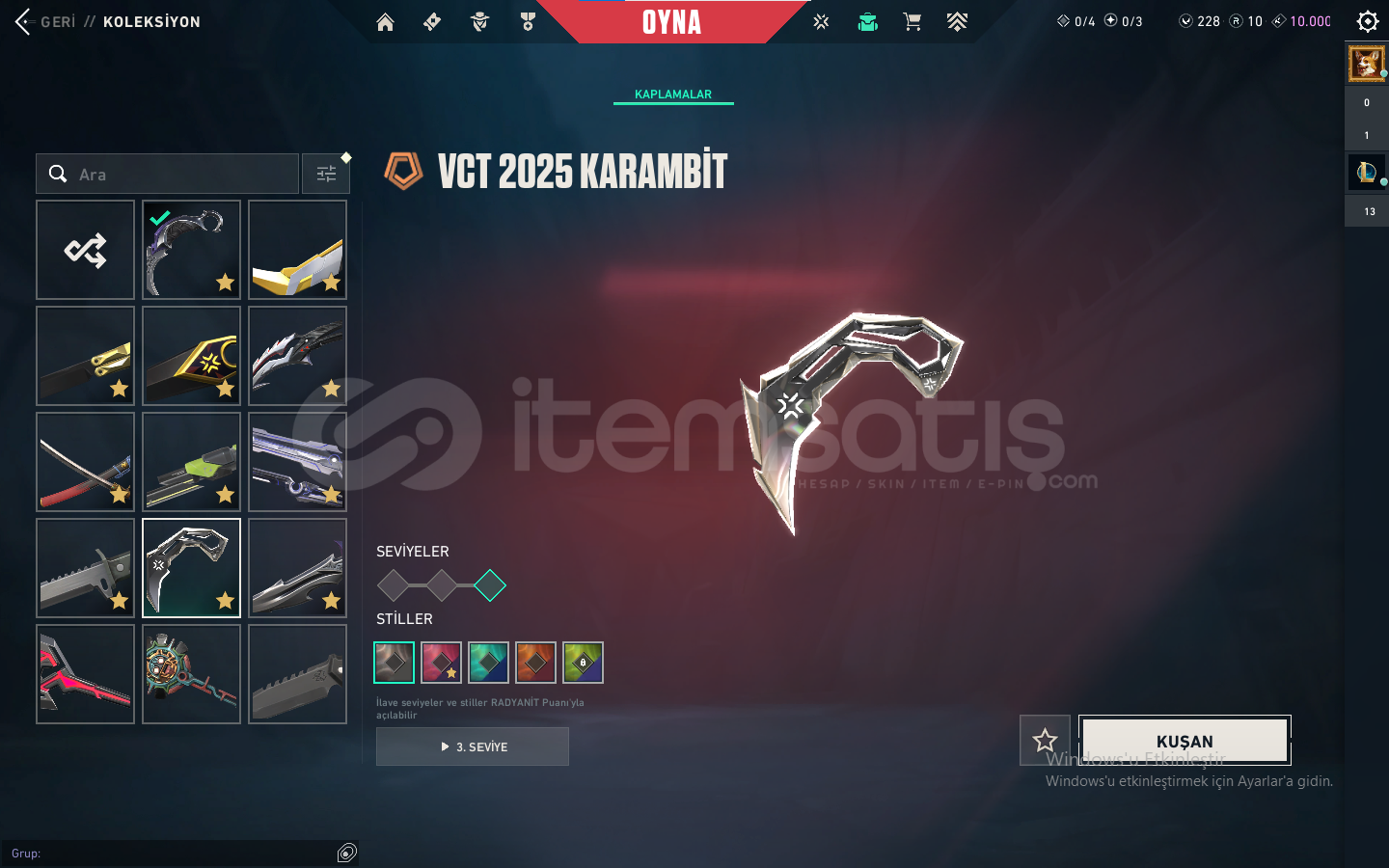 BIÇAK : Yağmacı Karambit, Yağmacı Bıçak, VCT 2025 Karambit, Uzaylı Avcısı, Uzaylı Geçidi, RGX Katana, Oni Katana, Champ 2023 Kunai , Champ 2022 Kelebek, Asil Karambit, Ecelin Isırığı