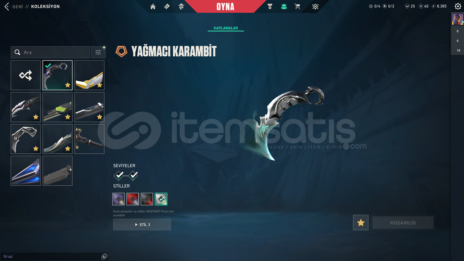 Bıçak Skinleri;Yağmacı Karambit,Asil Karambit,Rgx Katana,Vct Karambit,Yitik Hançer,Şimşek Hançer