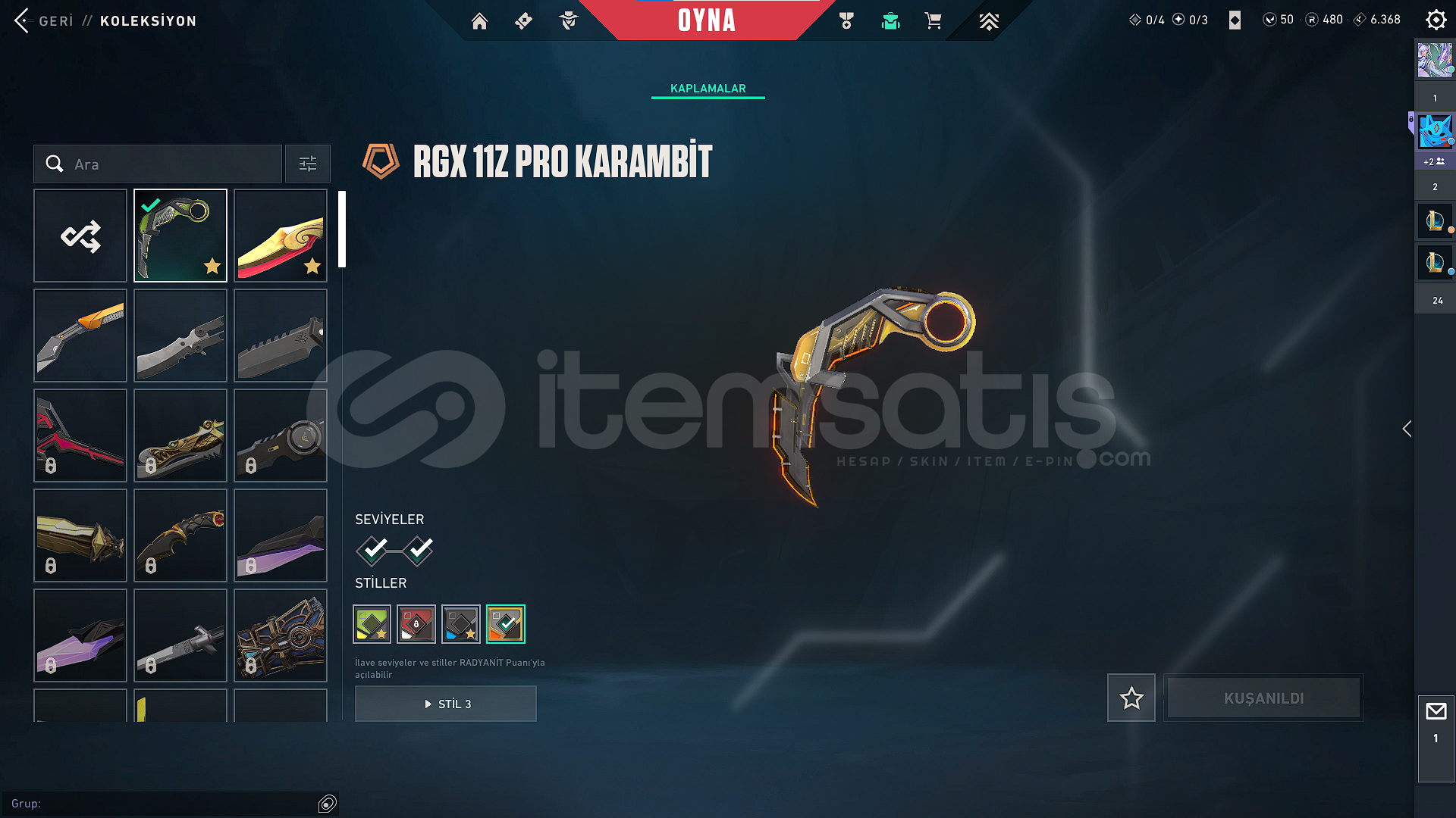 Hesapta Alaz yelpaze, RGX Karambit, Yağmacı vandal ve 1 bp vardır. Alaz yelpaze dükkana bir daha gelmeyeceğinden bu fiyattadır