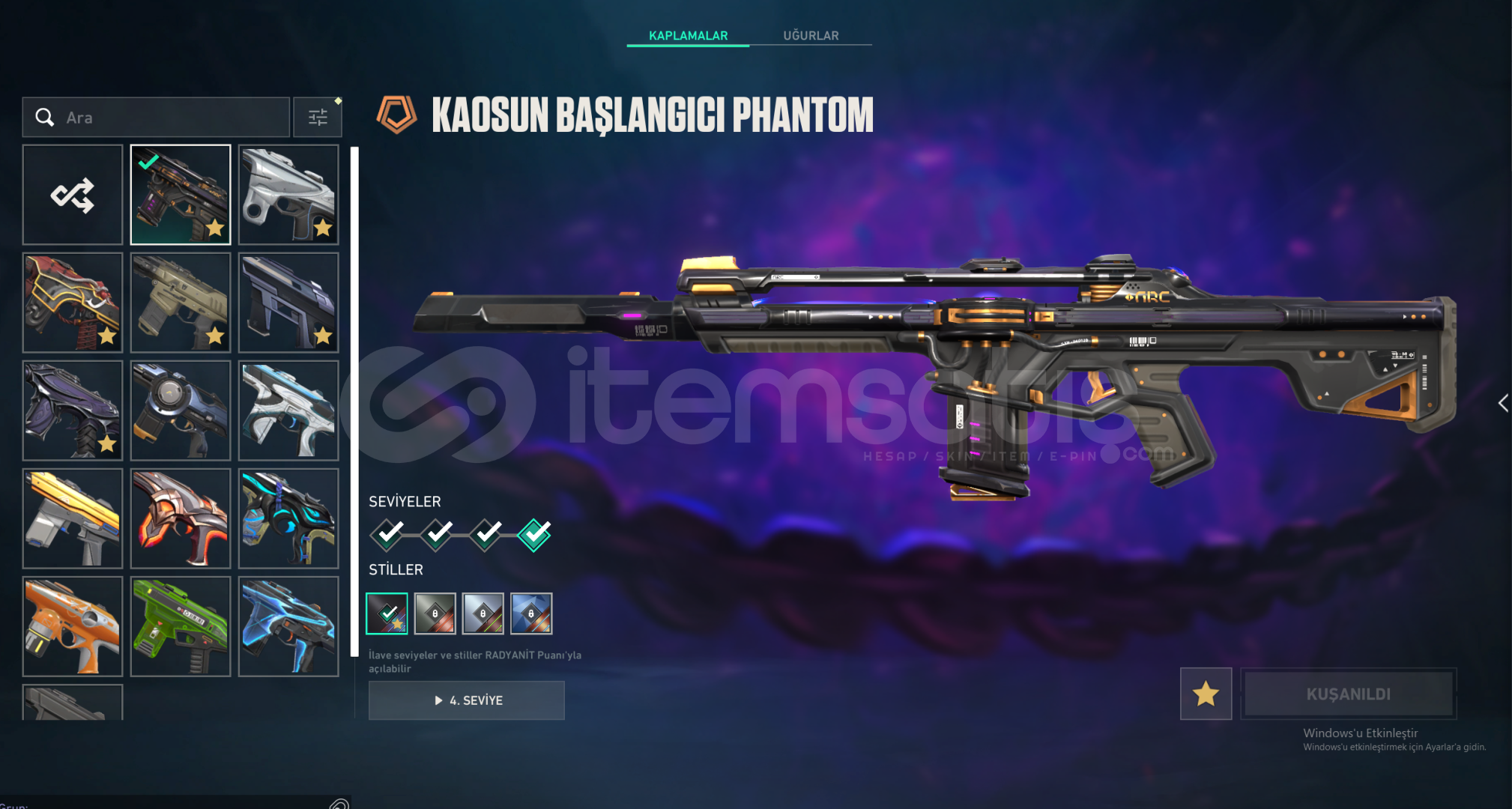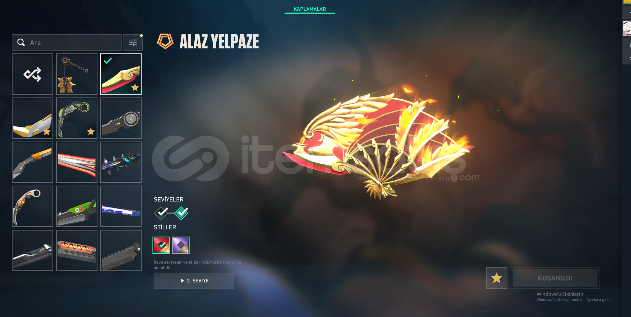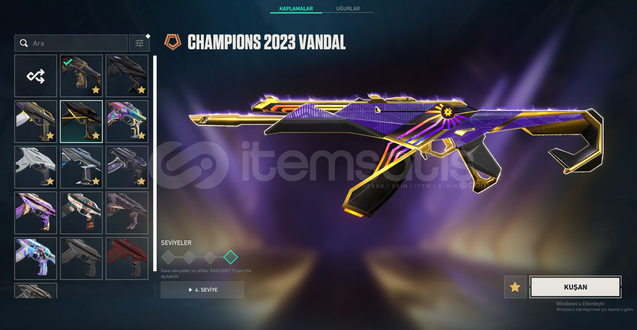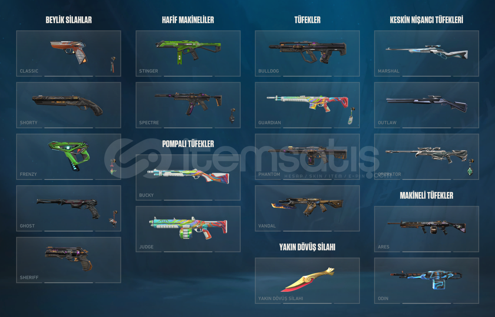 Asil classic Şimşek, Iyon frenzy Yağmacı Ghost Rgx, Kaos SheriffŞimşek, Kaos, Yağmacı SpectreKaos BulldogKaos, Iyon, oni, özel harekat, şimşek, yağmacı PhantomAeomondir, Anomali, Asil, 2023 cHAMPIONS, Delipop, Iyon, Kuronami, Yağmacı, Ejder VandalAlaz yelpaze, asil karambit, rgx karambit, kaos gürzü BıçakŞimşek, rgx OutlawYitik Operator3 4farklı savaş biletinin skinleri mevcut yaz...