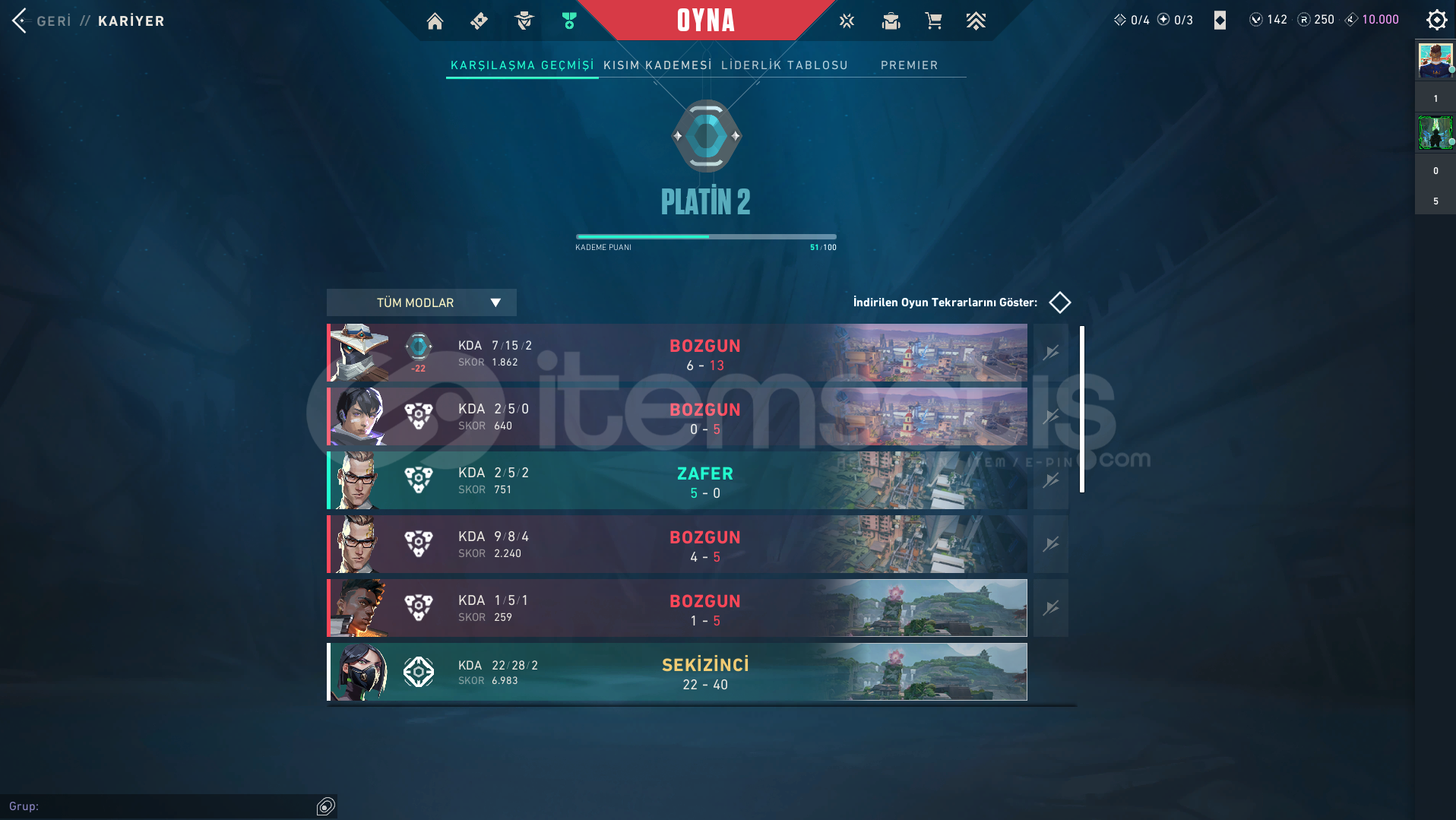 Valorant'ın en çok aranan bıçaklarından biri olan Asil Karambit'e sahip, Platin 2 rankında koleksiyonluk bir hesaptır! Satış, %100 güvenlik garantisi ile, ilk mailiyle birlikte yapılacaktır.💰 Fiyat ve RankPLATİN 2 (PLT 2) RANK: İdeal başlangıç ve hızlı yükseliş rankı.💰 Fiyat: 1.600 ₺ (Ciddi alıcılar için makul pazarlık payı mevcuttur...