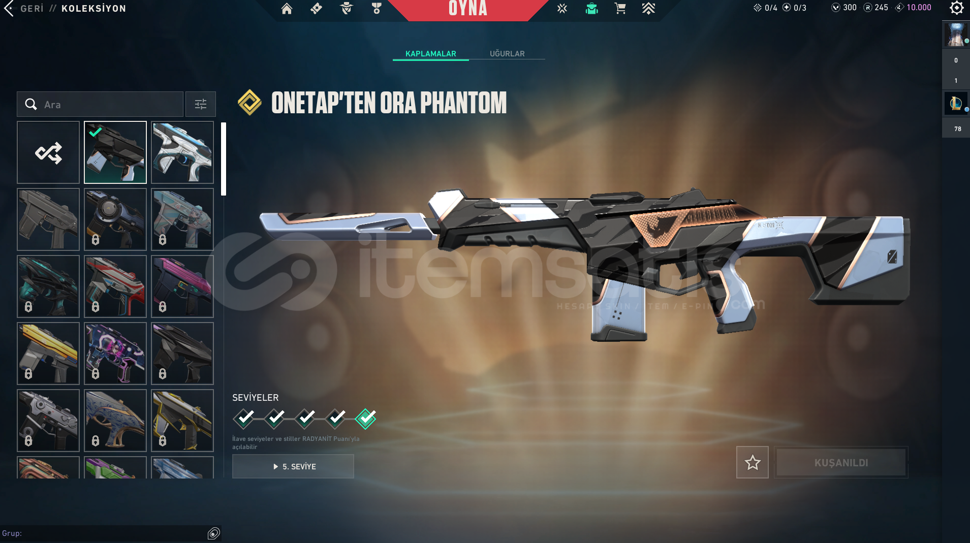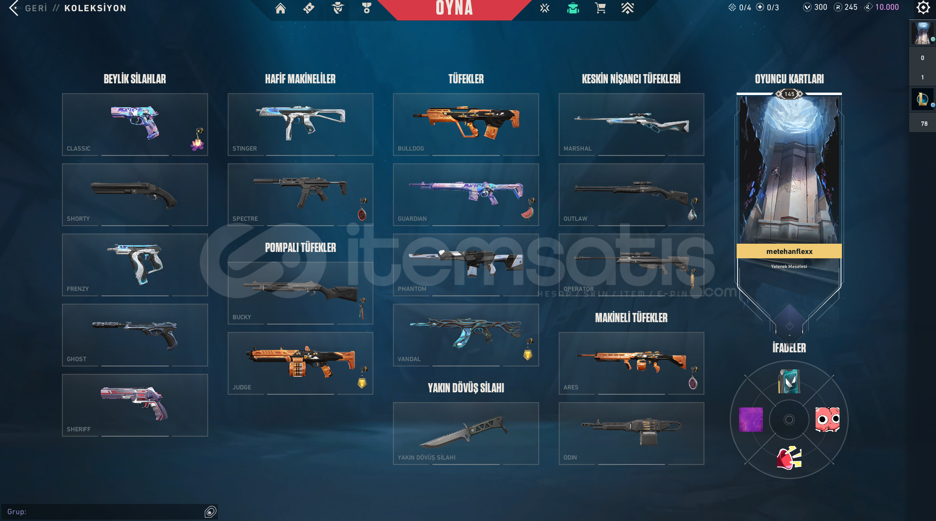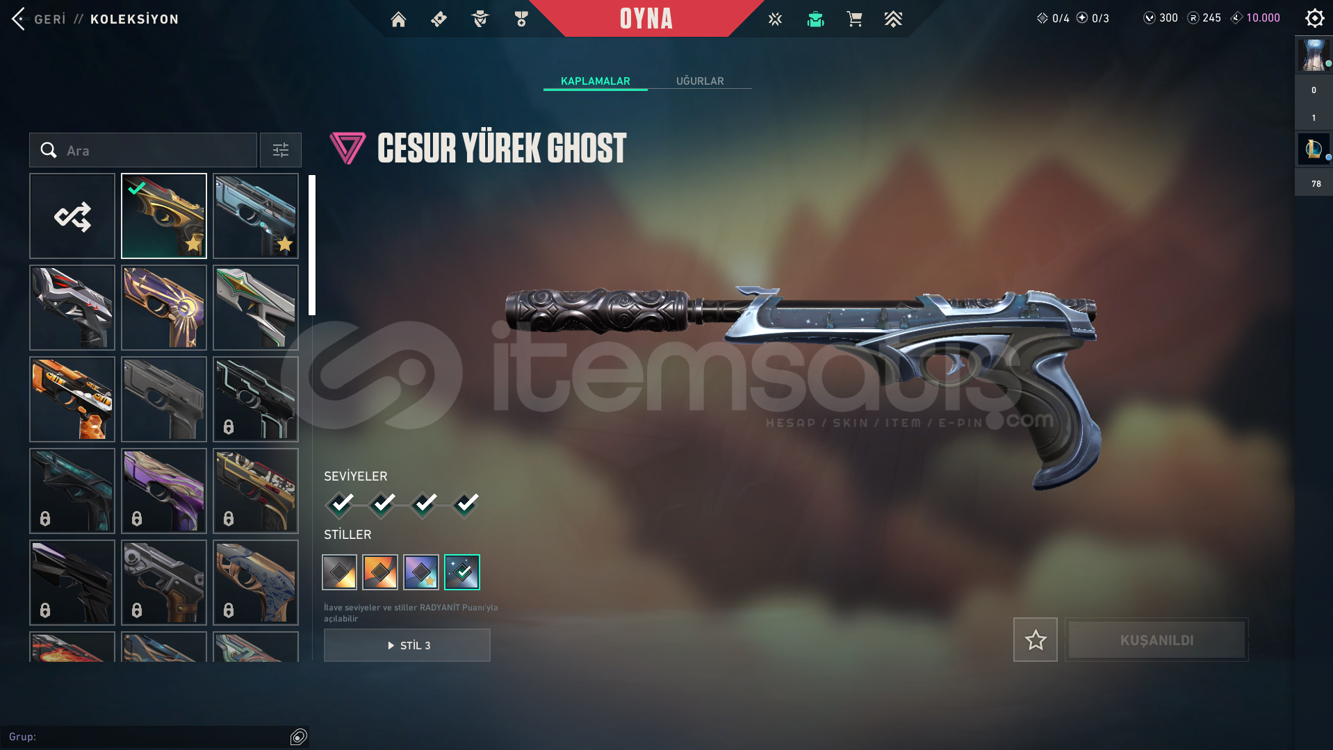 Bu Valorant hesabı, Bronz 3 derecesinde olup içinde dikkat çekici ve popüler kaplamalar barındıran özenli bir koleksiyona sahiptir. Hesapta ORA Phantom, Gaia’s Vengeance Vandal, Polmir’in İntikamı Vandal, Cesur Yürek Ghost, Uzaylı Avcısı bıçak ve Popstar bıçak gibi sevilen skinler bulunmaktadır. Hesap, ilk açıldığı orijinal Gmail adresiyle birlikte teslim edile...