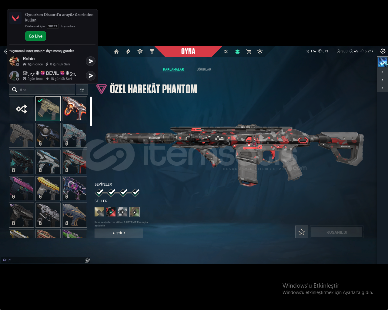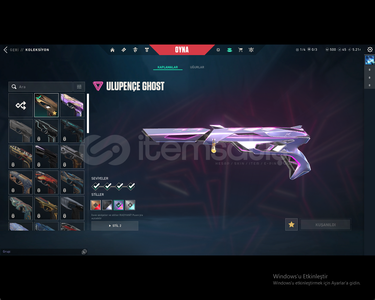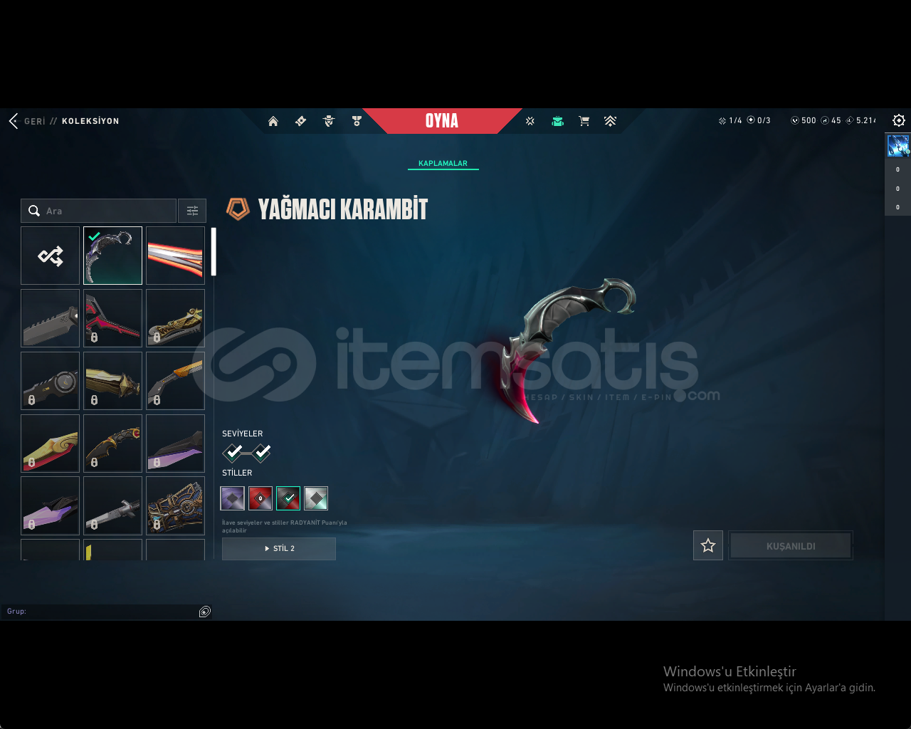 :HESAP İÇERİĞİ:YAĞMACI KARAMBİT:ÖZEL HAREKET PHANTOM:EJDER ATEŞİ VANDAL:ULUPENCE GHOST:500 VP VARDIR:GOLD 1