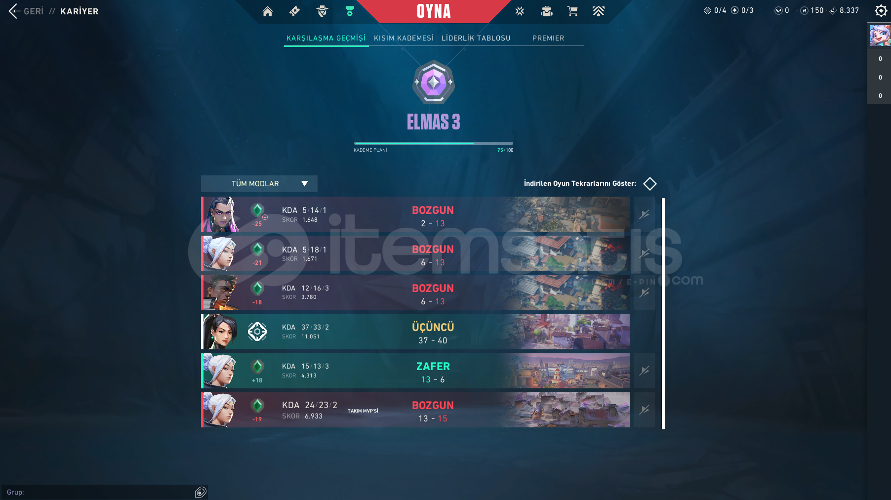 Elmas 3 - 75rr V25//ACT6AJANLAR: CHAMBER - CYPHER - İSO - REYNAYüksek MMR'lı hesaptır. 25 seviye hesaptır.Hiçbir hesapta 3. Parti yazılım kullanılmaz, ban riski kesinlikle bulunmaz.!!!Tedarikçiden mail onaysız alınıp kendi mailimize aktarılan hesaplardır, geri çekme gibi durumlar oluşmaz.!!!