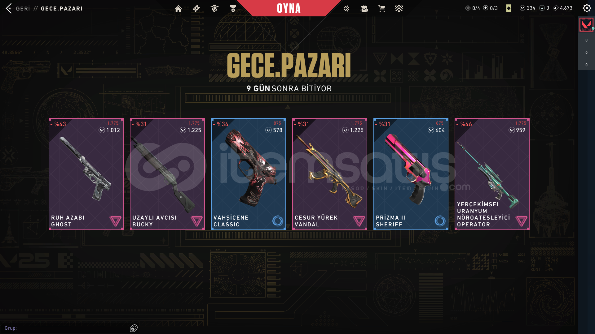 GECE PAZARI: RUH AZABI GHOST: 1.012 VP, UZAYLI AVCISI BUCKY: 1.225 VP, VAHŞİÇENE CLASSIC: 578 VP, CESUR YÜREK VANDAL: 1.225 VP, PRIZMA 2 SHERIFF: 604 VP, YERÇEKİMSEL URANYUM OPERATÖR: 959 VP (İNANILMAZ BİR FİYAT)