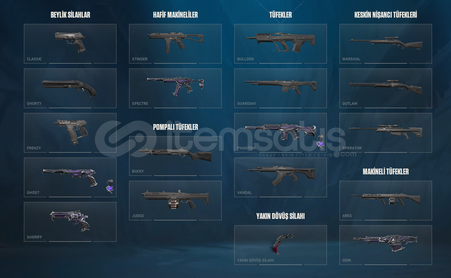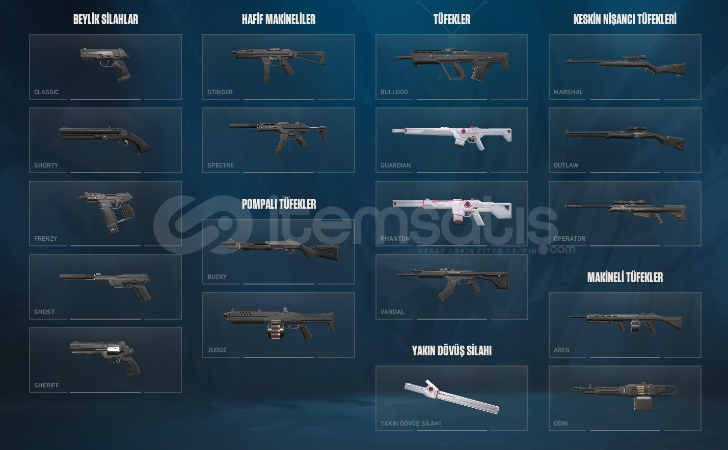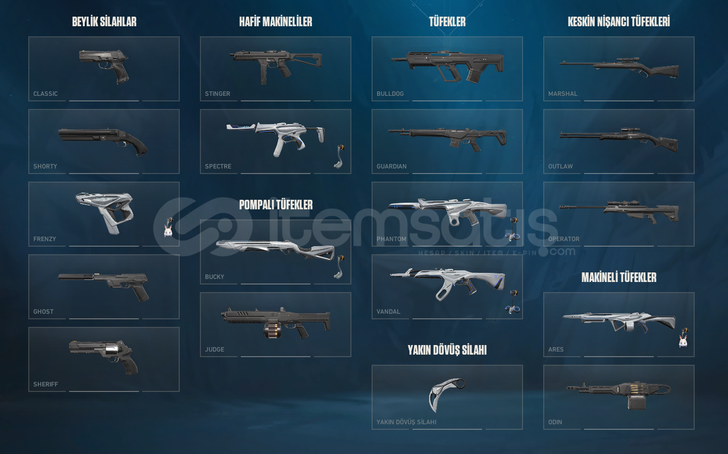 BU HESAPTA VAR OLAN TÜM SKINLER:CLASSIC: DELİPOP, ASİL, YERÇEKİMSEL URANYUM, +2 SAVAŞ BİLETİ SKİNİSHORTY: KAOS, +2 SAVAŞ BİLETİ SKİNİFRENZY: BLASTX, DELİPOP, İYON, +3 SAVAŞ BİLETİ SKİNİGHOST: GAIA'NIN İNTİKAMI, YAĞMACI, ÖZEL HAREKAT, +5 SAVAŞ BİLETİ SKİNİSHERIFF: KIZIL MUSİBET, YAĞMACI, ZAMANIN ÖTESİ, SİHİRPUNK,...