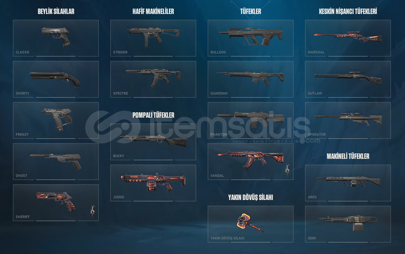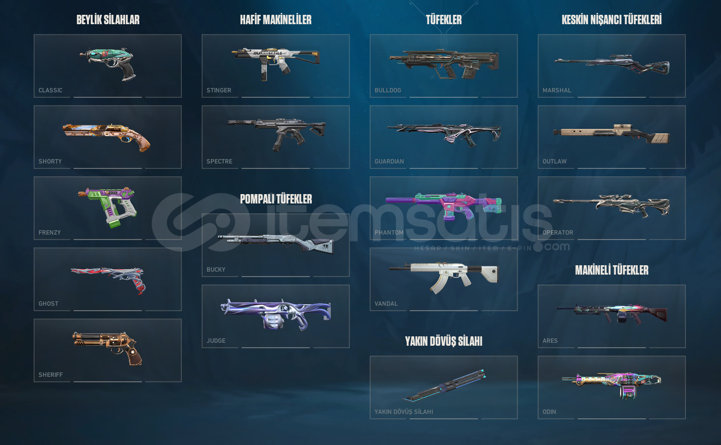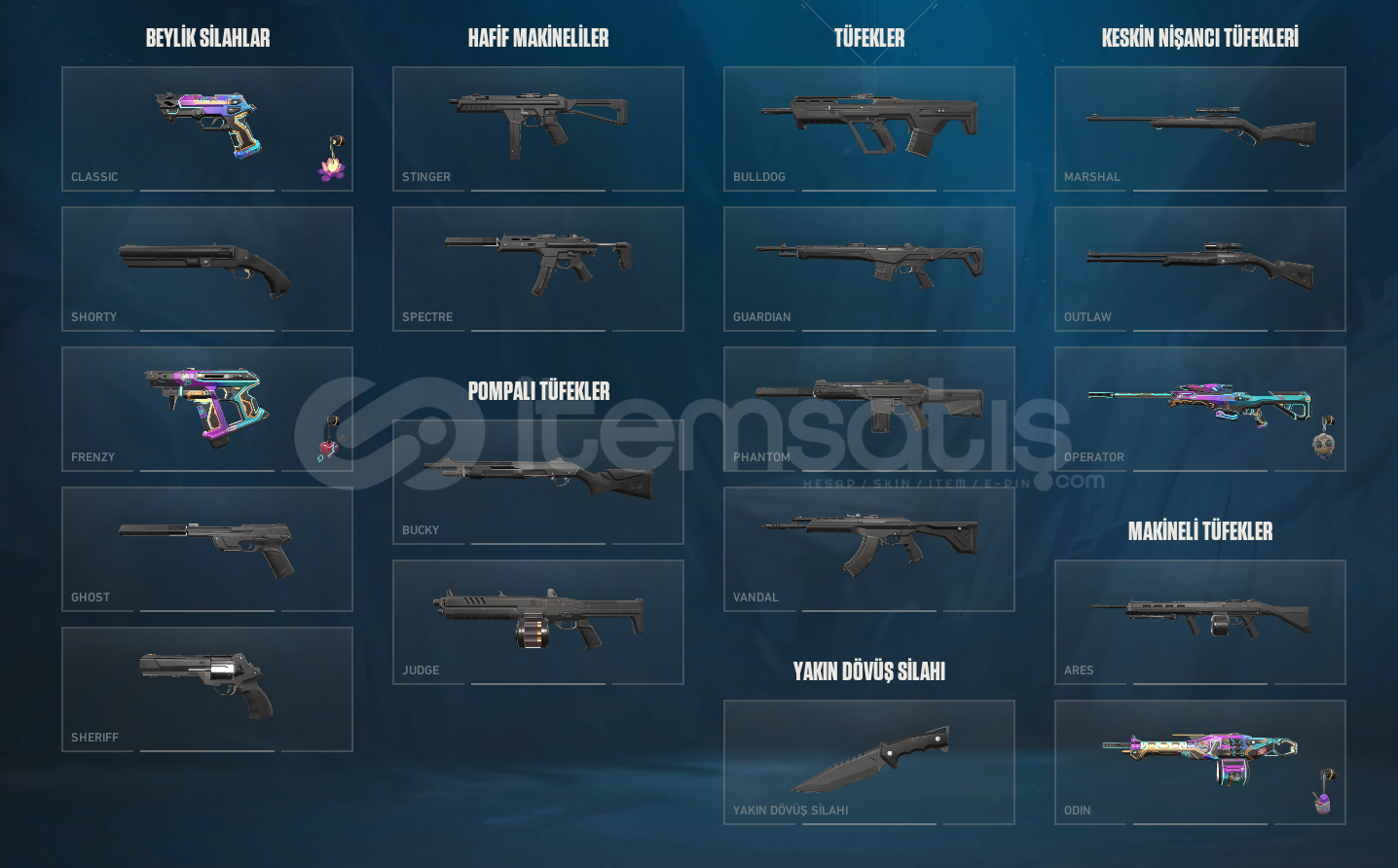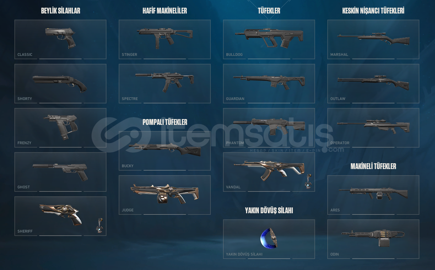 BU HESAPTA VAR OLAN TÜM SKINLER:CLASSIC: DELİPOP, ASİL, YERÇEKİMSEL URANYUM, +2 SAVAŞ BİLETİ SKİNİSHORTY: KAOS, +2 SAVAŞ BİLETİ SKİNİFRENZY: BLASTX, DELİPOP, İYON, +3 SAVAŞ BİLETİ SKİNİGHOST: GAIA'NIN İNTİKAMI, YAĞMACI, ÖZEL HAREKAT, +5 SAVAŞ BİLETİ SKİNİSHERIFF: KIZIL MUSİBET, YAĞMACI, ZAMANIN ÖTESİ, SİHİRPUNK,...