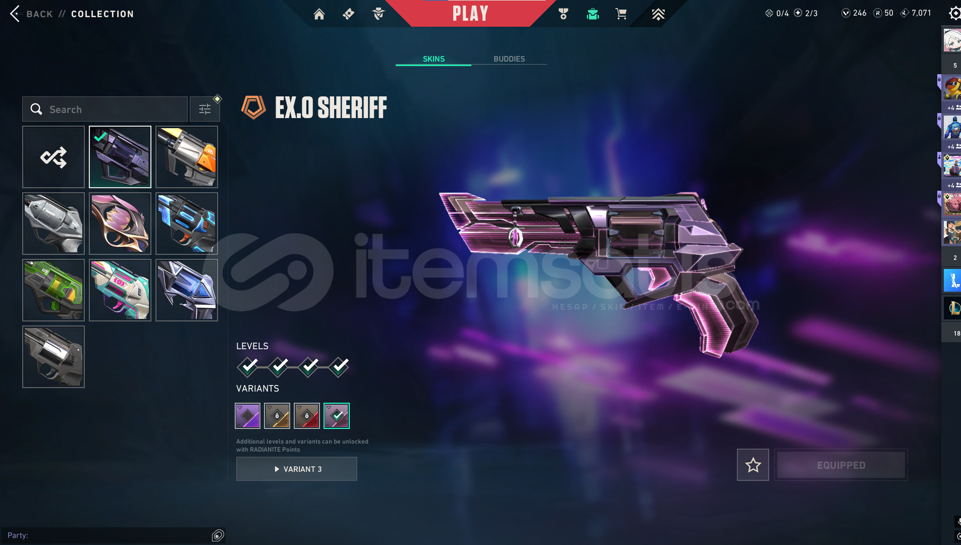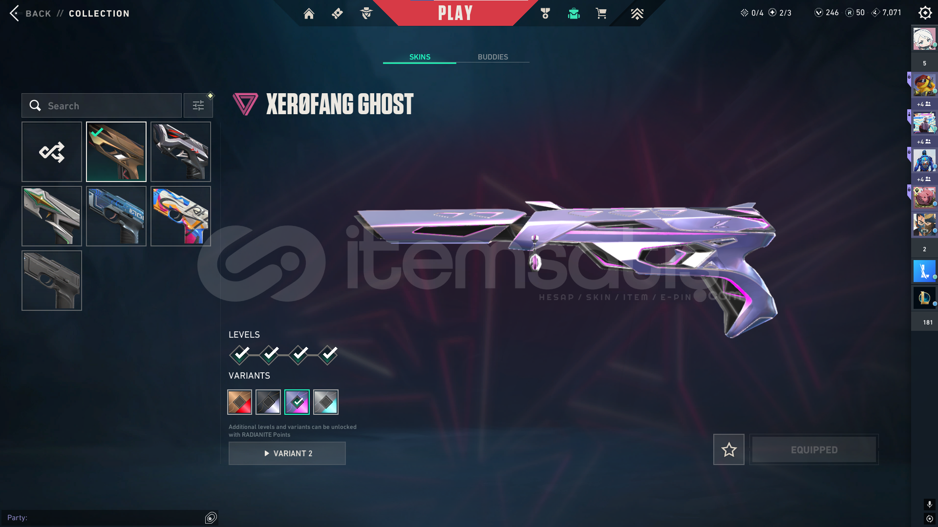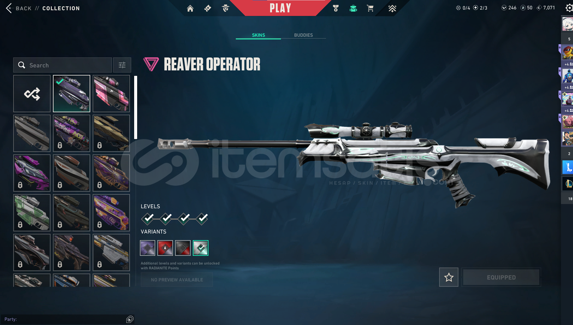70 skin vardır16 yükseltilebilir skin bulunmaktaClassics-Rgx 11Z Pro ClassicGhosts-Xerofang GhostSheriffs-Exo sherrif-Mystbloom sherrif-Ion sherrifGuardians-Reaver GuradianPhantoms-Recon PhantomVandals-Gaia`s Vengeance Vandal-Prime Vandal- Chaos Vandal-Imperium Vandal-Glitchpop Vandal-Kuronomi Vandal-Forsaken VandalOperators-Reaver OperatorKnifes-Xenohunter Knife-Prime 2.0 Karambit