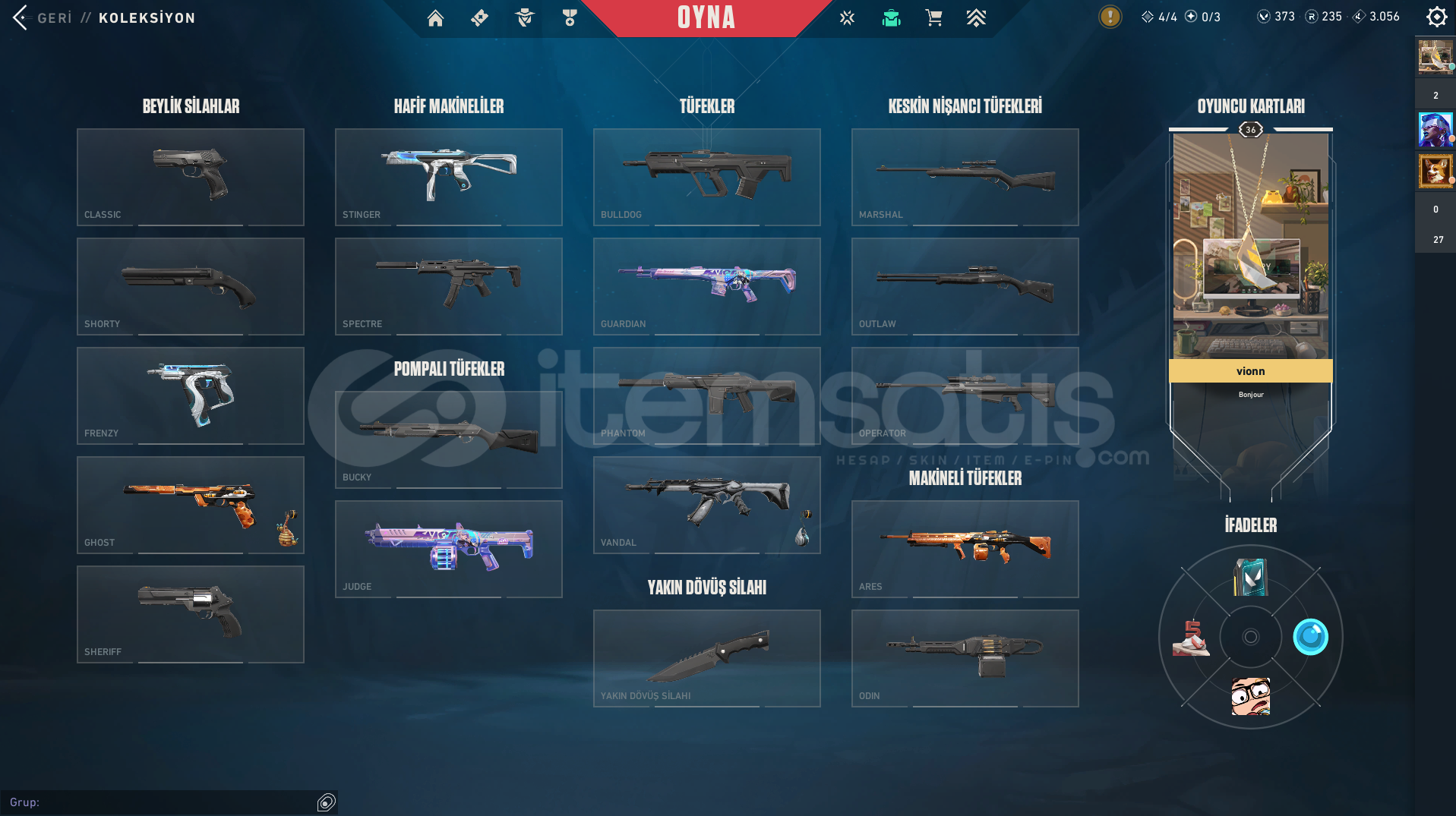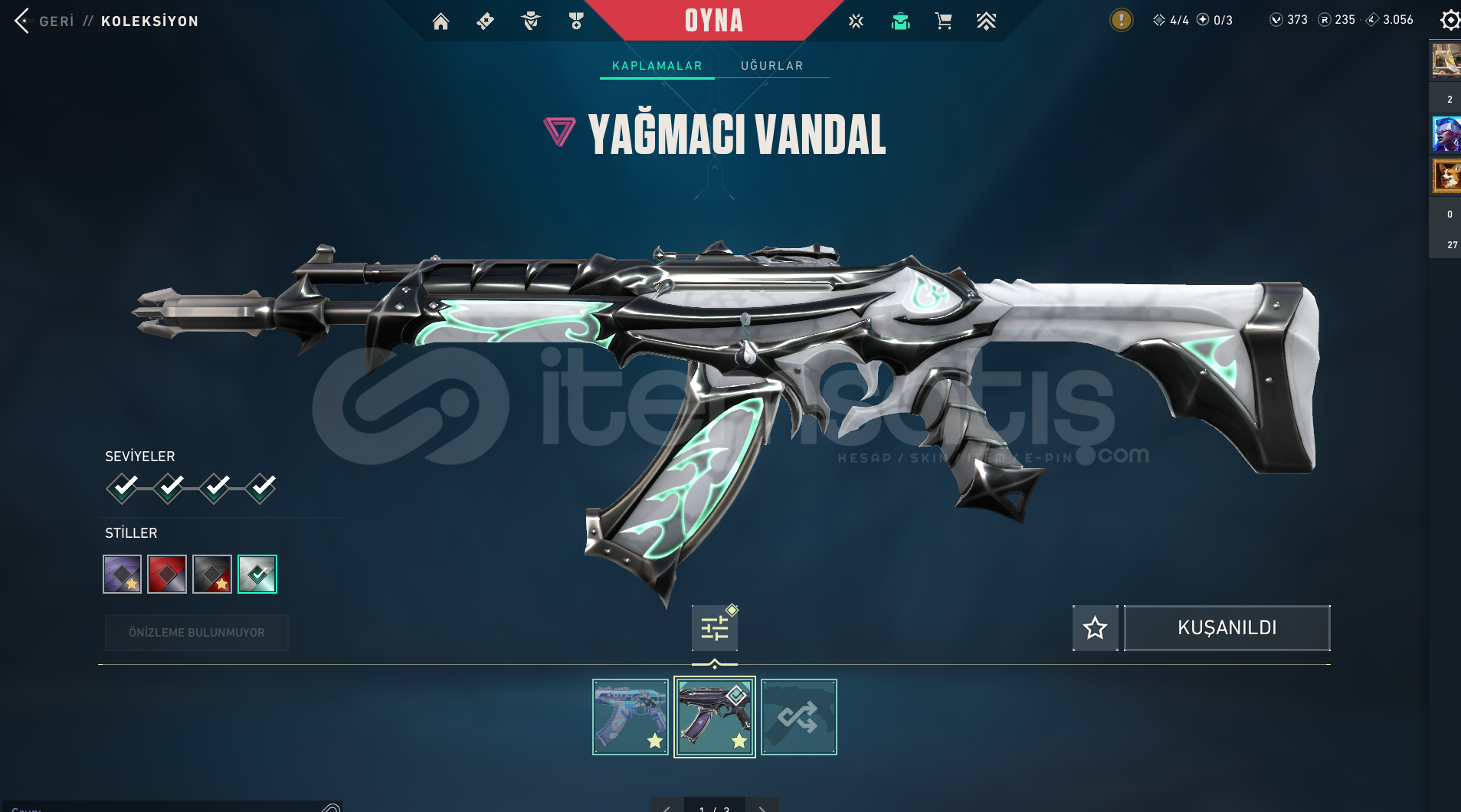 Hesap TR kurulumdur.Hesapta Yağmacı Vandal bulunmaktadır ve tüm yükseltmeler, renkler açıktır.Ekstra 373 VP bulunmaktadır. Üstüne eklemeyle harcayabilirsiniz.36 Level hesaptır. MMR ortalamadır.Mainlemelik güzel hesaptır pişman olmazsınız.Hesap İçerisindeki Skinler:Ahenk FrenzyMermi Kovan GhostAhenk StingerPopstar JudgeMermi Kovan JudgePopstar Guardian Yağmacı VandalPopstar VandalAhen...