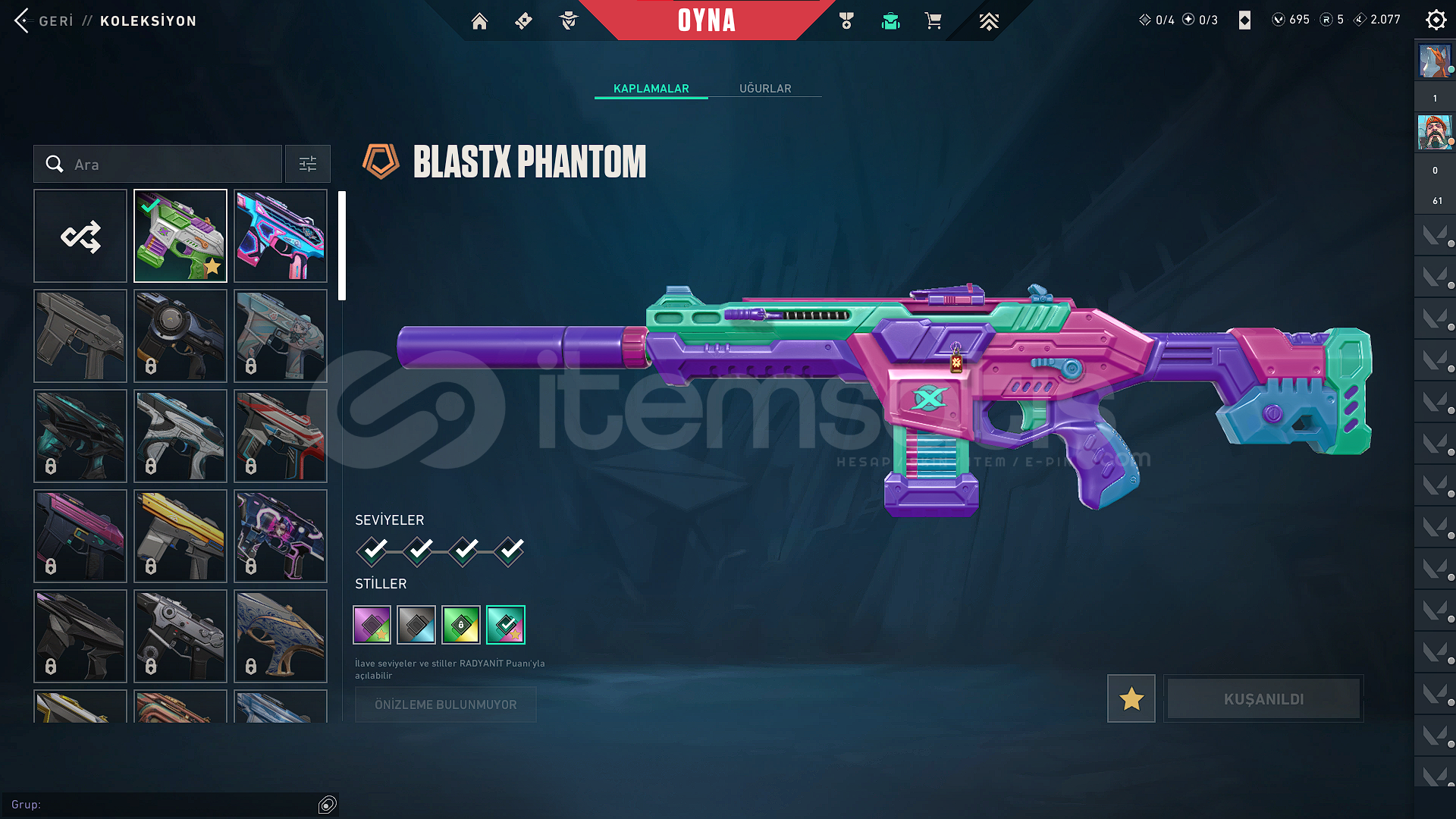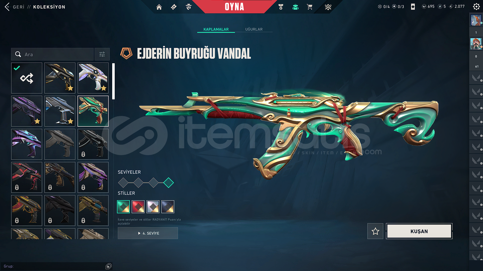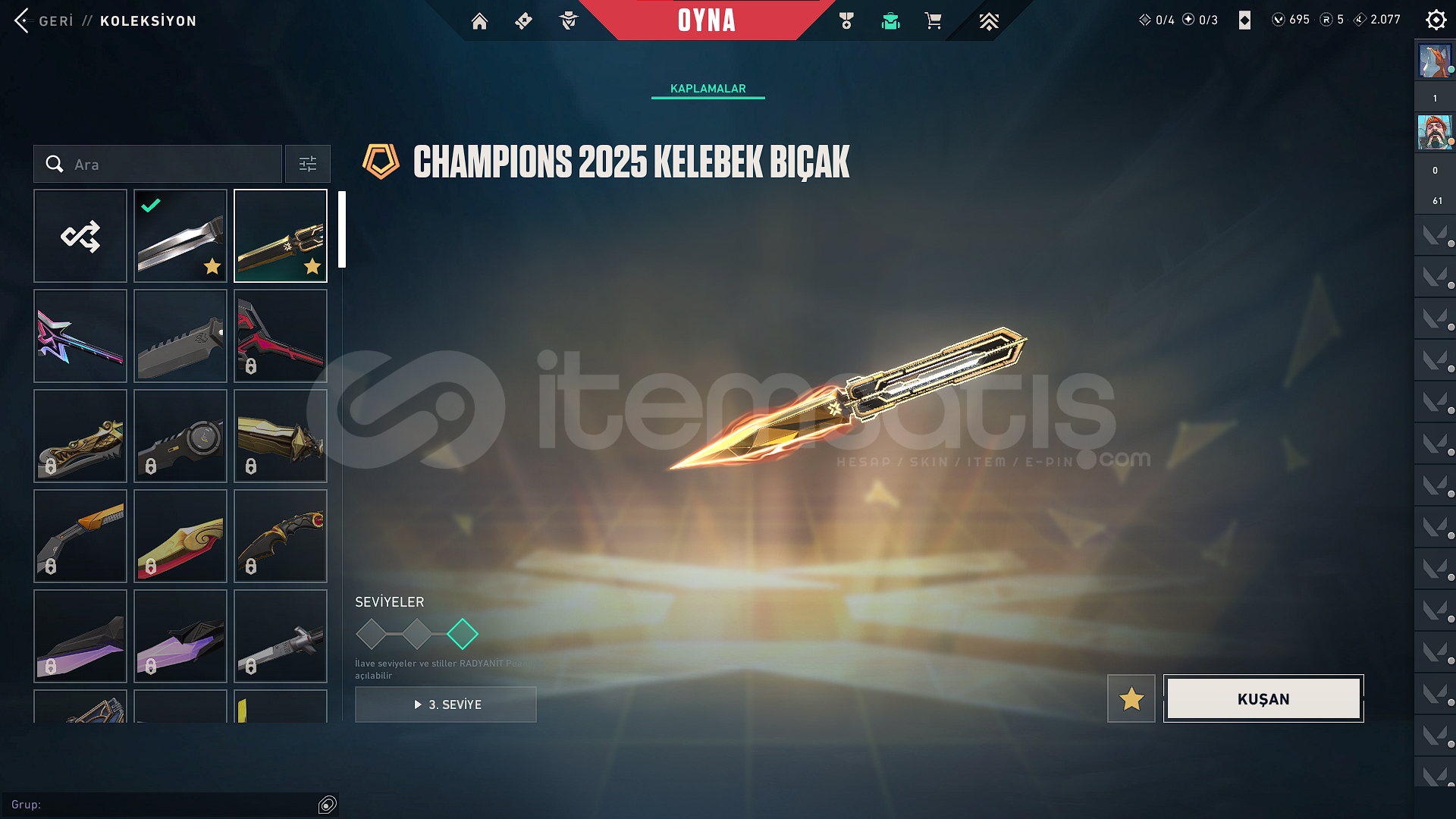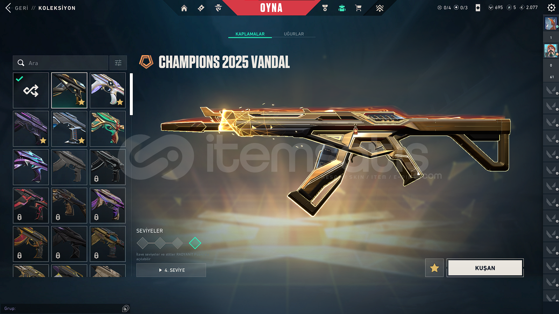 VANDAL SKİNLERİ:*KURONAMİ VANDAL*EVORİ VANDAL*CHAMPİONS 2025 VANDAL*EX.O VANDAL*EJDERİN BUYRUĞU VANDALBIÇAKLAR:*CHAMPİONS 2025 KELEBEK BIÇAK*FAZ KORUYUCU BIÇAĞIPHANTOM:*BLASTX PHANTOM*KURONAMİ SPECTRE*EVORİ ODİN*YAĞMACI OPERATÖR*ZİFİRİ BULLDOGBATTLE PASS AÇIK VE FULLENMİŞTİRHESABIN RANKI GOLD 1