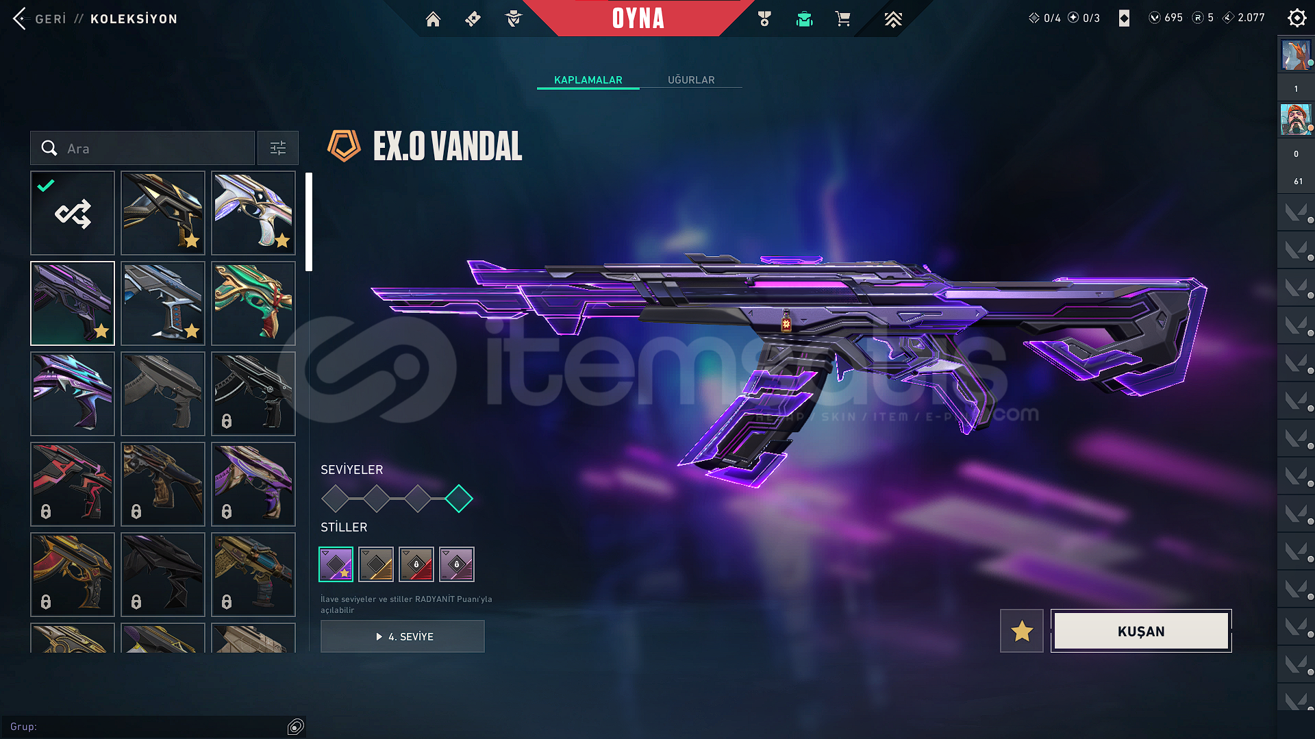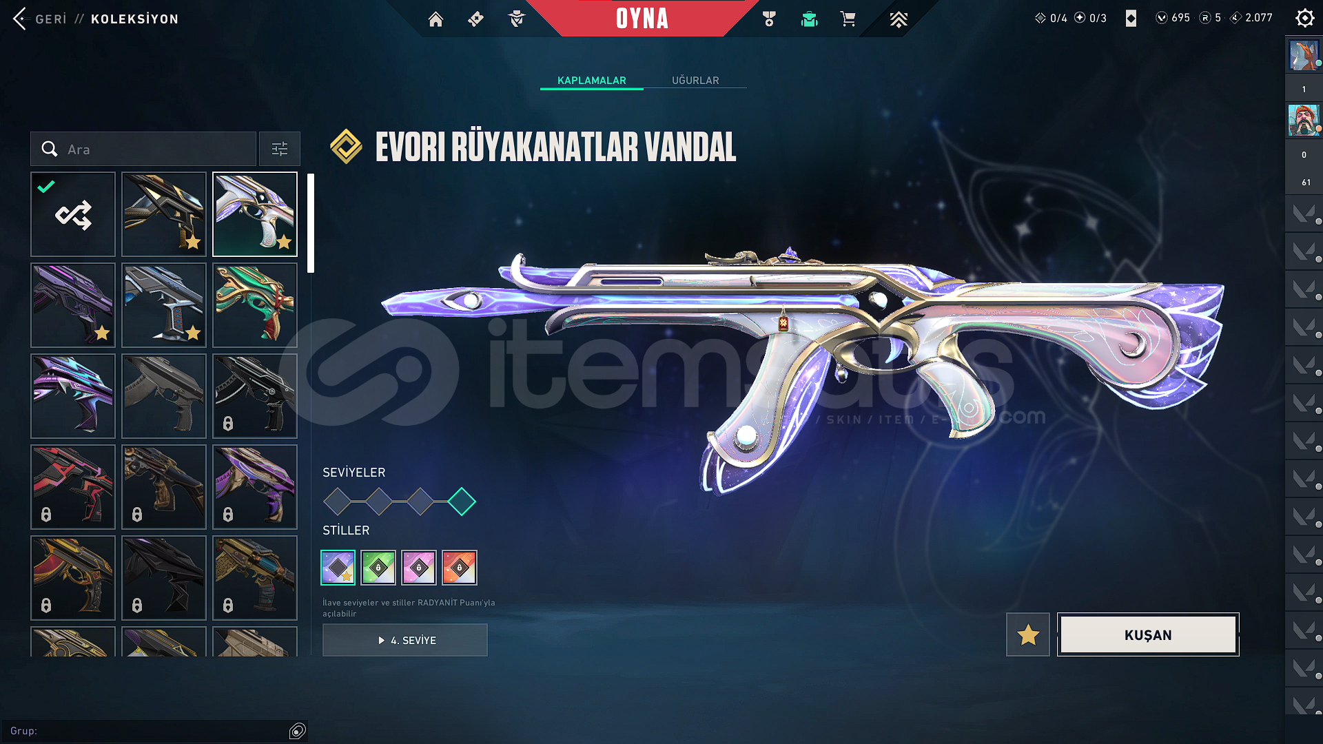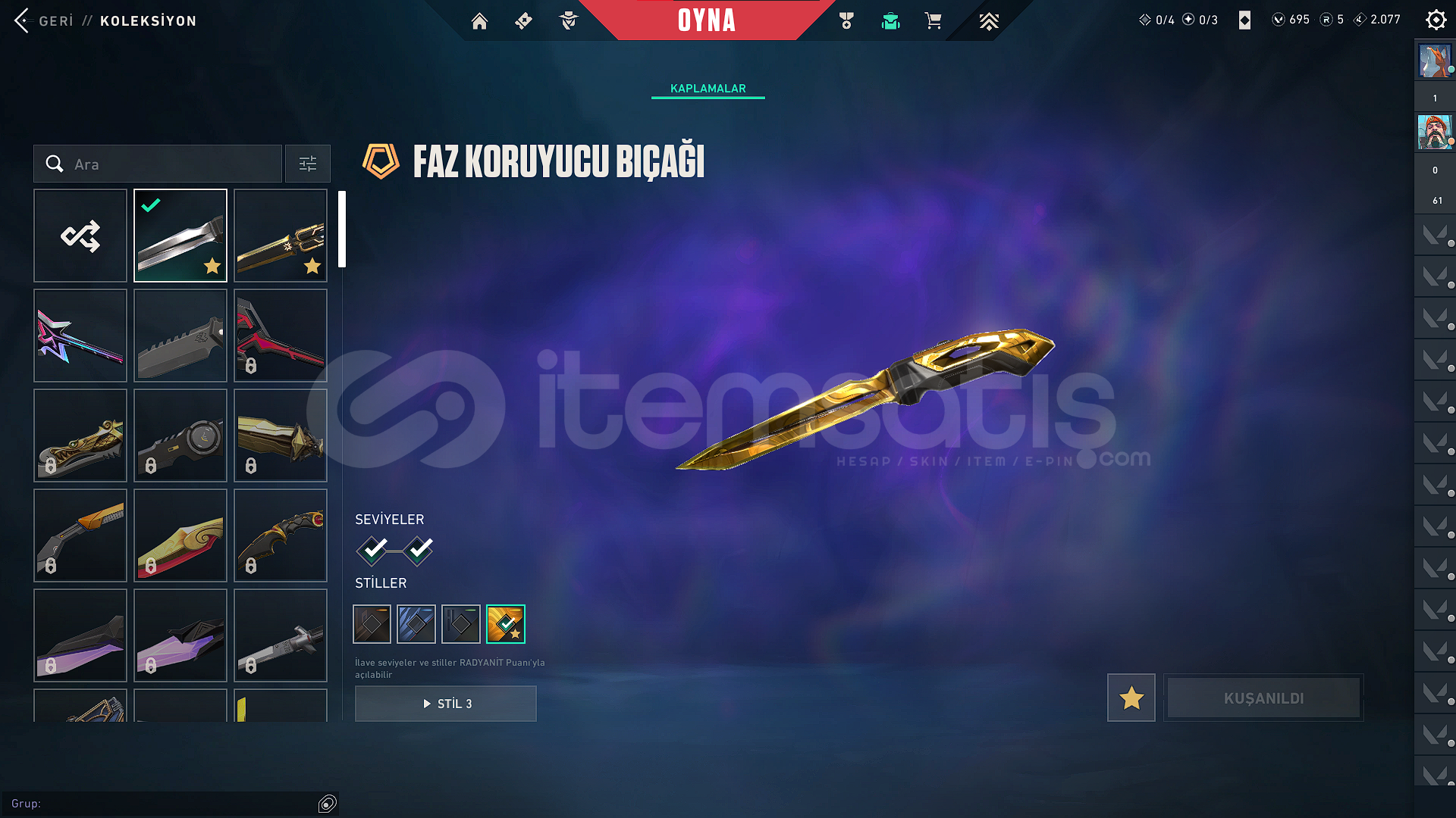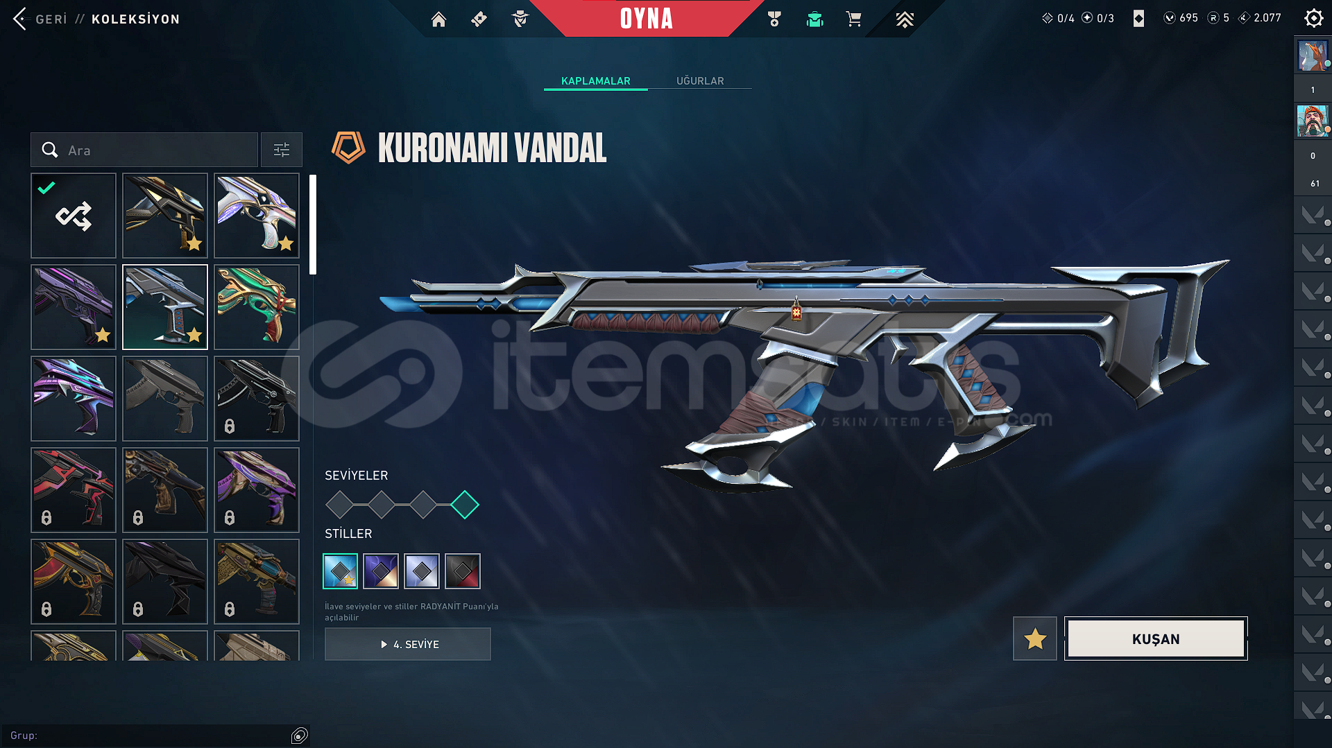 VANDAL SKİNLERİ:*KURONAMİ VANDAL*EVORİ VANDAL*CHAMPİONS 2025 VANDAL*EX.O VANDAL*EJDERİN BUYRUĞU VANDALBIÇAKLAR:*CHAMPİONS 2025 KELEBEK BIÇAK*FAZ KORUYUCU BIÇAĞIPHANTOM:*BLASTX PHANTOM*KURONAMİ SPECTRE*EVORİ ODİN*YAĞMACI OPERATÖR*ZİFİRİ BULLDOGBATTLE PASS AÇIK VE FULLENMİŞTİRHESABIN RANKI GOLD 1