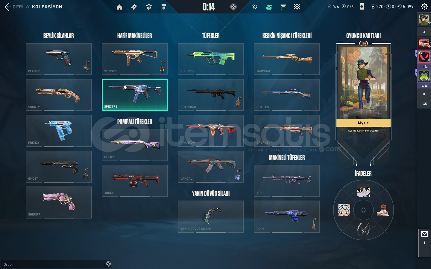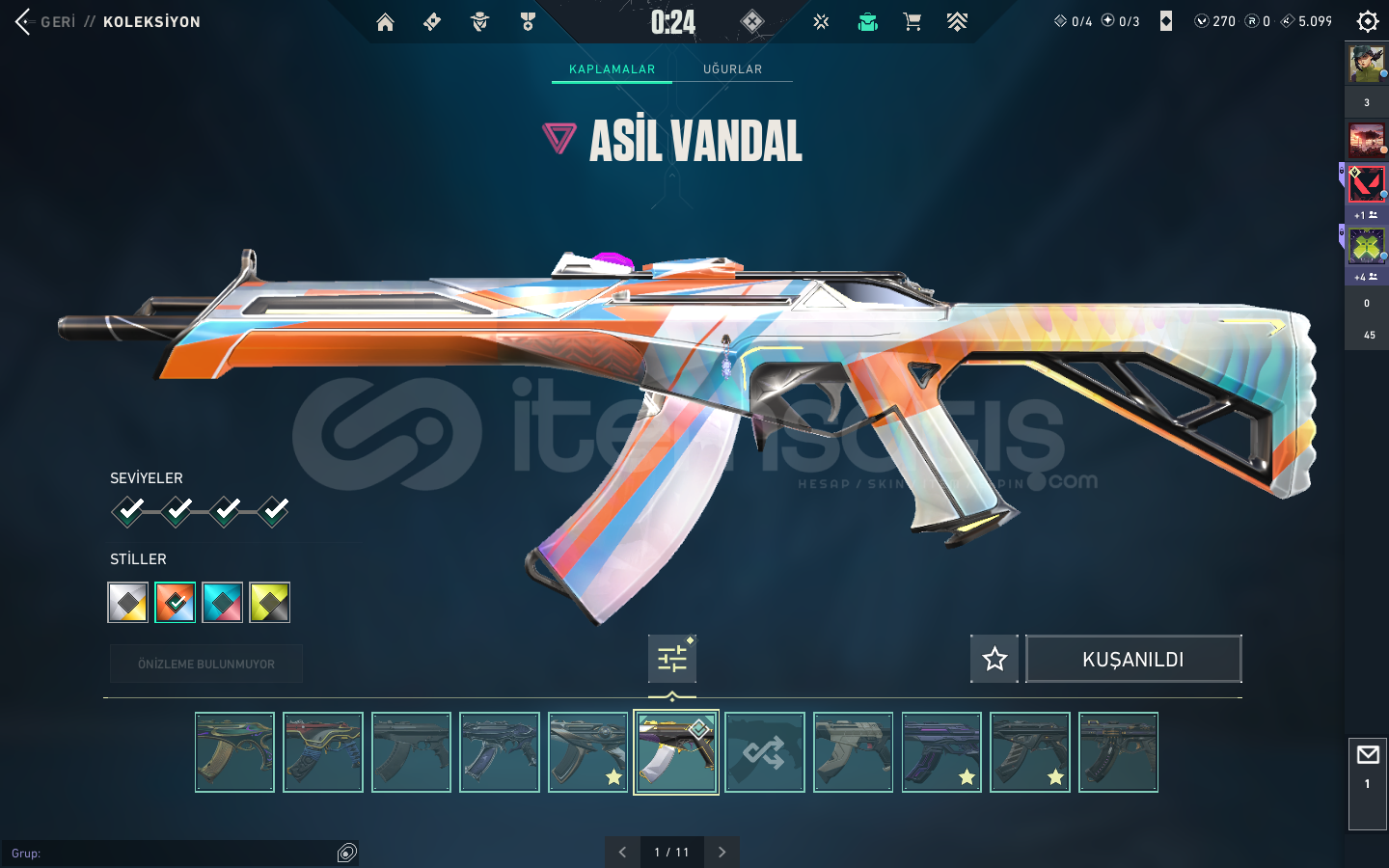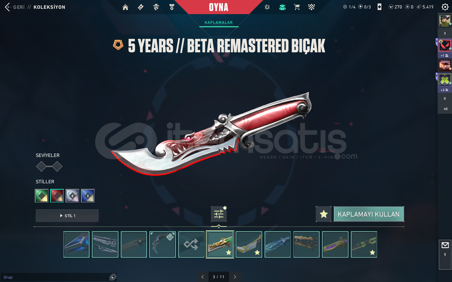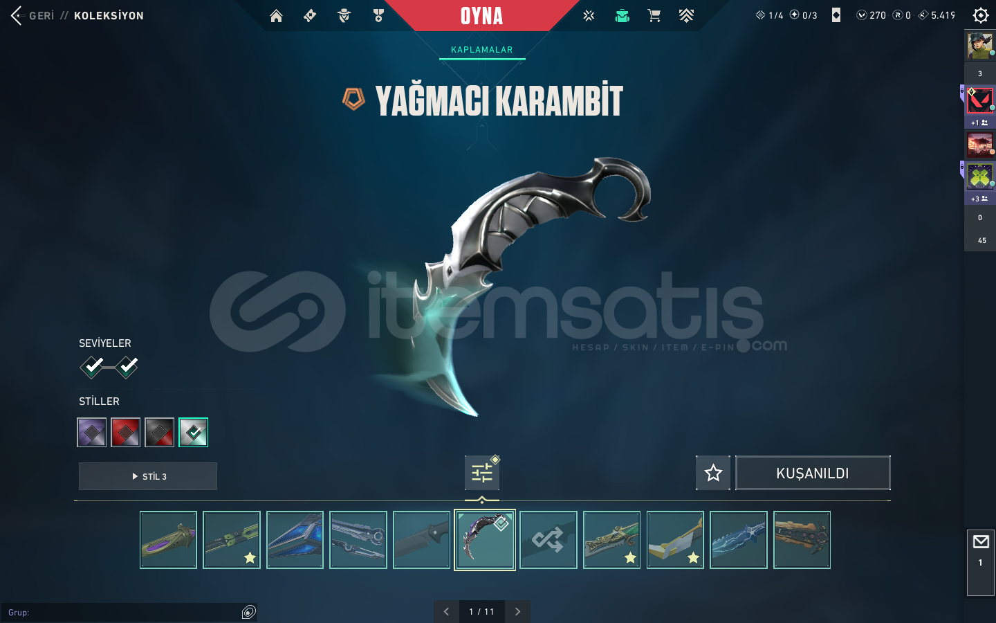 KAOS VANDAL , YAĞMACI VANDAL , ASİL VANDAL , EXO VANDAL , FAZ KORUYUCU VANDAL , YAĞMACI PHANTOM , SERİ TETİK PHANTOM VE SAVAŞ BİLETİ VANDALLARI BULUNMAKTABIÇAK KISMINDA İSE ; YAĞMACI KARAMBİT , ASİL KARAMBİT , RGX KELEBEK , KAOS KILICI , 5.YIL BIÇAĞI VE BİR KAÇ ADET DE SAVAŞ BİLETİ BIÇAĞI BULUNMAKTA.ASİL CLASSİC , ULUPENÇE GHOST , FAZ KORUYUCU GHOST , YILDIZ...