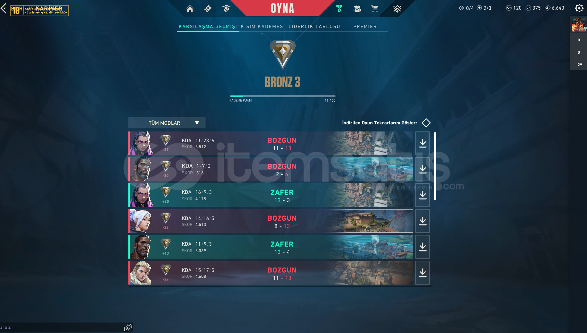 Ürün Hakkında Bilgi;İLANI SATIN ALDIĞINIZDA 7/24 OTOMATİK OLARAK TESLİM EDİLİR.RANK - BRONZ 3HESAP SEVİYESİ - 113SKİN SAYISI - 7VP SAYISI - 120+ 100.000 BAŞARILI İŞLEM İLE GÜVENLE ALIŞVERİŞ YAPABİLİRSİNİZ