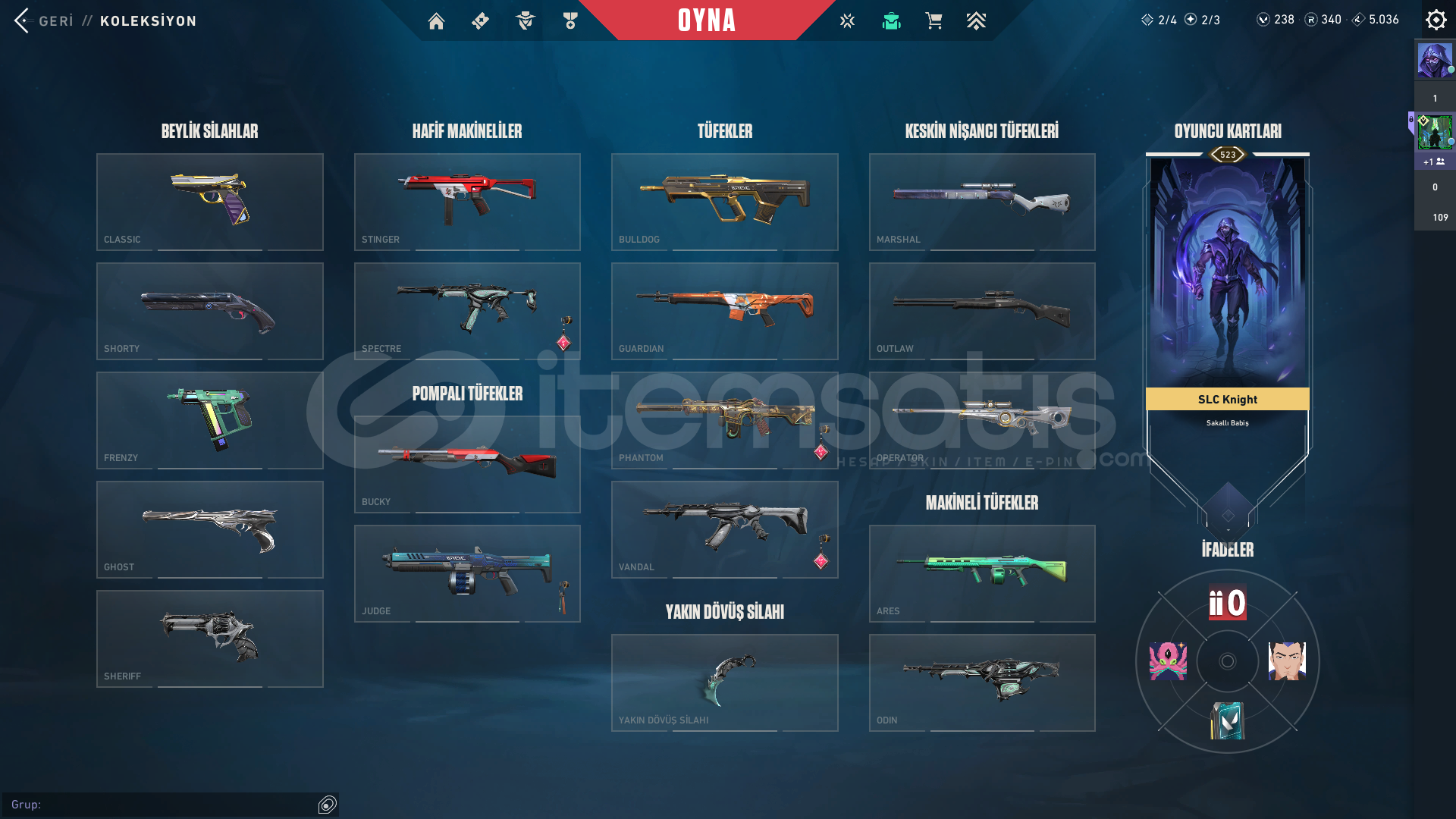 Hesapta;Vandal=yağmacı/asil/ejder/champions 23Phantom=yağmacı/oniClassic=asil/spectrumGhost=fatih/yağmacıSheriff=yağmacı/seri tetik/sihirpunk/zamanın ötesiSpectre=yağmacıOperator=kökenMarshall=seri tetikOdin=yağmacıBıçak=yağmacı/karaborsa bulunmaktadır. Pazarlık payı vardır. Peak rankı immo 3 359 kpdir güncel rank yüce 3tür, 523 leveldir.