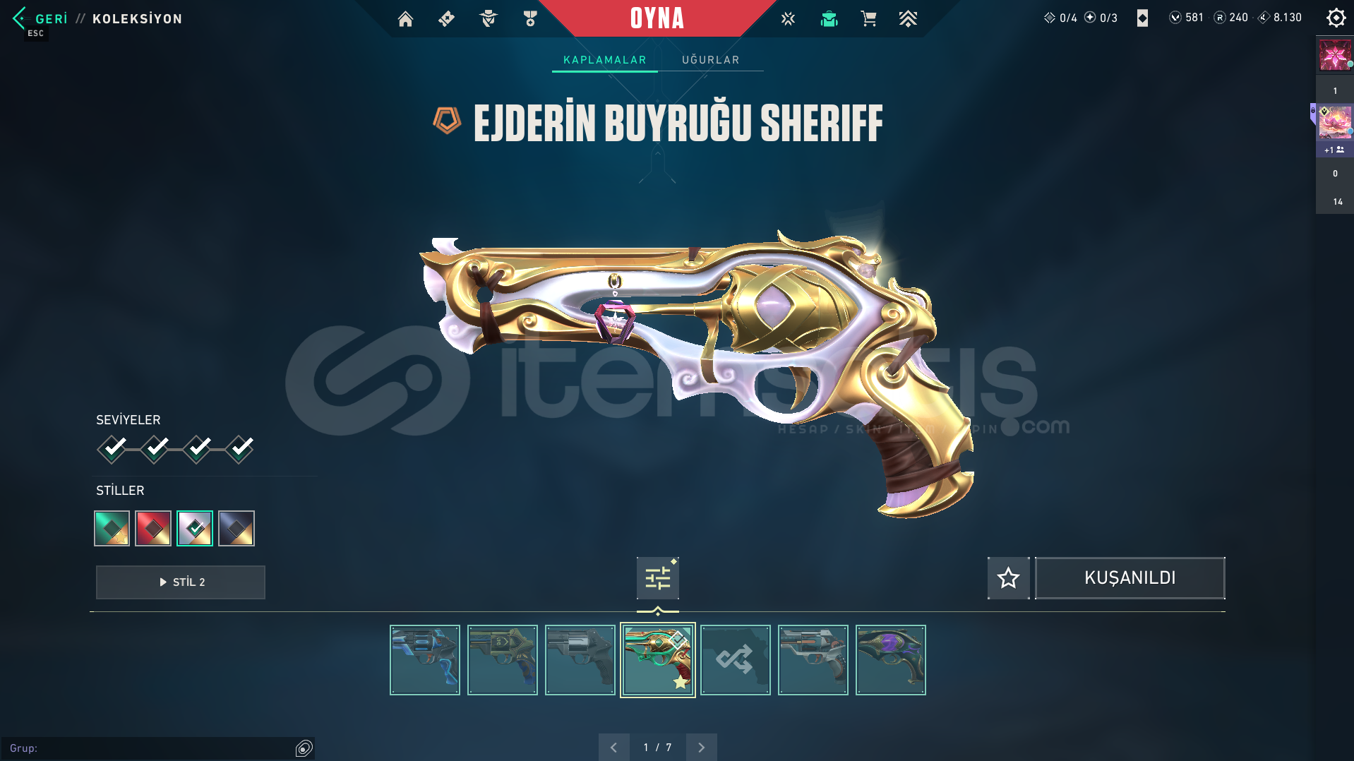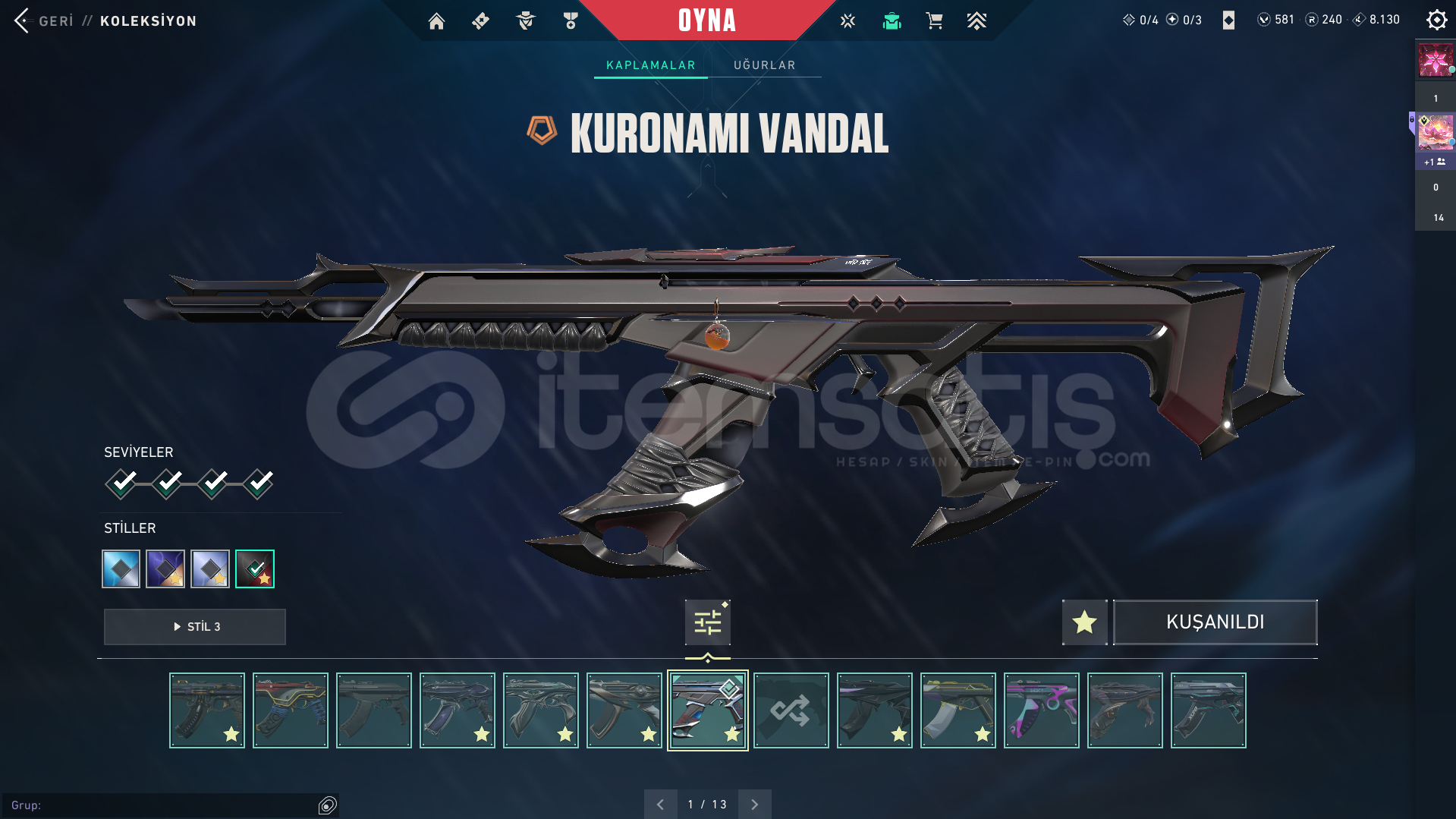 İçinde;-VCT Karambit 2025 - Asil Karambit - Onı Katana - Seri Tetik Balta - Yağmacı Karambit-Kronomi Vandal - Anomali Vandal - Asil Vandal - Ejder Ateşi Vandal - Kaos Vandal - Onı Vandal - Yağmacı Vandal - Yitik Vandal - Zamanın Ötesi Vandal-Özel Harekat Phantom - Delipop Phantom-Ejderin Buyruğu Sherif-Cesur Yürek Ghost-Onı Buldog - Onı Ares - Onı Frenzy-Yitik Operator