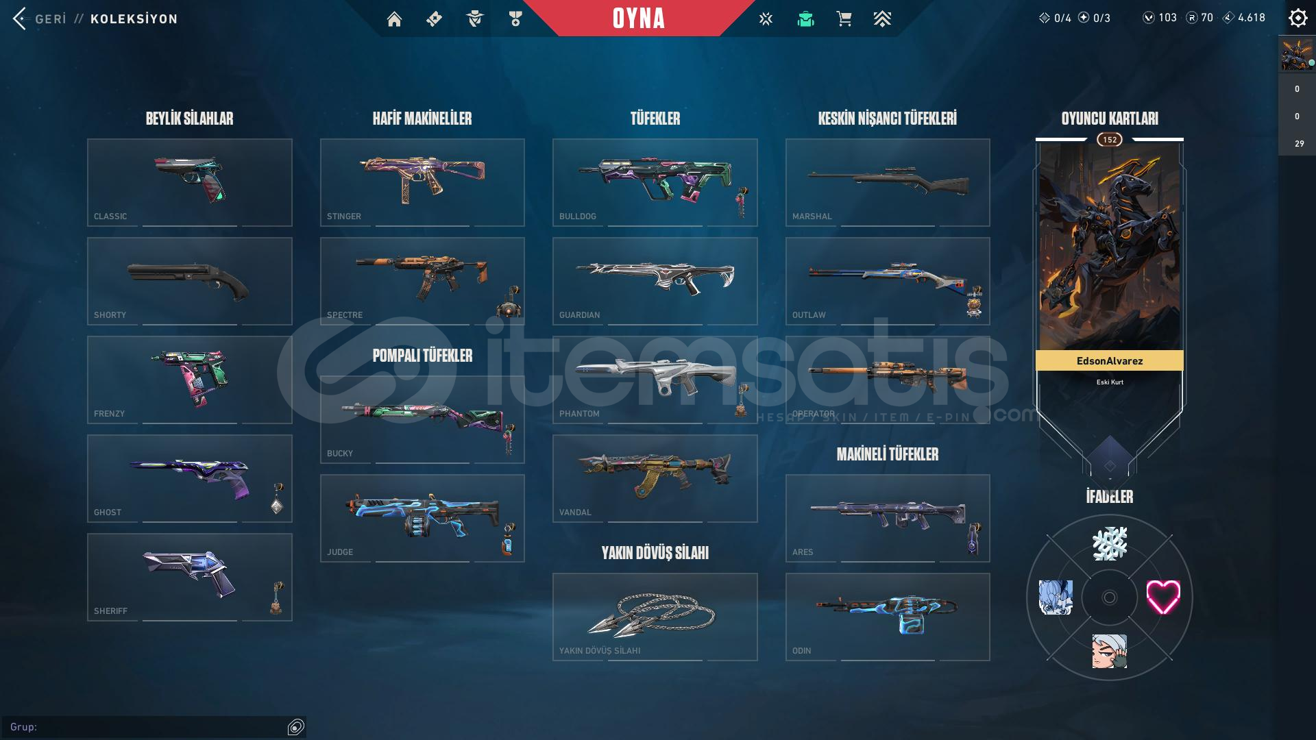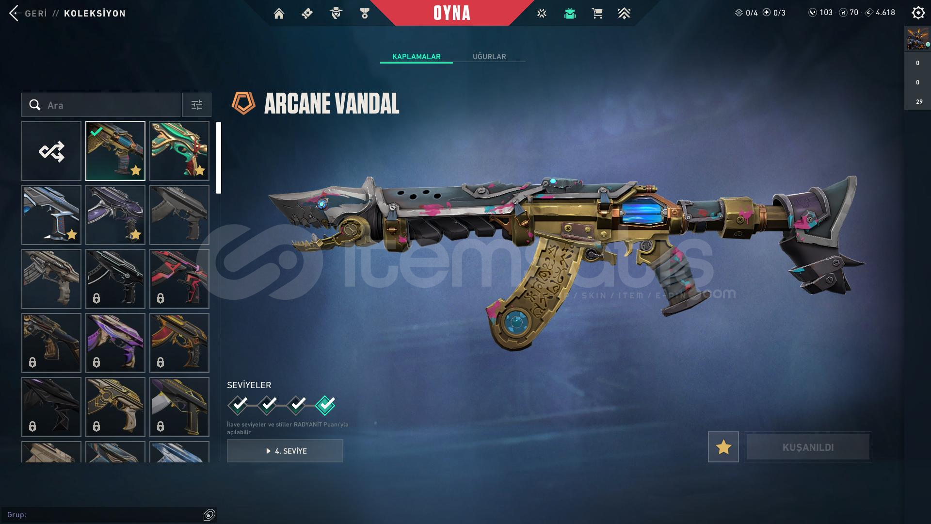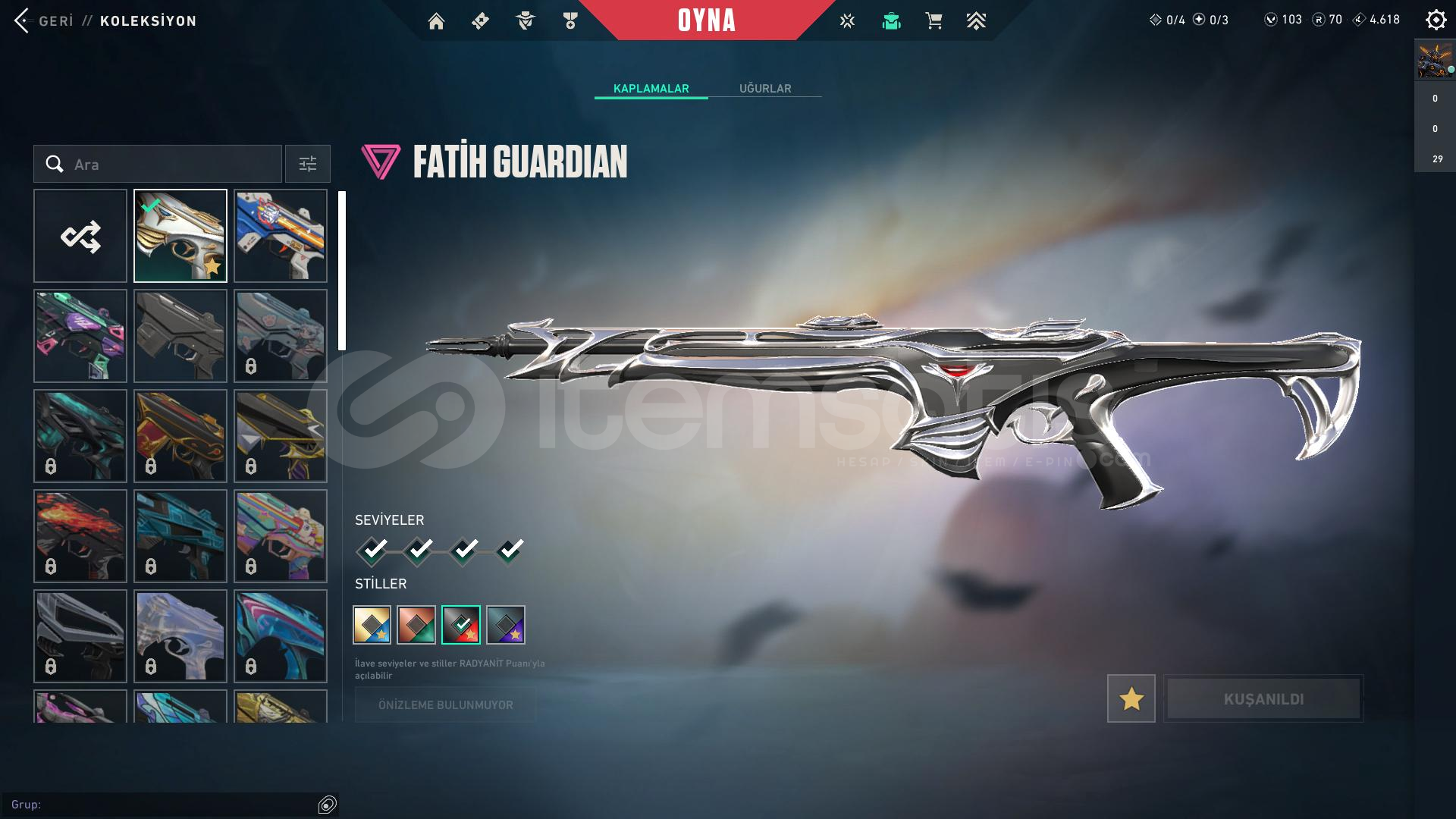 Hesap TR serveri, Ban yok, mail şifre değişir, fiyatta pazarlık vardır, hesap içerisinde 103 VP vardır, rank gümüş3, Sorularınız için mesaj atınız, hesap içerisindeki skinler :Vandal: Arcane Vandal, Yağmacı Vandal, Kuronami Vandal, Ejderin Buyruğu Vandal, Soğuk Çelik VandalPhantom: İyon Phantom, Sihirpunk Phantom, Uzay Geçidi PhantomBıçak: Asil Karambit, Yı...