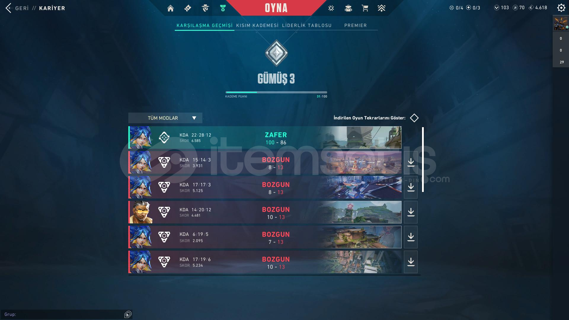 Hesap TR serveri, Ban yok, mail şifre değişir, fiyatta pazarlık vardır, hesap içerisinde 103 VP vardır, rank gümüş3, Sorularınız için mesaj atınız, hesap içerisindeki skinler :