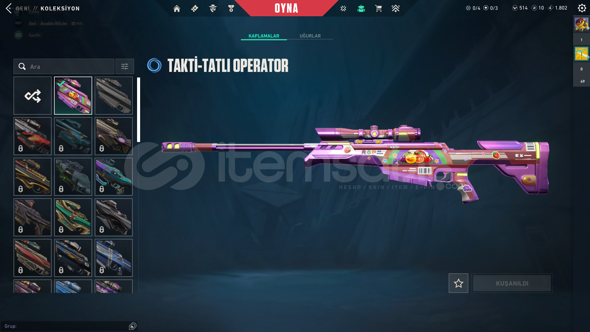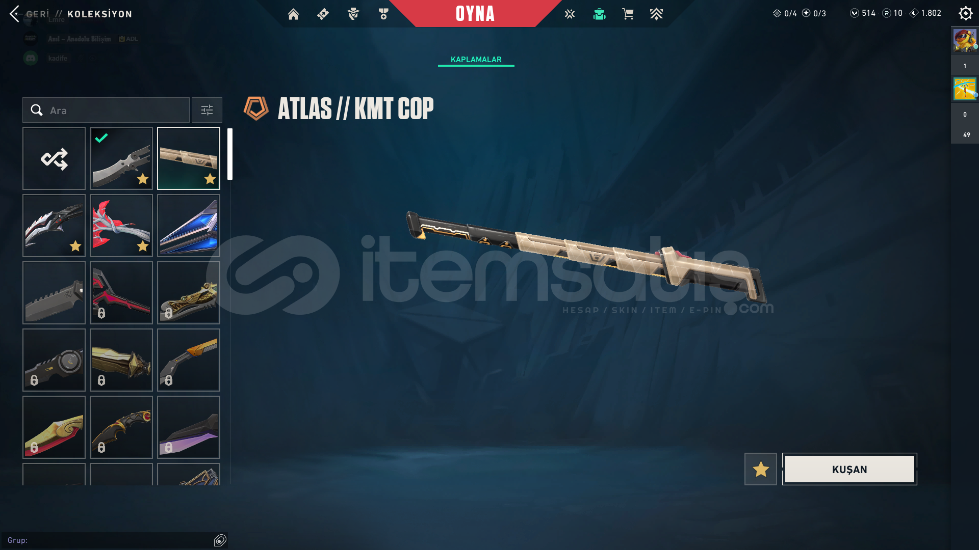 Envanter Detayı ▼Vandal → Kuronami Vandal - Anomali Vandal - Ex.o Vandal - Felaketin Kalbi Vandal - Ulupençe Vandal - Atlas Vandal - Ecelin Isırığı Vandal | 7x SkinsBıçaklar → Gaıa'nın Hiddeti - Karaborsa Kelebek - KMP Cop - Solarex Yadigarı - Ecelin Isırığı | 5x SkinsPhantom → Şimşek Phantom - Kıvrak Bela Phantom - Solarex Phantom - Sükunet P...