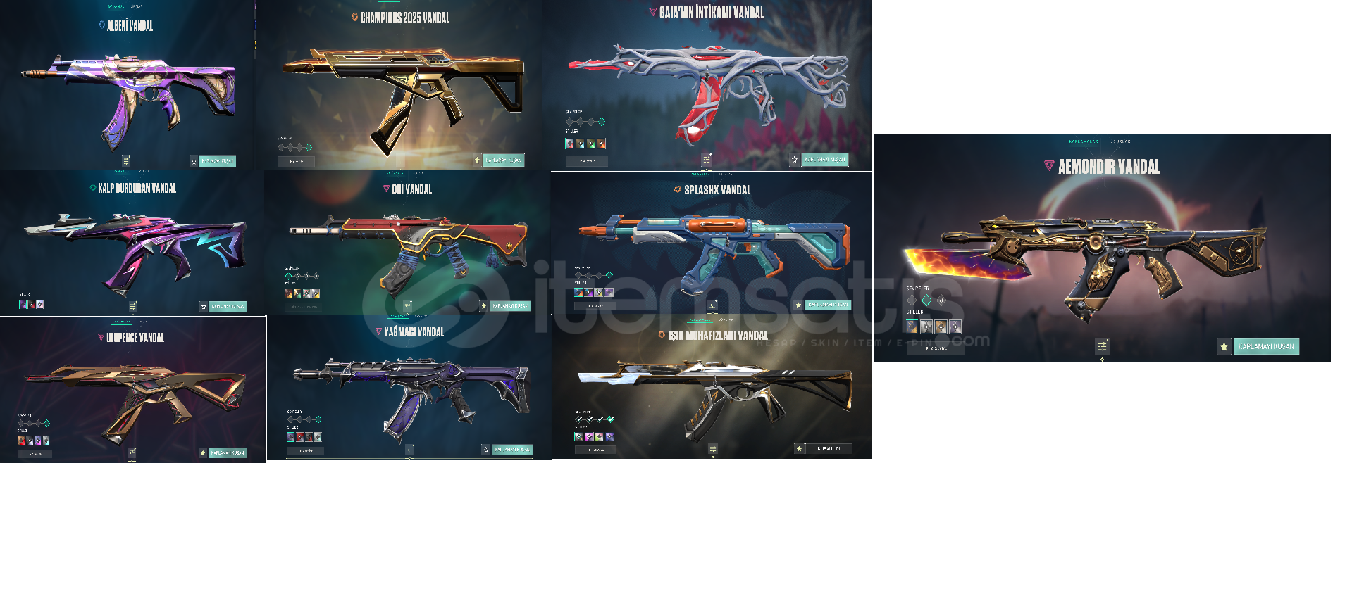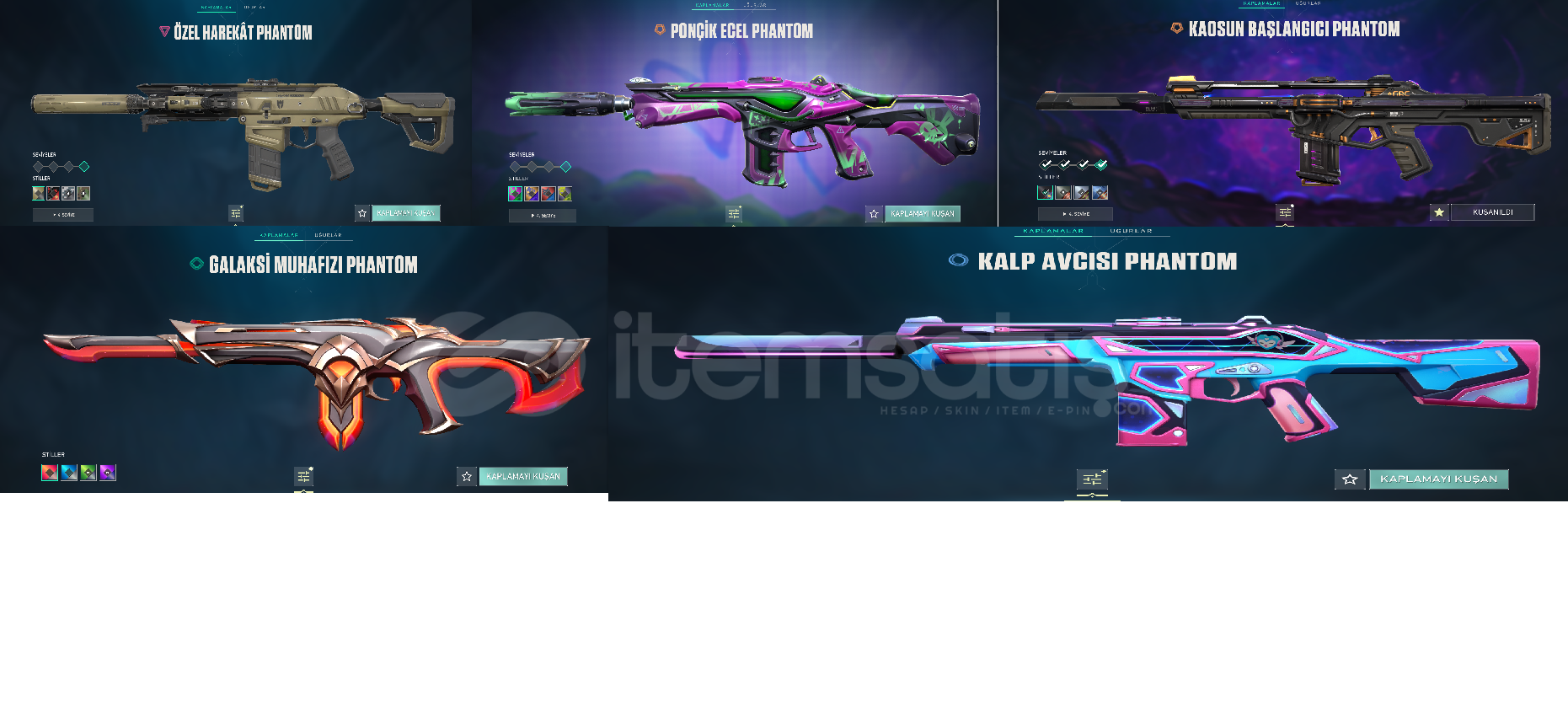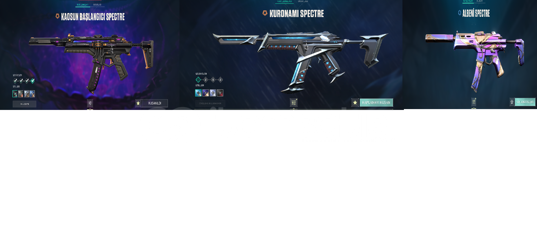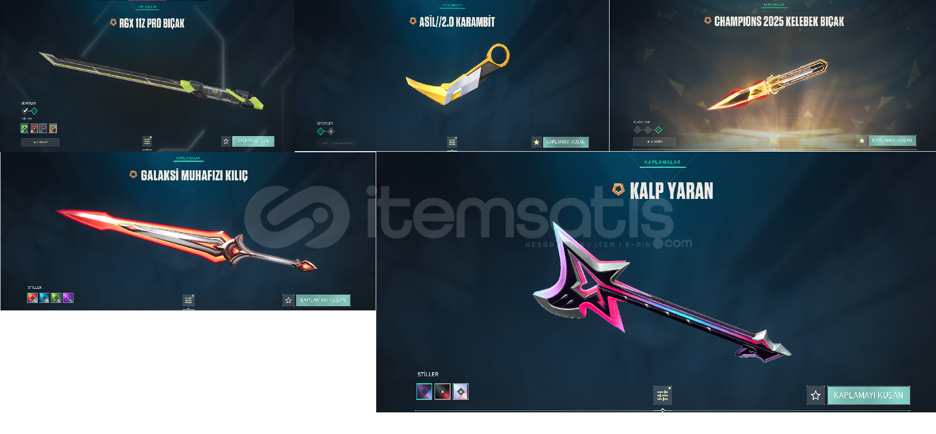 1.Rgx11Z PRO BIÇAK 2.ASİL/2.0KARAMBİT3.CHAMPİONS KELEBEK 4.GALAKSİ MUHAFIZI KILIÇ(BATTLEPASS)5.KALPYARAN BALTA(BATTLEPASS)6.GALAKSİMUHAFIZI CLASSİC(BATTLEPASS)7.KALP AVCISI SHORTY(BATTLEPASS)8.HALAFORM FRENZY9.SİHİRPUNK GHOST 10.KALPDURDURAN GHOST(BATTLEPASS)11.ALBENİ GHOST12.YAĞMACI SHERİFF 13.KIRIK KALP SHERIFF (BATTLEPASS)14.KAOS SPECTRE 15.KURONAMI SPECTRE  16.ALBENİ SPECTRE17.ÖZ...
