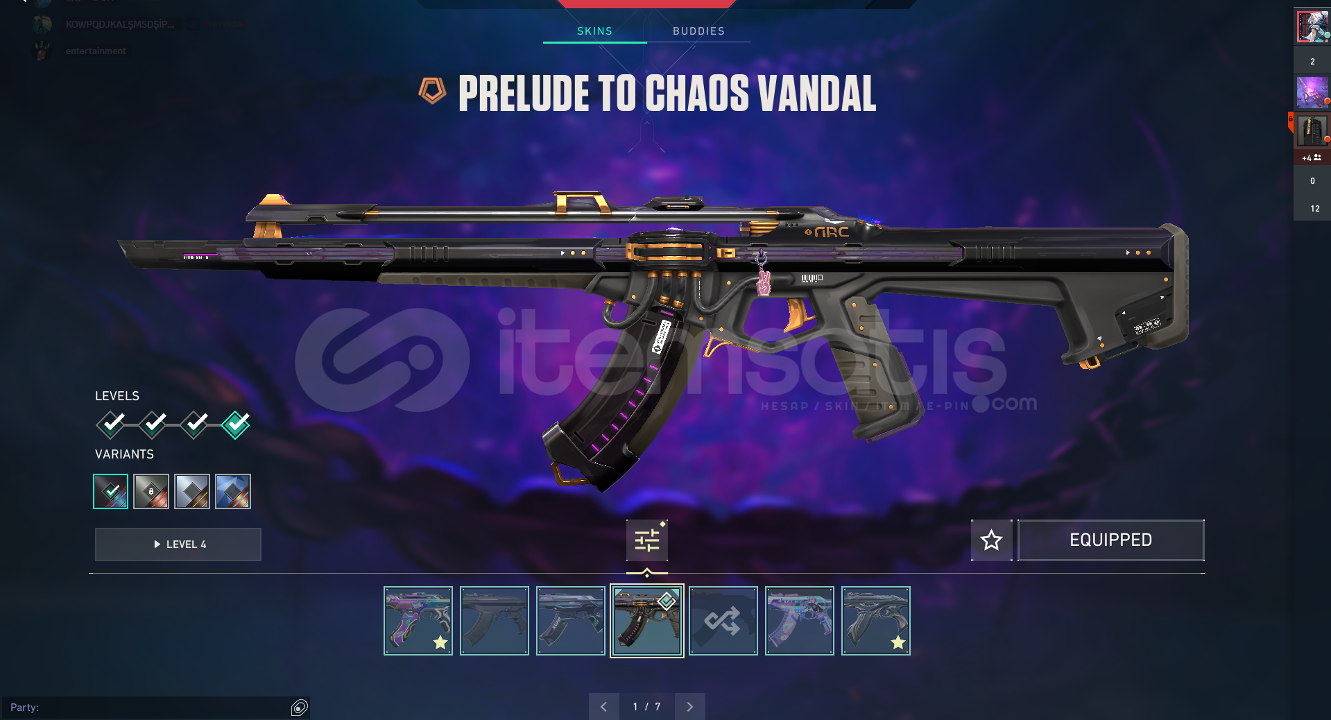 güvencem ile kalite asla tesadüf değildir...t@kas istekleri için gelmeyin asla kabul edilmeyecekTÜM ANİMASYONLU SKİNLER:BIÇAKLAR(4): VCT 2025 - Araxys Biyo-Atomizer - CHAMPİONS KELEBEK 2025VANDALLAR(7): KAOS - DELİPOP - YİTİK VANDAL PHANTOMLAR(4): YILDIZ BELASISHERİFFLER(4):  SERİ TETİK - YAGMACİOPERATÖRLER(5): CESUR YUREKGUARDİAN(3): GAİA MAİL DEVRED...