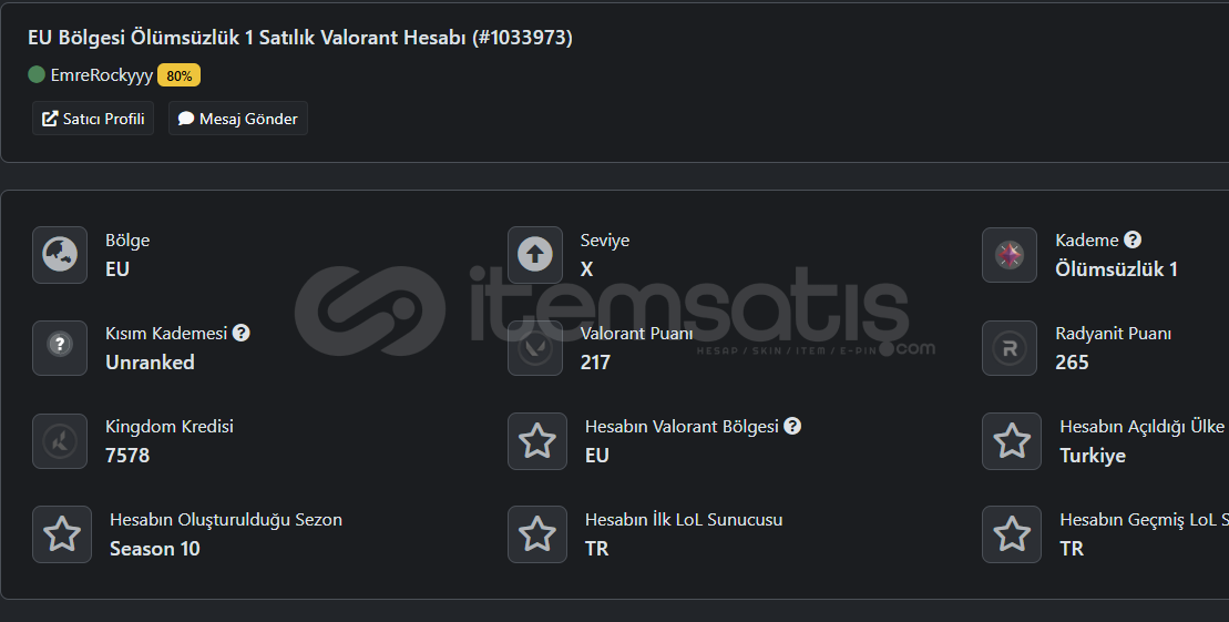 Merhaba, hesabımı borçlarımdan dolayı ucuzdan satıyorum. Hesabım TR Serveri ve rank immo. Herhangi bir ban ya da uyarı yemeyen hesaptır. Hesabın değerinin yarısından satıyorum. İlk Maili mevcut, alan arkadaşa şimdiden hayırlı olsun.