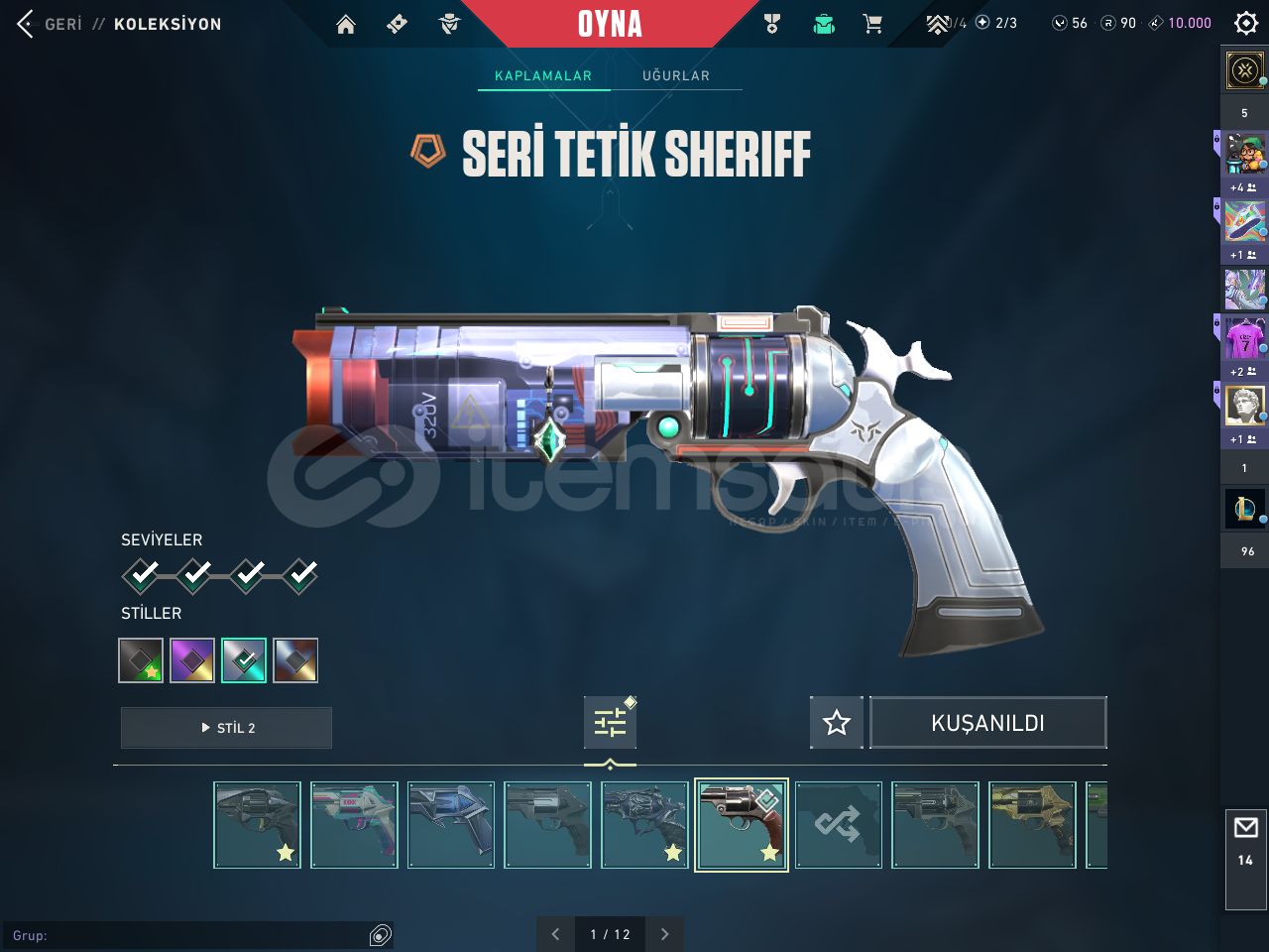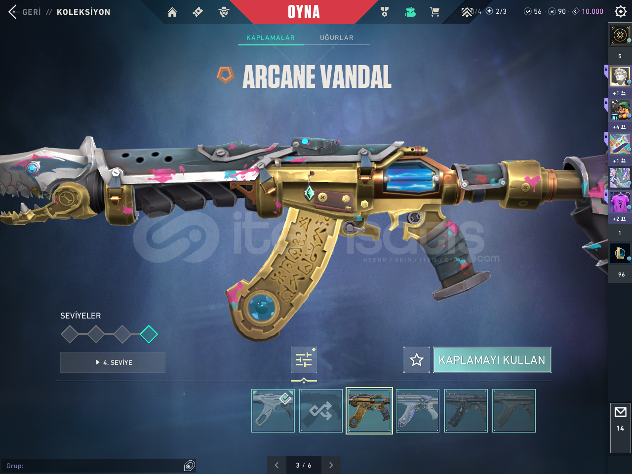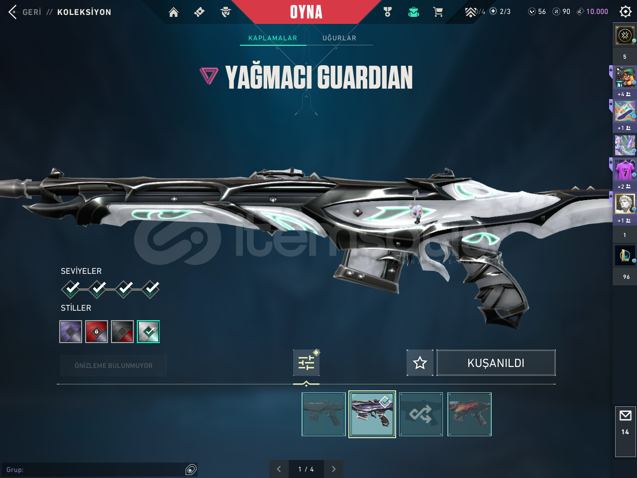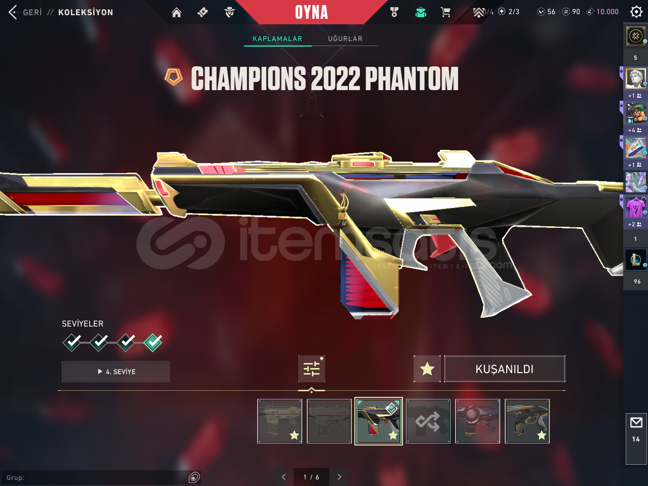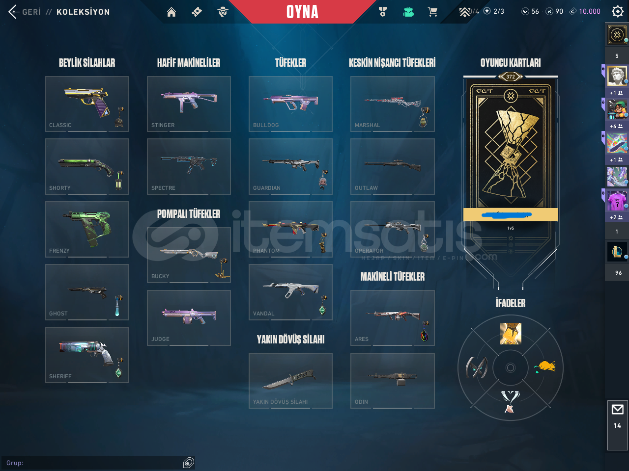 Hesapta Champions 2022 ve arcane seti mevcutturBıçaklar:Rgx Karambit Uzaylı avcısı bıçağı Arcane eldiven Champions 2022 kelebekVandal: Evori vandal Kaos vandal İyon vandal Arcane vandalPhantom:Özel harekat phantom Champions 2022 phantom champions 2024 phantomSherrif:Seri tetik sherrif protokol sherrif yağmacı sherrifClassic: Asil classicGhost:Ulupençe ghostGuardian:Yağmacı GuardianOperator:Yağmacı Ope...