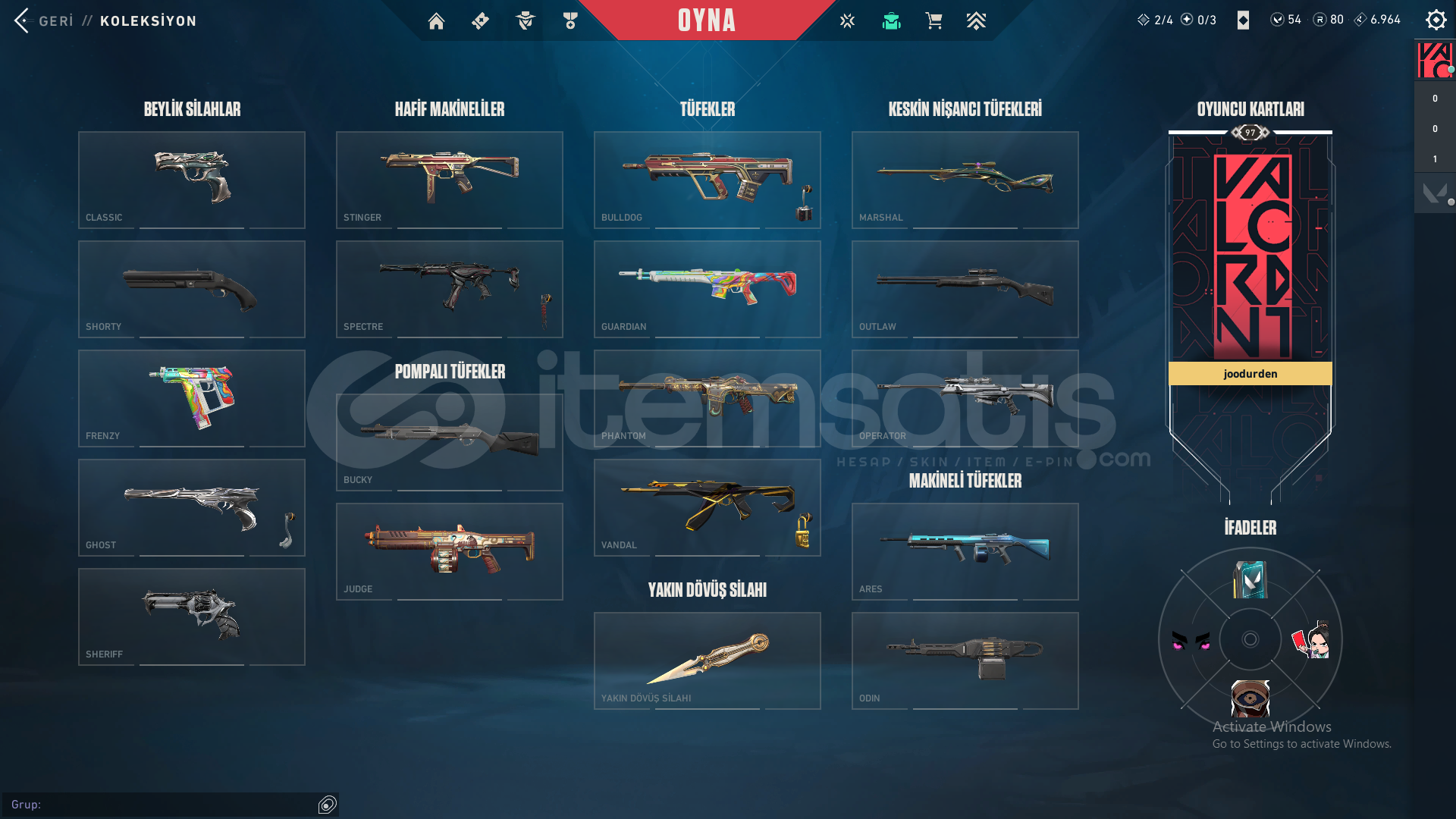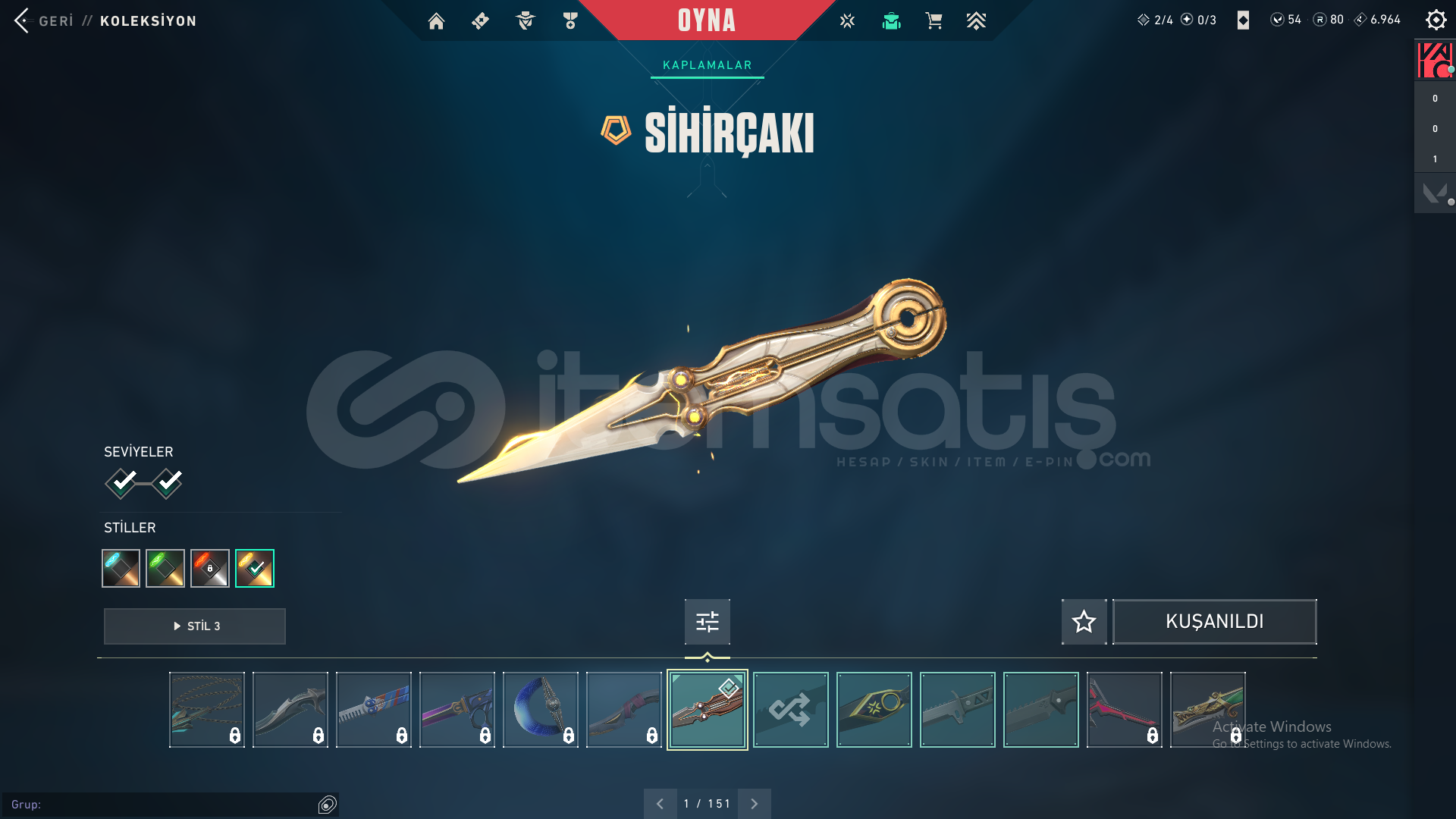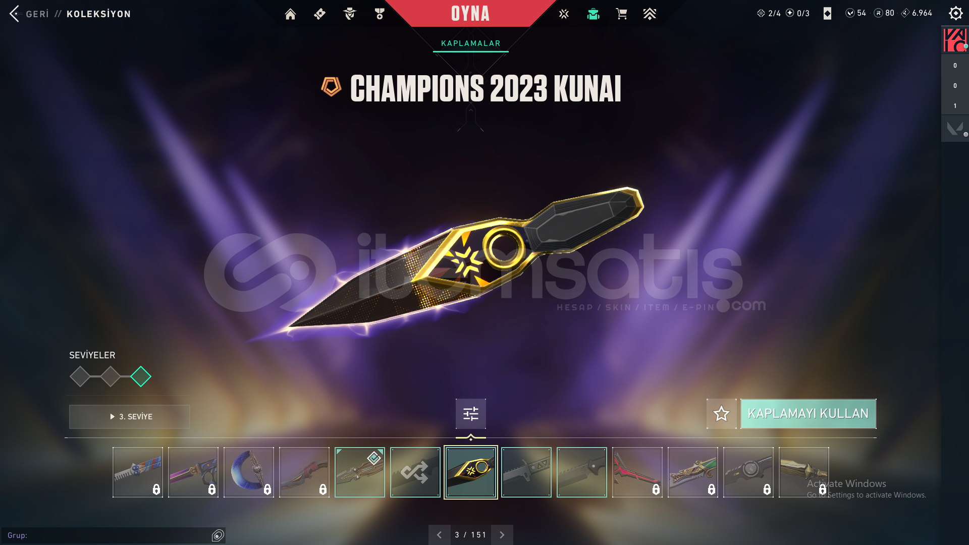 -Champions 2023 Vandal-Asil Vandal-İyon Vandal-SihirÇakı-Champions 2023 Kunai-Uzaylı Avcısı Bıçağı-Yağmacı Operatör-Yapmacı Sheriff-Oni Phantom-Altşehir PhantomHesap 97 leveldir.Fiyatt kesinlikle son fiyattır herşey hesaplıdır pazarlığa indirime kapalıdır.