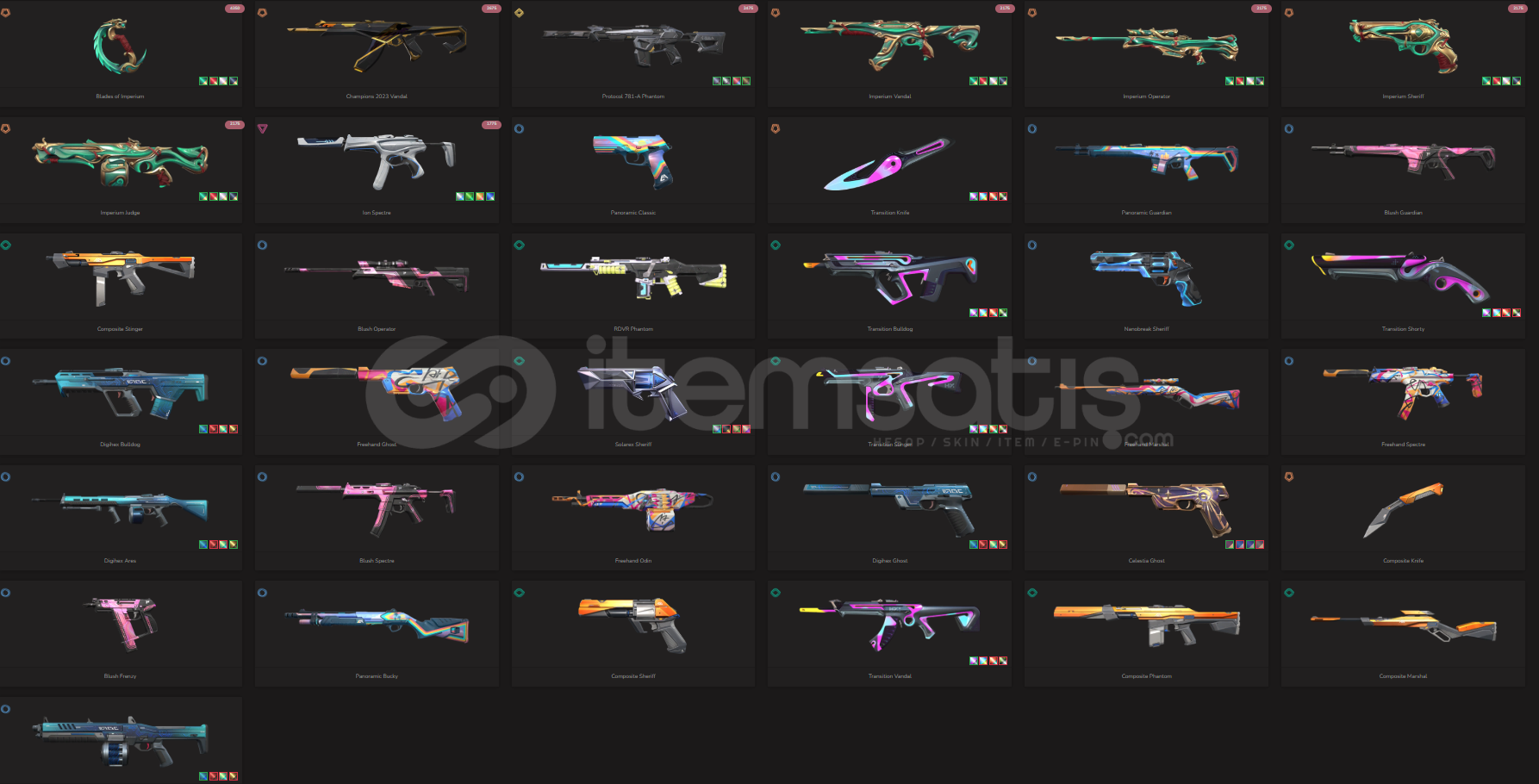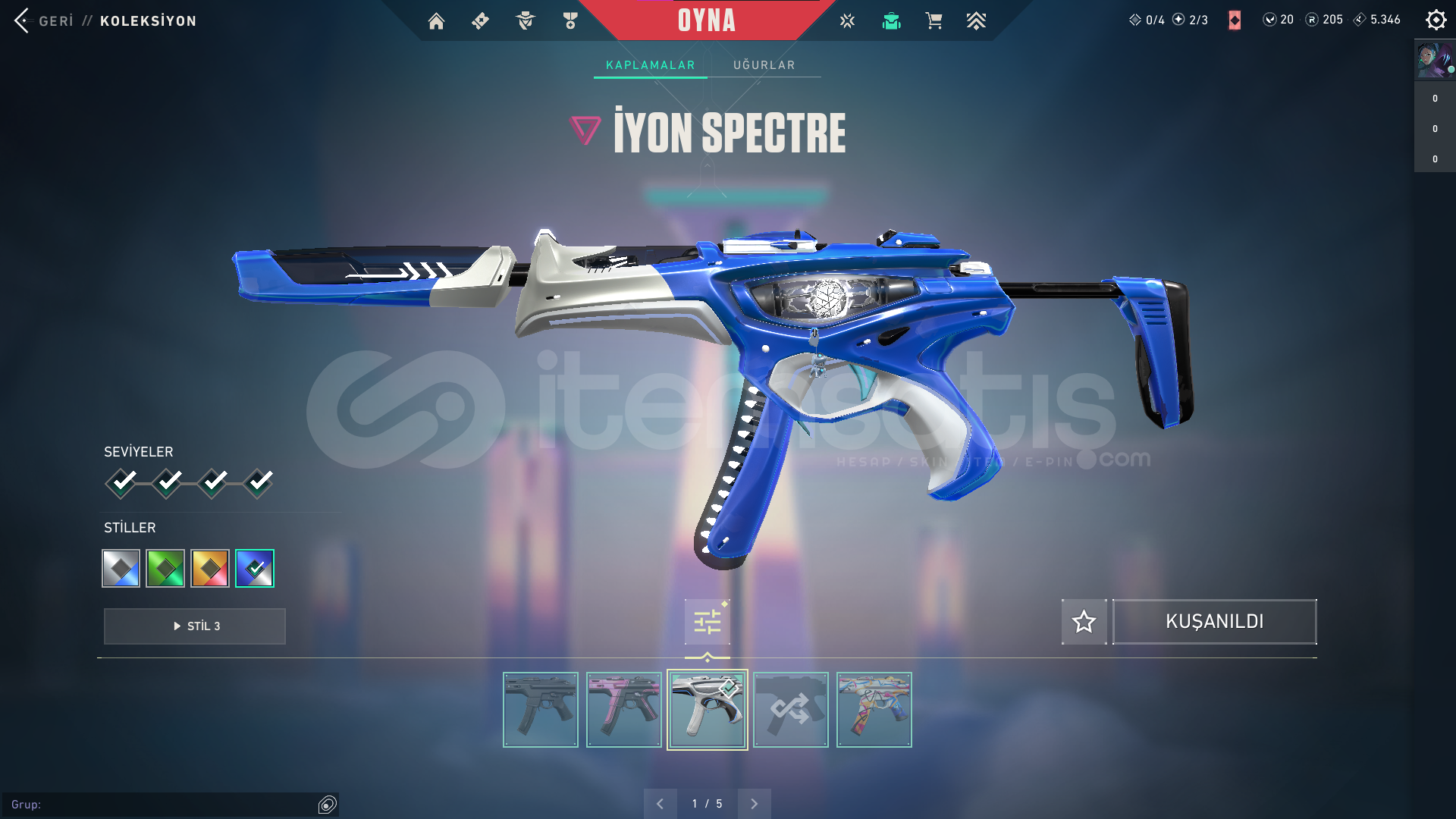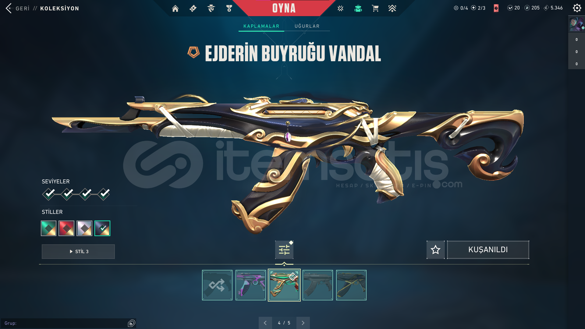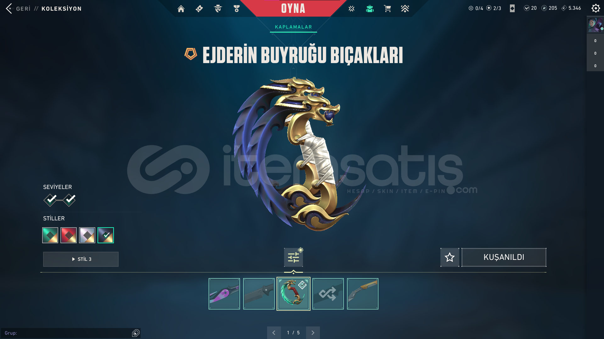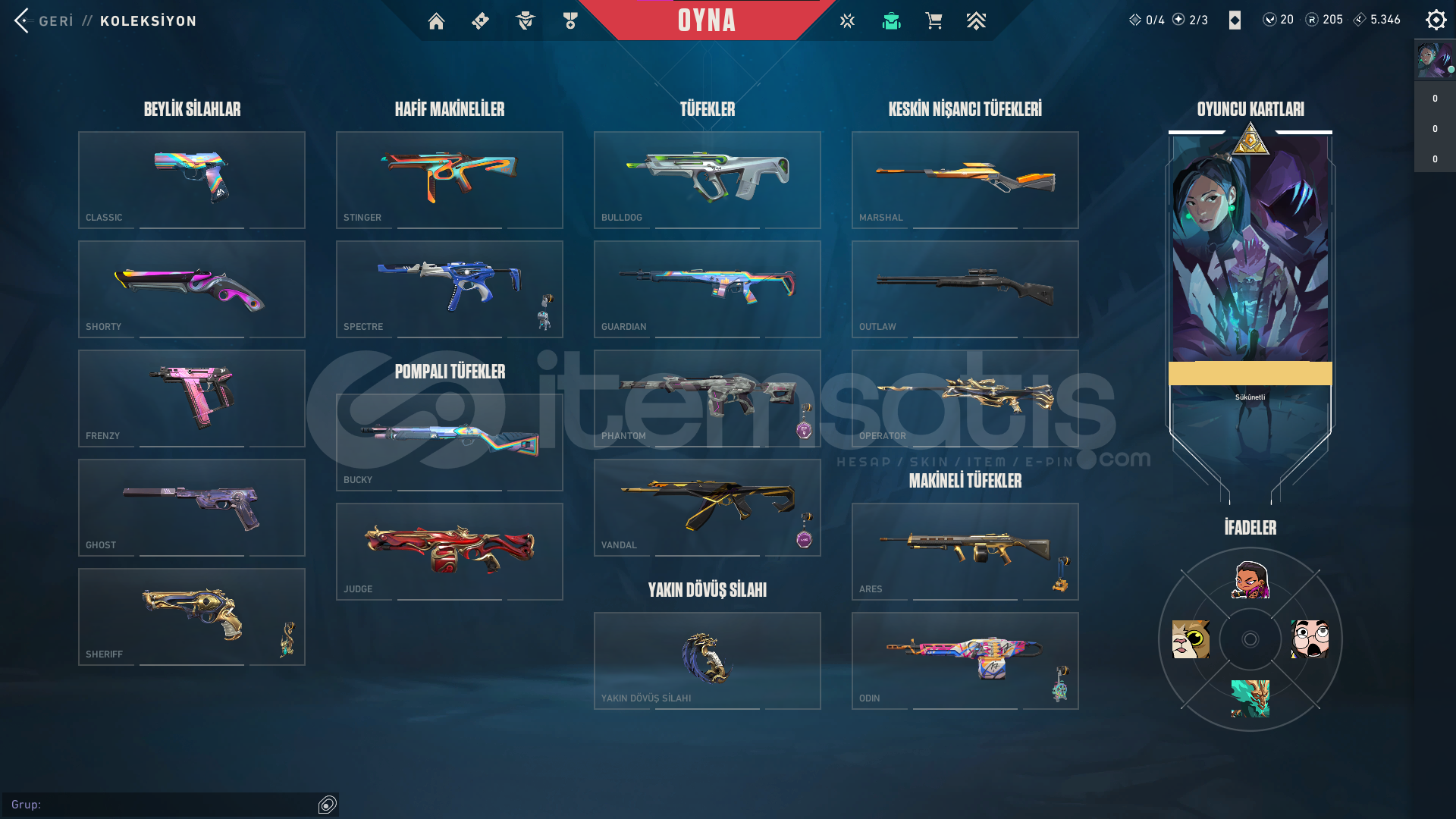 ⭐ Hesabın içinde Ejderin Buyruğu Bıçakları , Champions 2023 Vandal , Protokol 781-a Phantom , İyon Spectre , Ejderin Buyruğu Vandal , Ejderin Buyruğu Sheriff , Ejderin Buyruğu Operator , Ejderin Buyruğu Judge , Alaşım Bıçak ve Devinim Bıçağı gibi toplamda 37 skin bulunmaktadır.