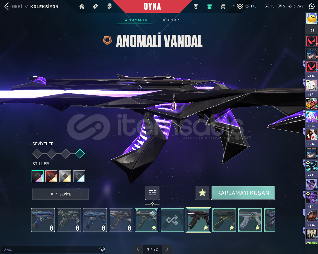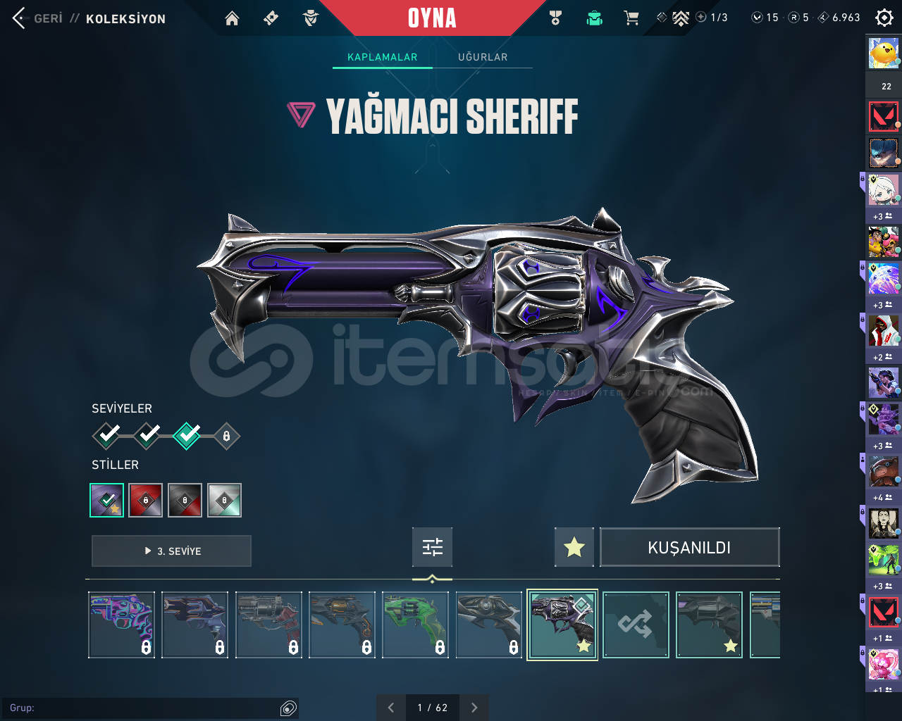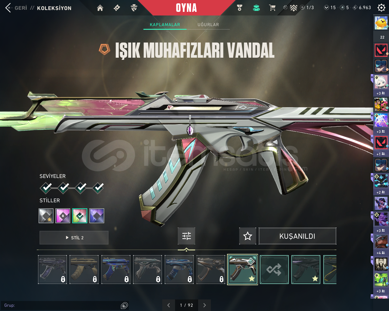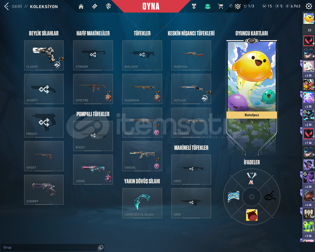 Battle pass dısı 20 skin vardırHesaba toplam 12k yatırılmıstırVct classic Ozel harekat ghostYagmacı seri tetik ve anomali sheriffzifir ve seri tetik marshallyıldız belası outlawYagmacı operatoroni ve yıldız belası guardianozel harekat spectraozel harekat ve yıldız belası phantom Delipop judgeIsık muhafızı evori anomali ve champions 2023 vandalVct karambit Yıldız Parcalayan