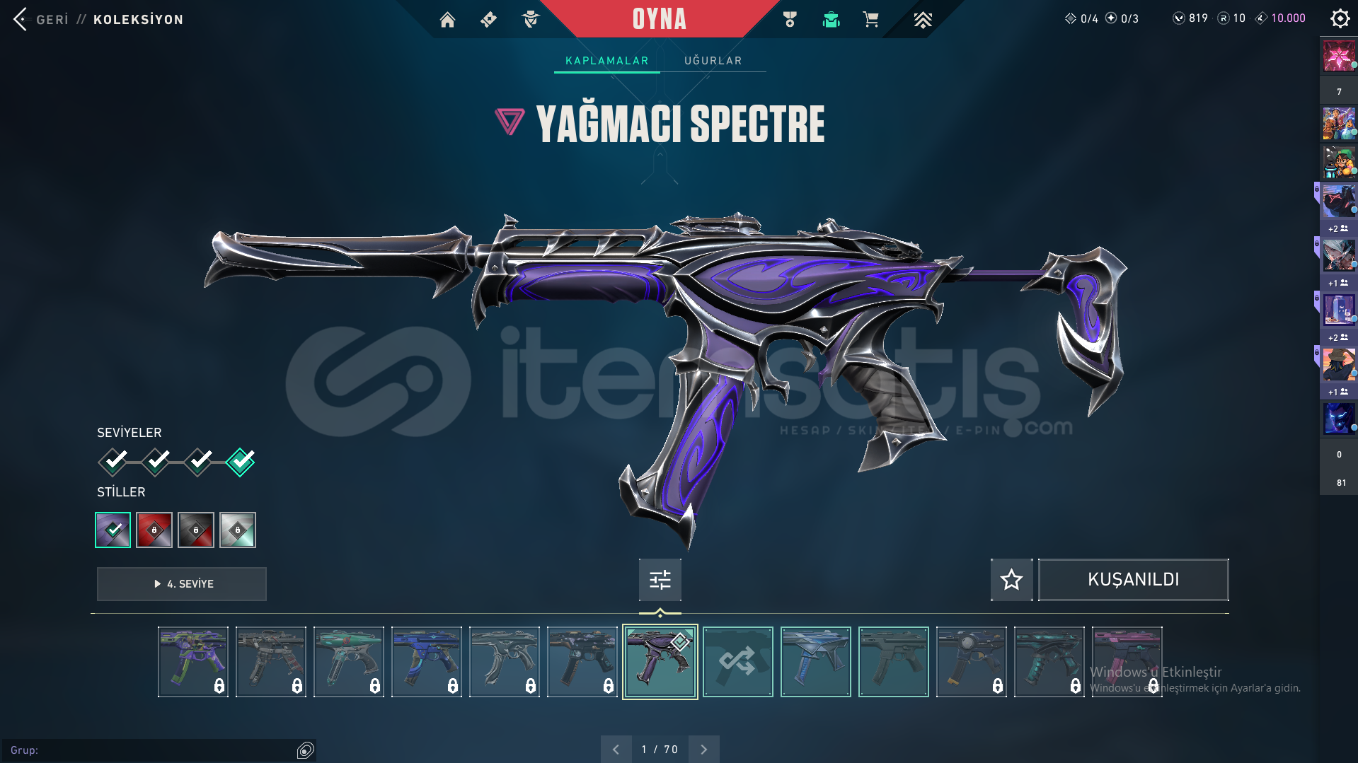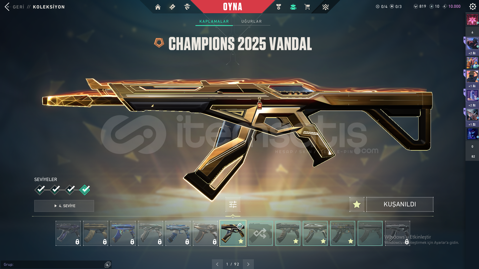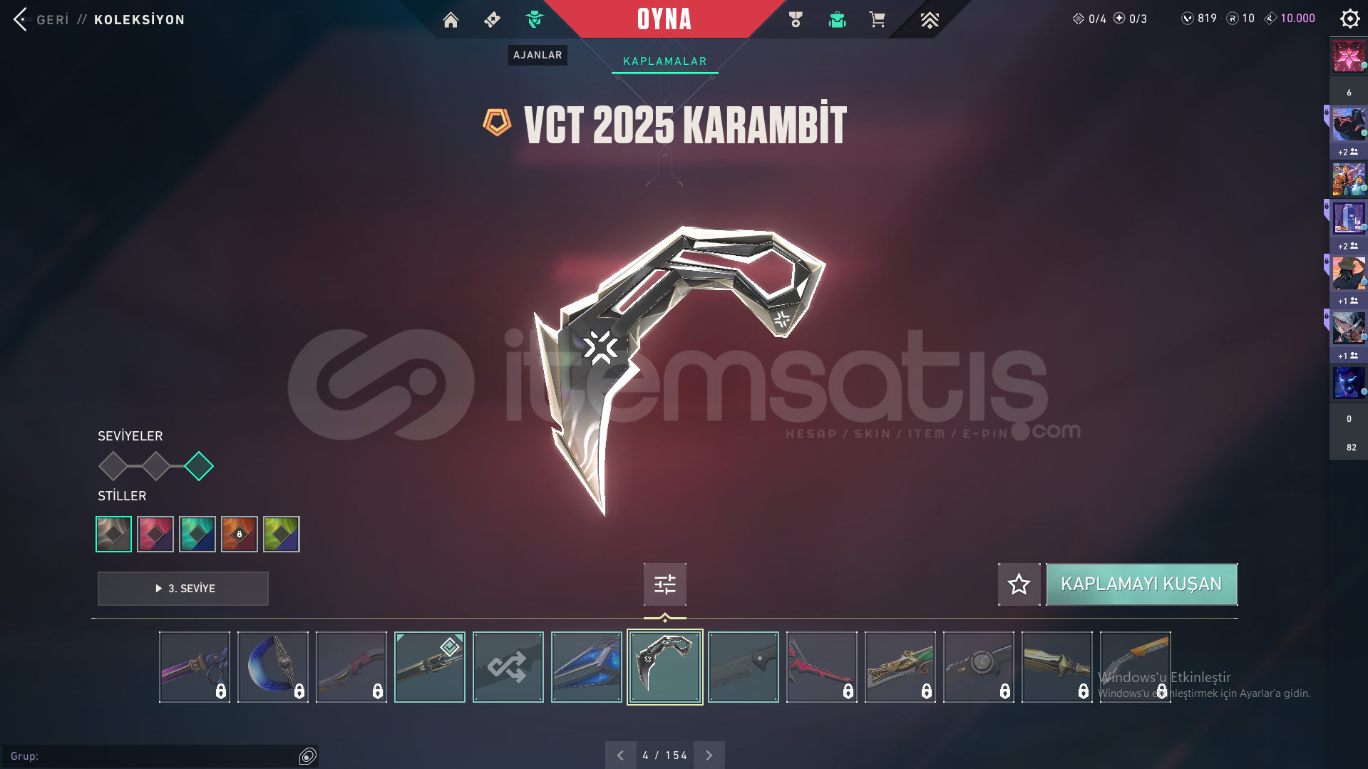 Hesapta bolca skin mevcuttur. Yaklaşık 1000vp daha vardır hesapta.Skinler,-2025 Champions Vandal-Faz Korucu Vandal-Kaos Vandal-Işık Muhafızı Vandal-Yağmacı Phantom-Yağmacı Spectre-Asil Guardian-Aemondor Buldogg-Aeomondor Sheriff-Shirpunk Ghost-Sır Çiçeği Operatör -2025 Champions Kelebek-2025 Vct Karambit
