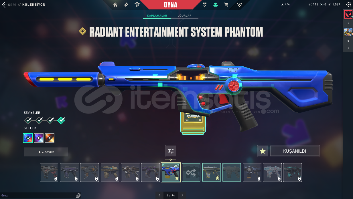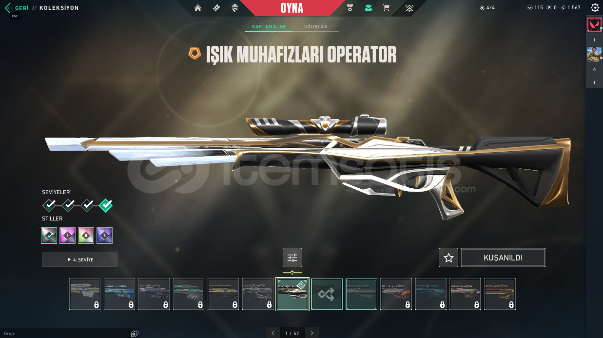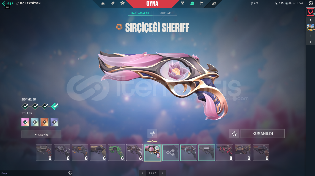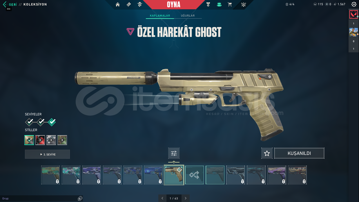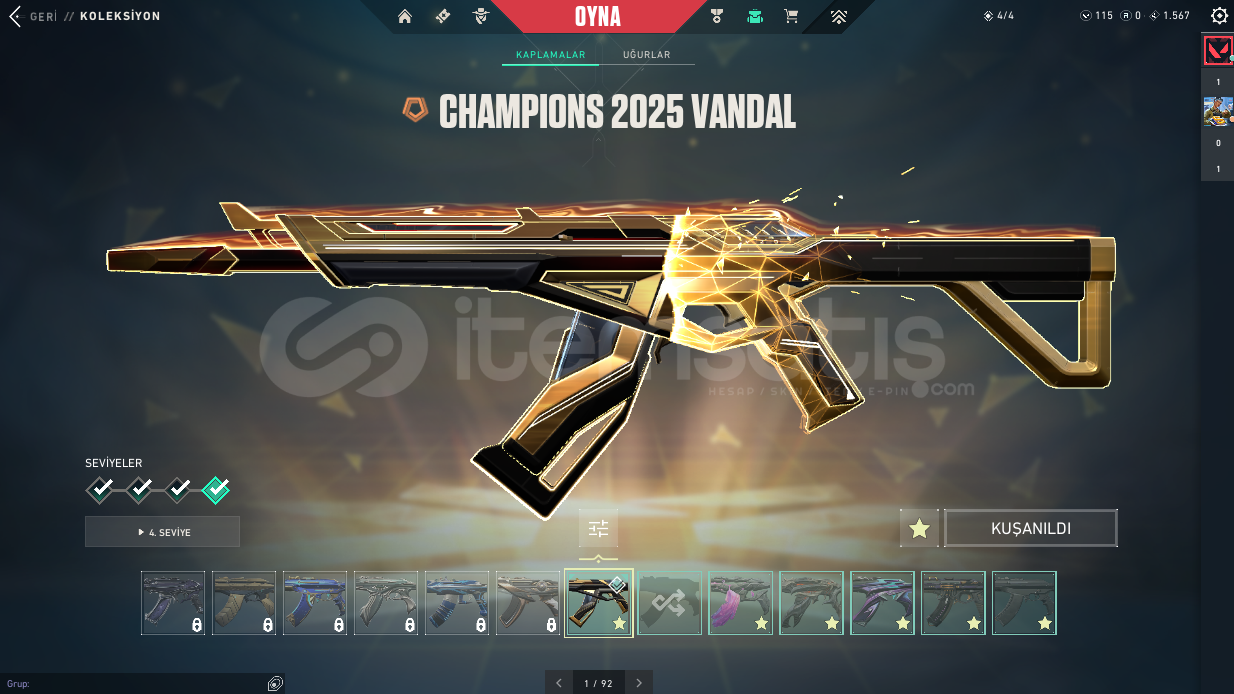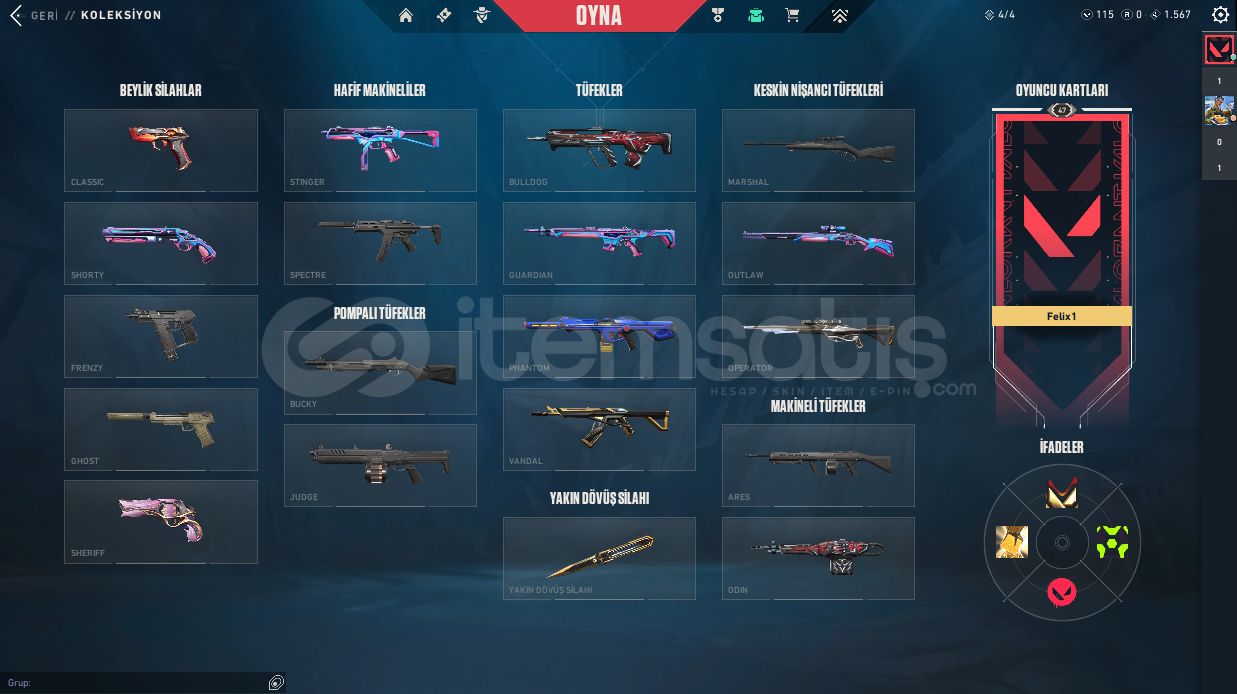 ⭐ Hesapta Champions 25 Kelebek Champions 25 Vandal Kaos Vandal Felaketin Kalbi Vandal Dolmira`nın İntikamı Vandal Radiant Entertainment System Phantom Asil Phantom Sır Çiçeği Sheriff Özel Harekat Ghost Işık Muhafızı Operator Galaksi Muhafızı Classıc Atlas Classıc Kalp Avcısı Shorty Kalp Avcısı Stınger Kırık Kalp Bulldog Kalp Avcısı Guardıan Kalp Avcısı Outlaw Kırık Kalp Odın gibi skinlerle toplamda 20 skin bulunmaktadır.