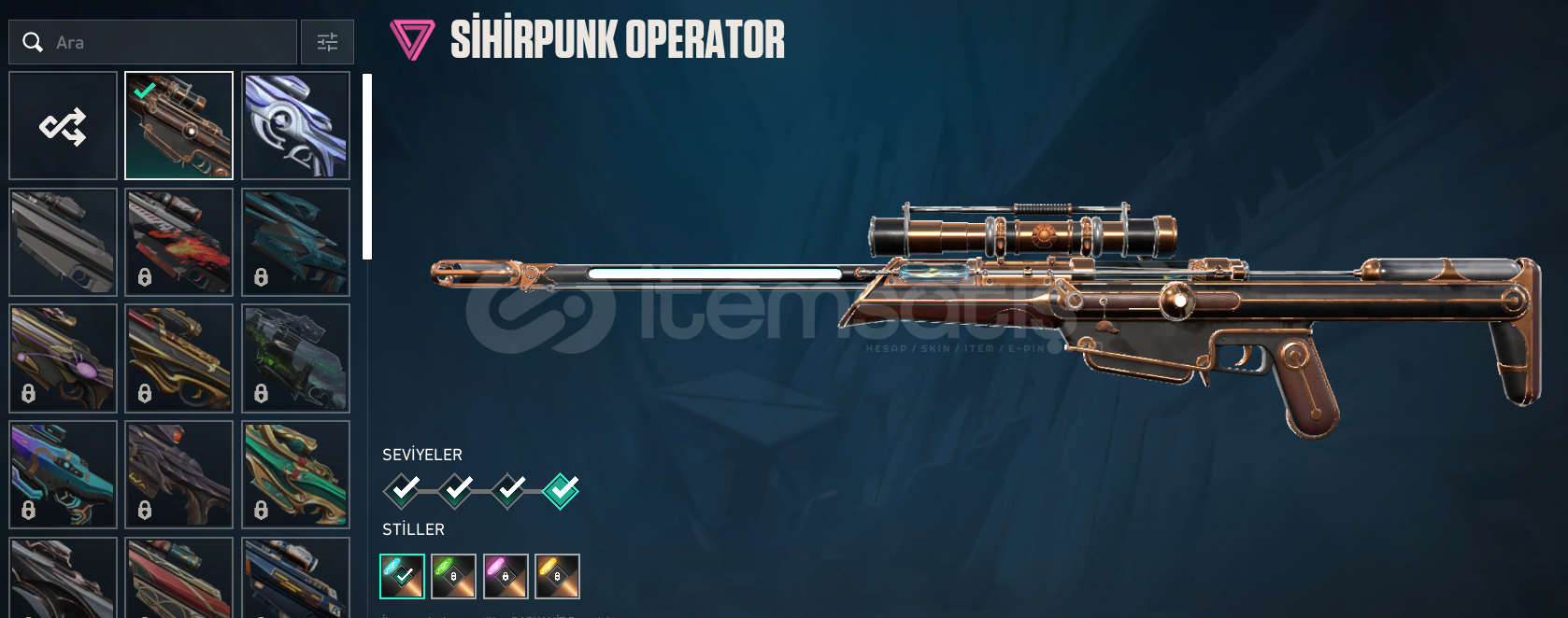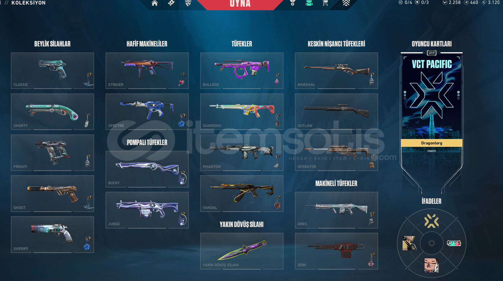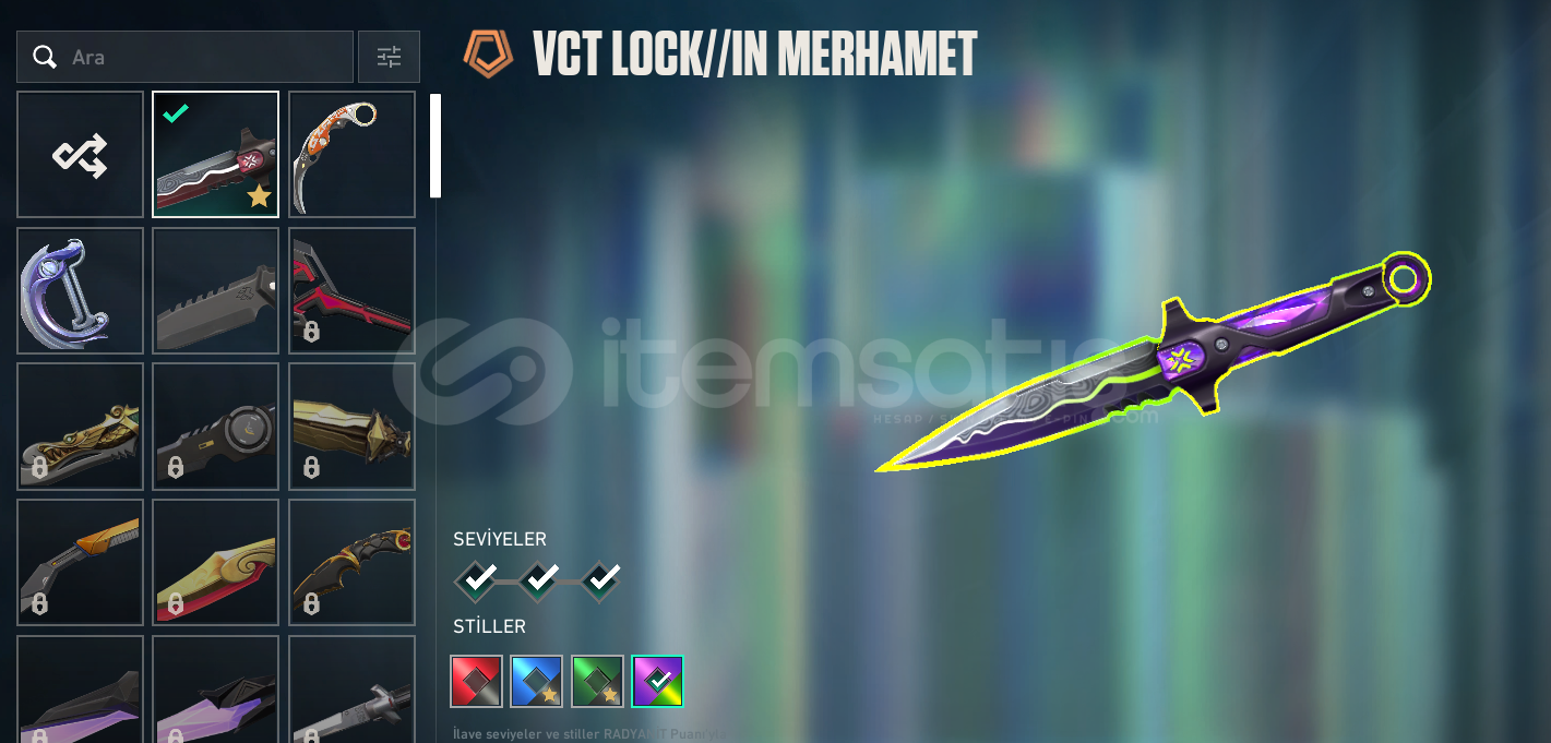VCT LOCK//IN Bıçağı (Tüm kaplamaları açık ve Son Seviye.),2 adet Battle Pass Bıçağı.Sihirpunk Ghost (Son Seviye.),2 Adet Battle Pass Ghost.Seri Tetik Sherrif (2 Kaplaması açık ve Son Seviye.),2 Adet Battle Pass Sherrif.2 Adet Battle Pass Shorty.3 Adet Battle Pass Frenzy.2 Adet Battle Pass Classic.İyon Spectre (3 Kaplaması ve Son Seviye.),3 Adet Battle Pass Spectre.2 Adet Battle Pass Stınger.2 Adet B...