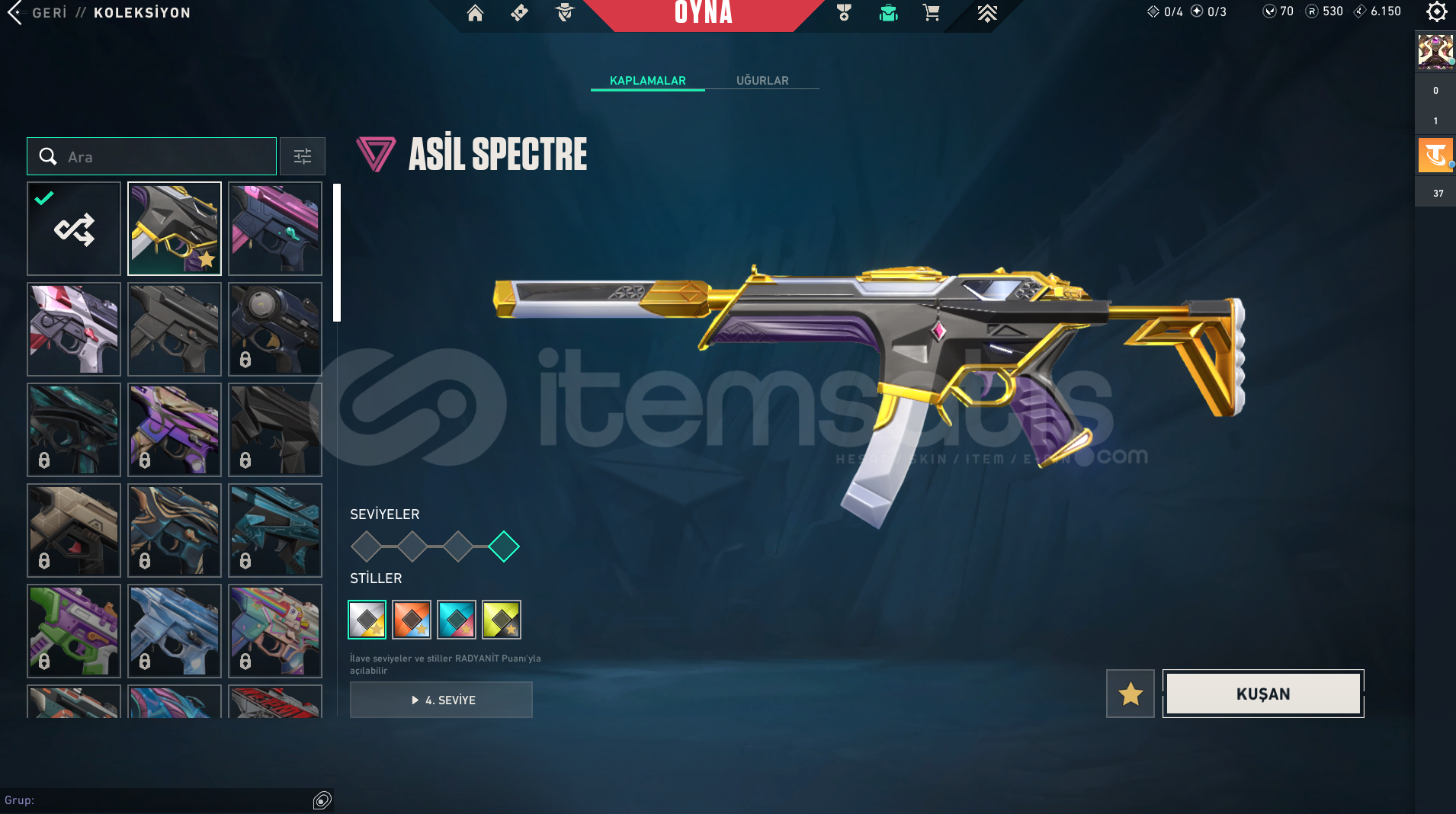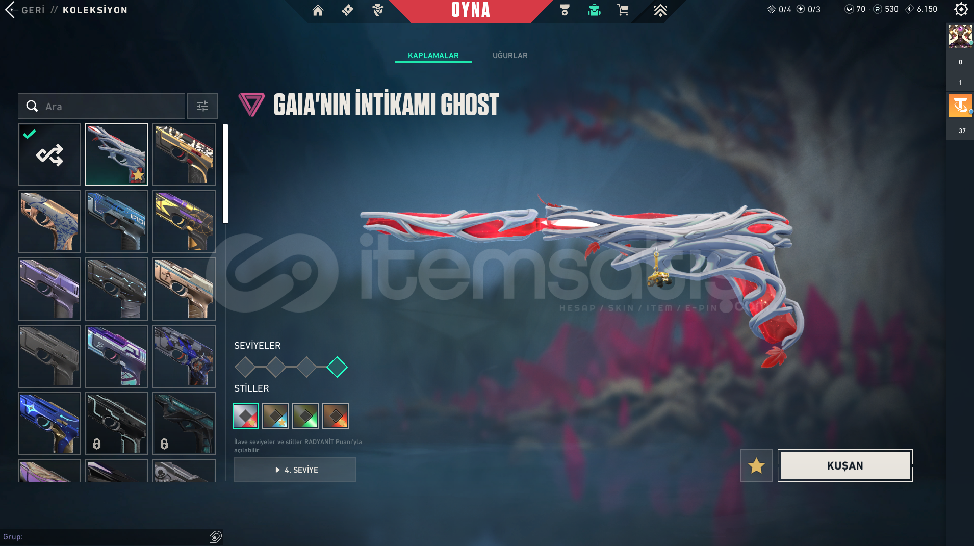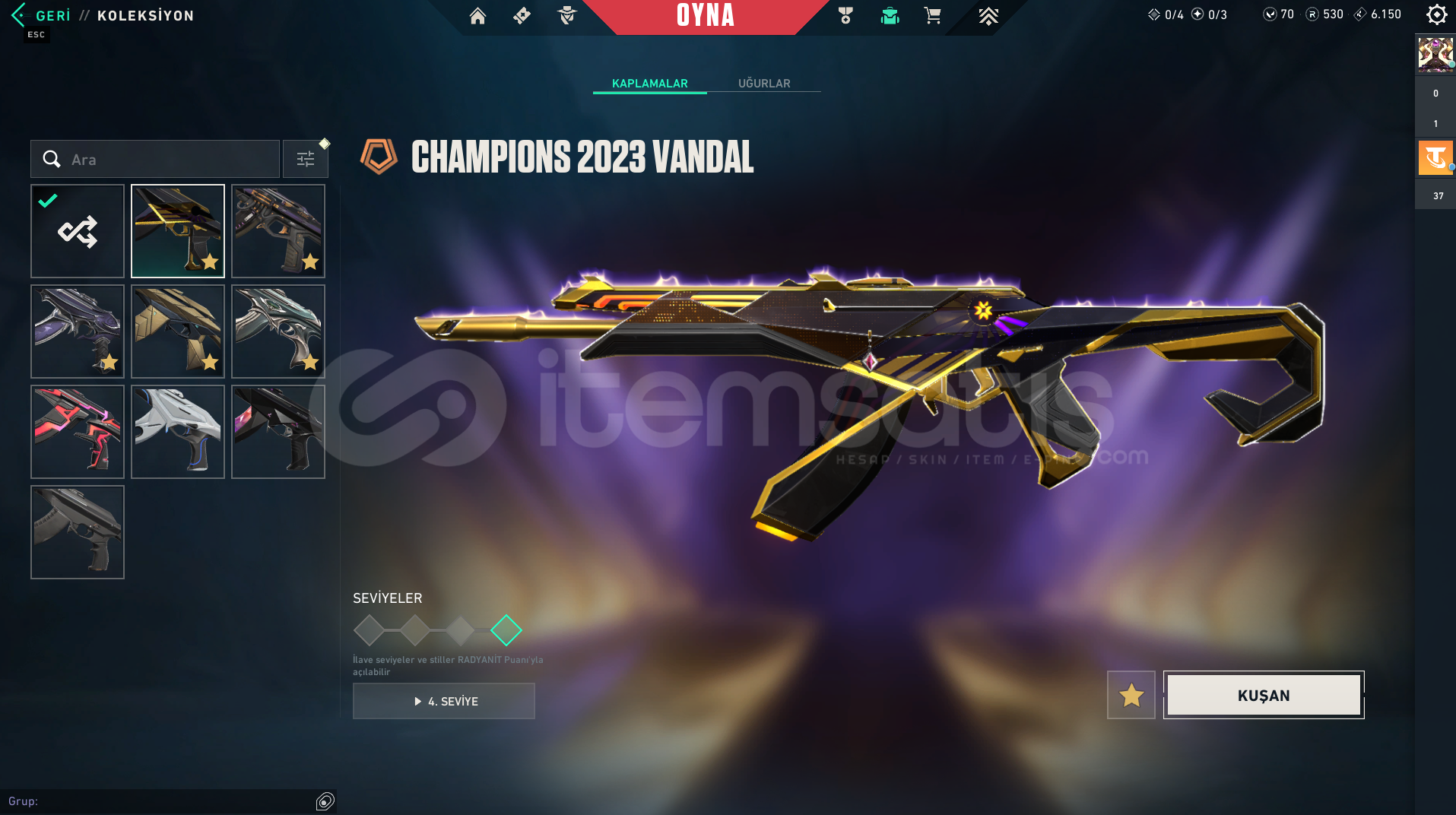 Vandal : Champıons 2023 vandal, Kaousun Başlangıcı Vandal, Yağmacı Vandal, Yıldız Belası Vandal, Yitik Vandal, İyon VandalPhantom : Protokol 781-A Phantom, Asil phantom, İyon Phantom, ONI PhantomGuardian : Fatih GuardianSpectre : Asil sprectreSheriff : Yağmacı şerif Ghost : GAIA'NIN İNTİKAMIBıçak : Karaborsa Kelebek, Uzaylı Avcısı, Yağmacı karambit, Asil 2.0 Karambit, + 4 tan...