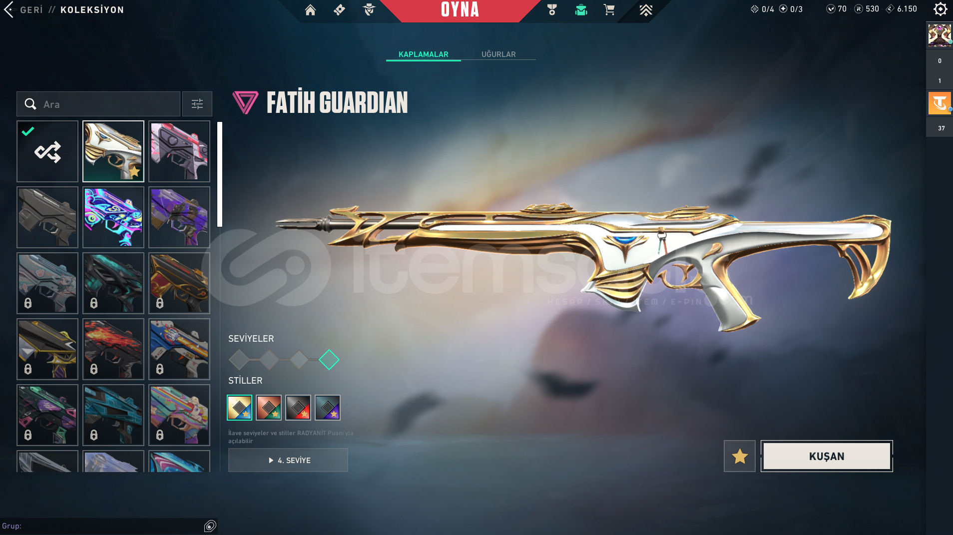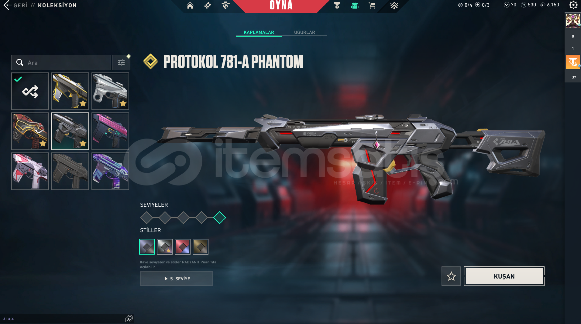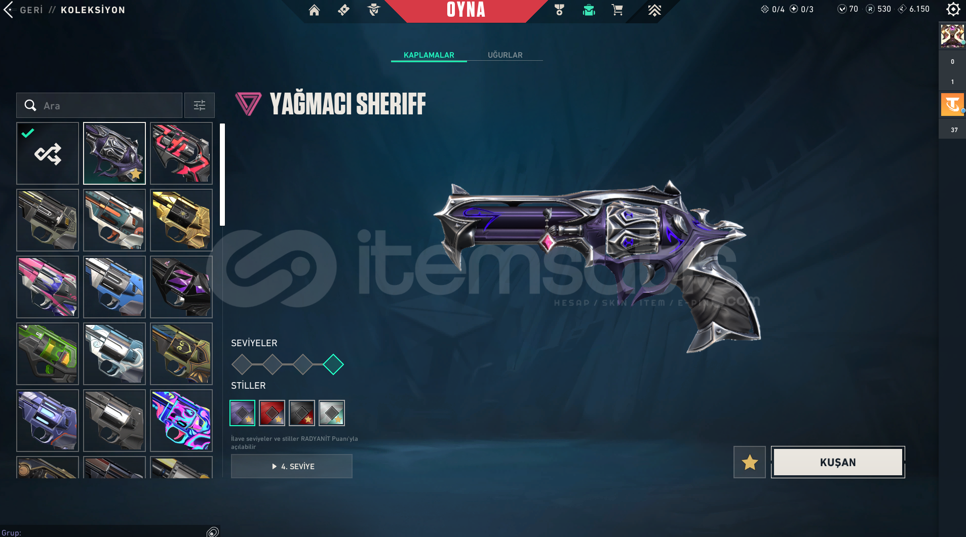 Vandal : Champıons 2023 vandal, Kaousun Başlangıcı Vandal, Yağmacı Vandal, Yıldız Belası Vandal, Yitik Vandal, İyon VandalPhantom : Protokol 781-A Phantom, Asil phantom, İyon Phantom, ONI PhantomGuardian : Fatih GuardianSpectre : Asil sprectreSheriff : Yağmacı şerif Ghost : GAIA'NIN İNTİKAMIBıçak : Karaborsa Kelebek, Uzaylı Avcısı, Yağmacı karambit, Asil 2.0 Karambit, + 4 tan...