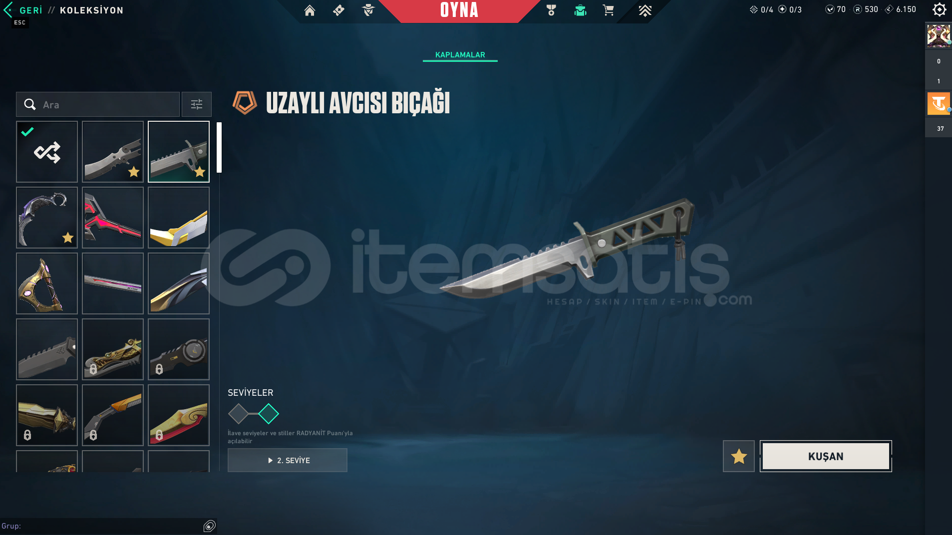 Bıçak : Karaborsa Kelebek, Uzaylı Avcısı, Yağmacı karambit, Asil 2.0 Karambit, + 4 tane battlepass bıçak