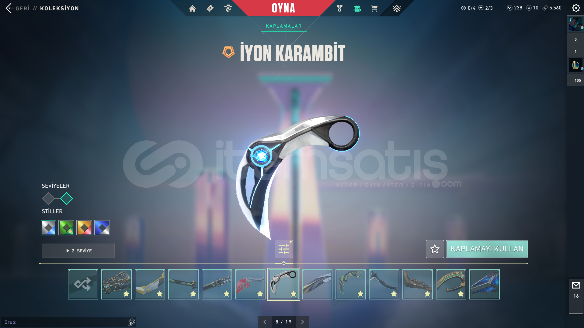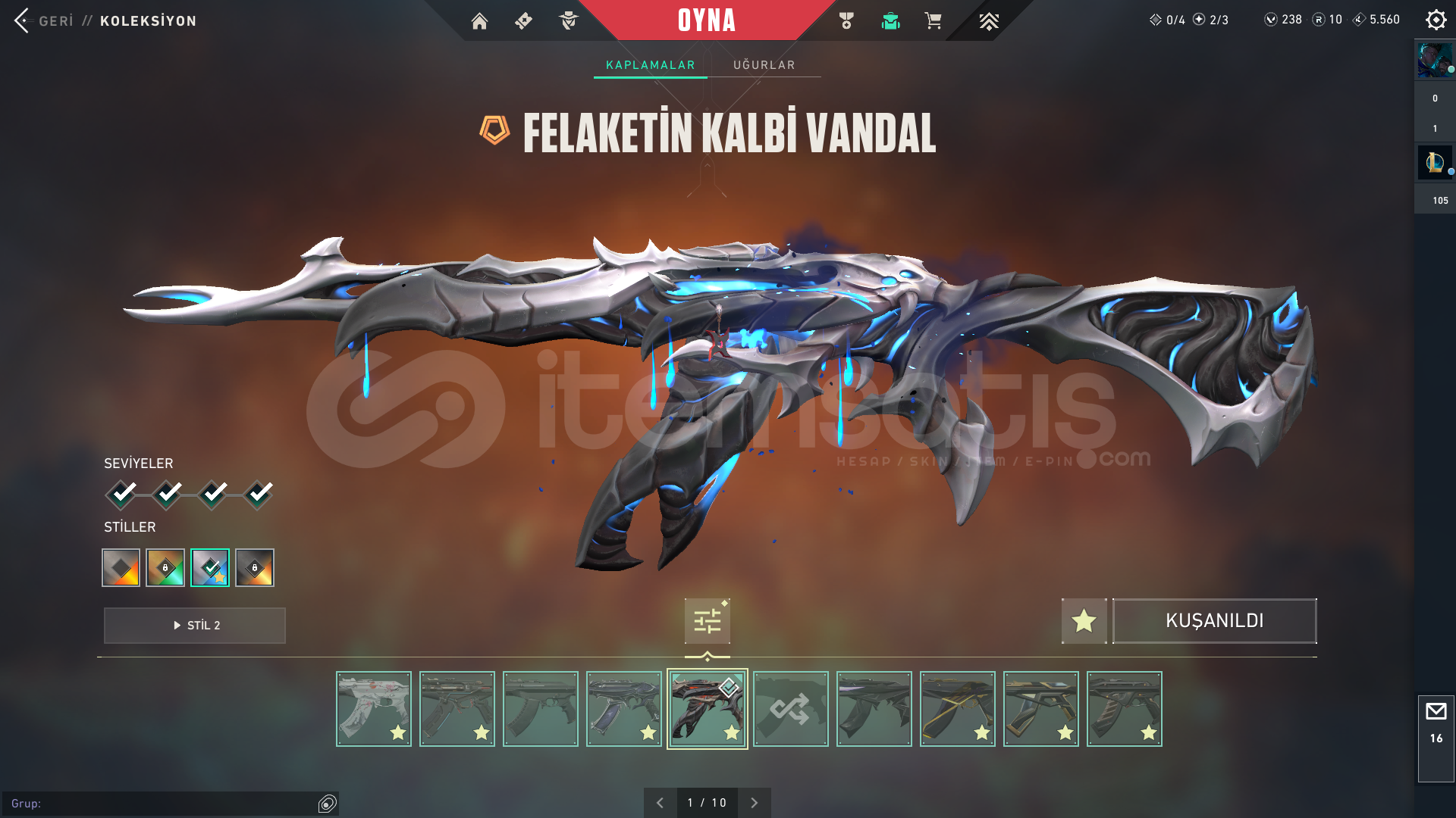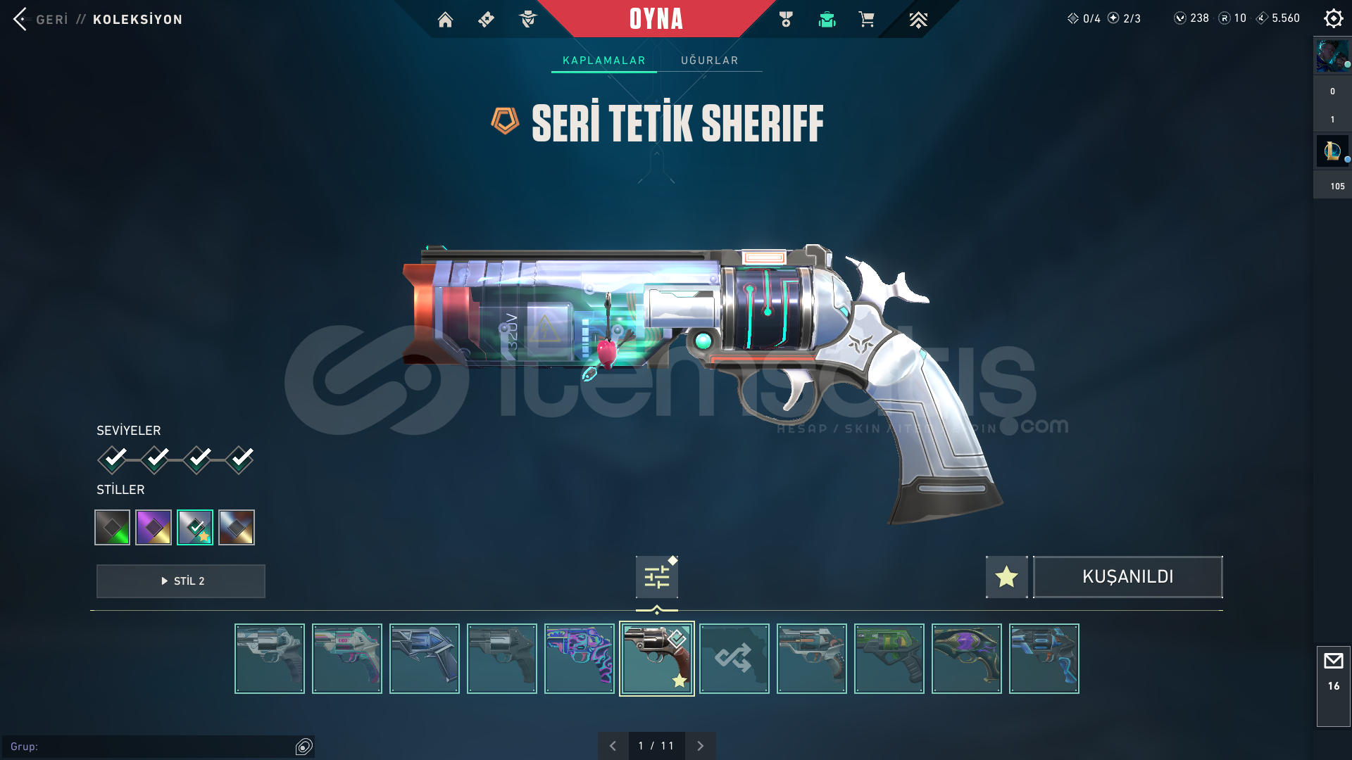 hesapta 15 tane bıçak vardır(+2 BP TOPLAM 17), 8 vandal, 3 phantom, 1 sheriff, 1 operatör,1 spectre, 1 bucky, 1 clasic,1 guardian, 1 shorty vardır outlaw hariç her silahtada bp skinleri mevcuttur